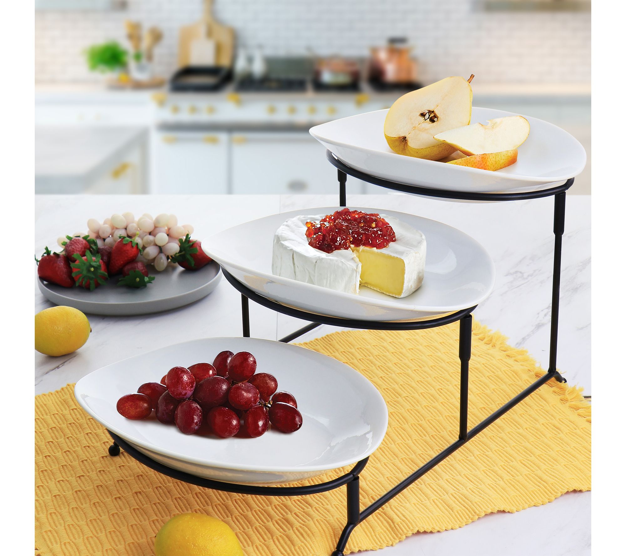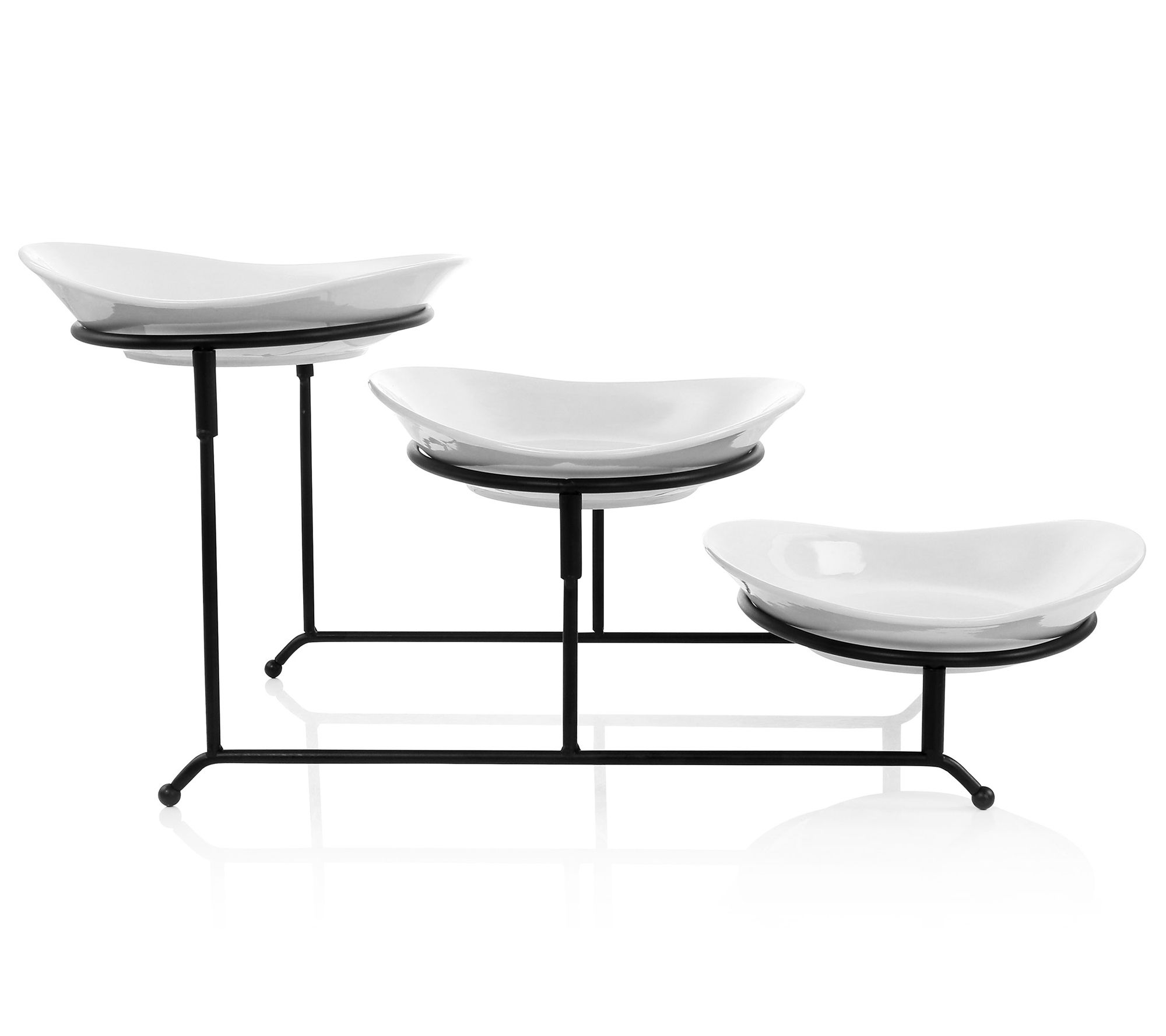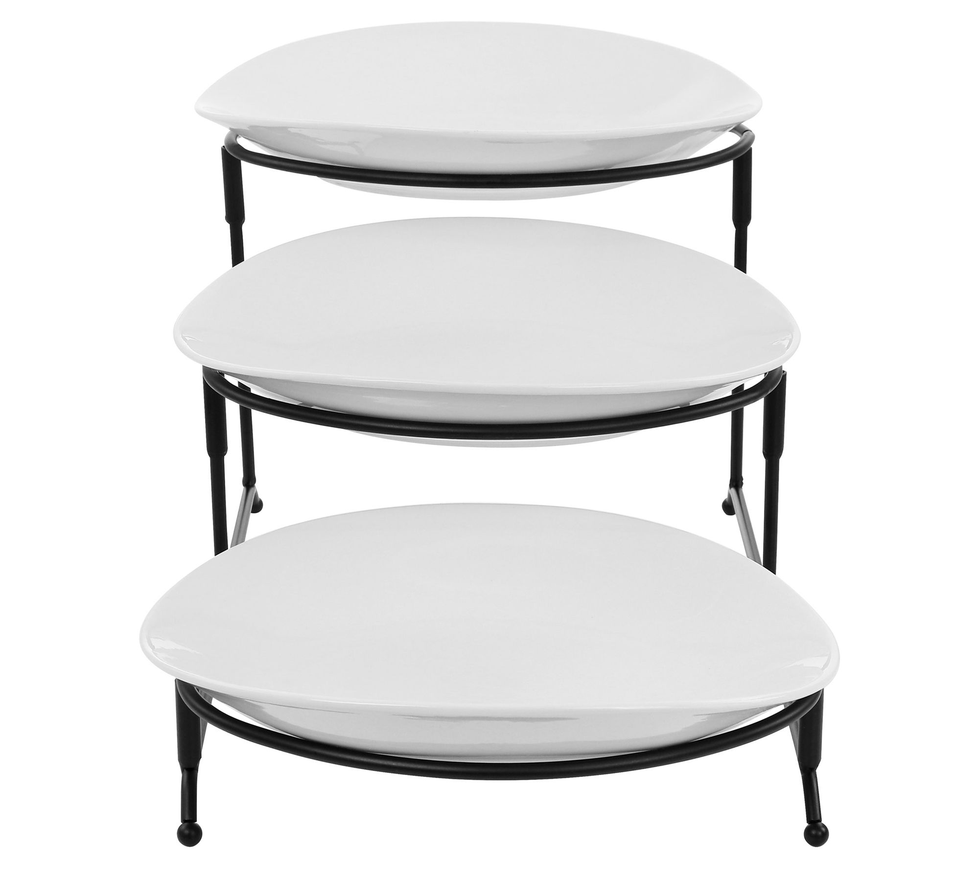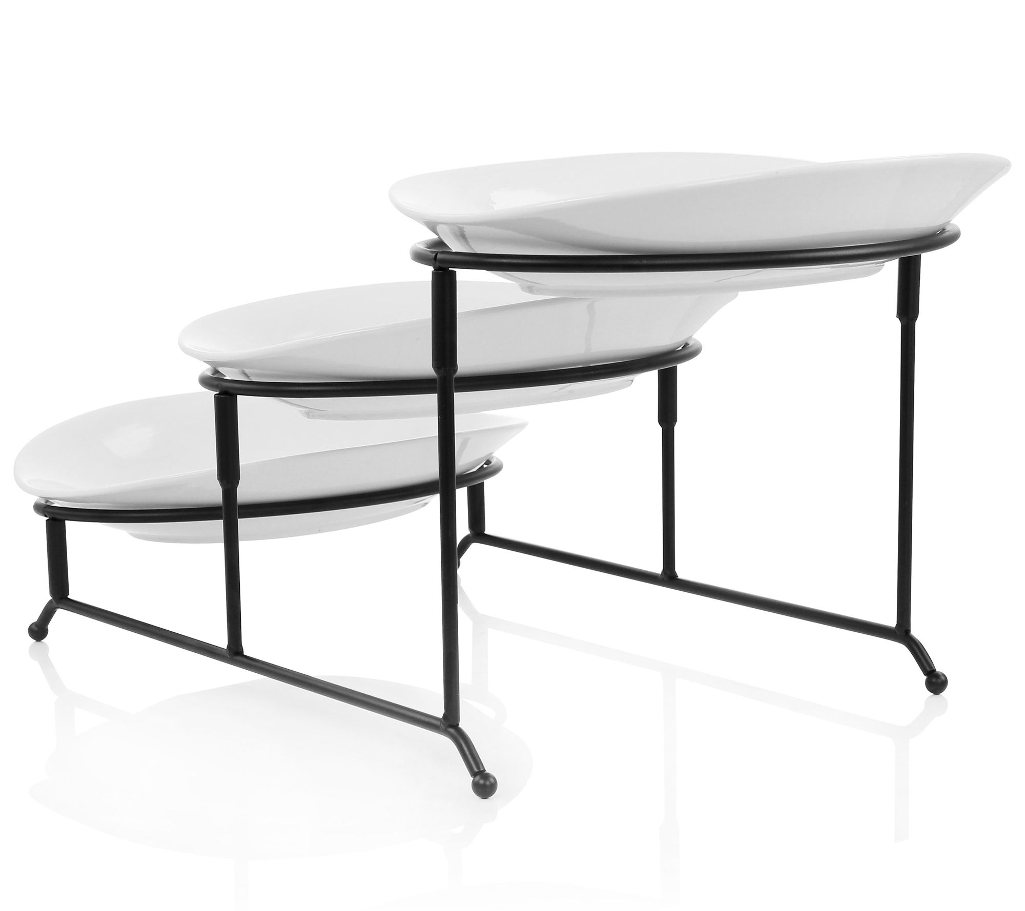 • Includes three porcelain oval serving plates and four-piece metal tier rack