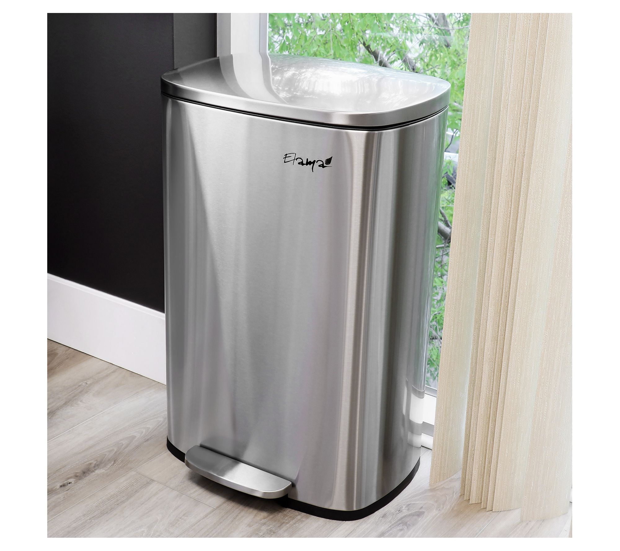 Elevate your home's cleanliness and style with the Elama stainless steel trash bin. The sleek matte silver finish and no-touch pedal open function blend functionality with design, making it a perfect addition to any kitchen or home space. From Elama.