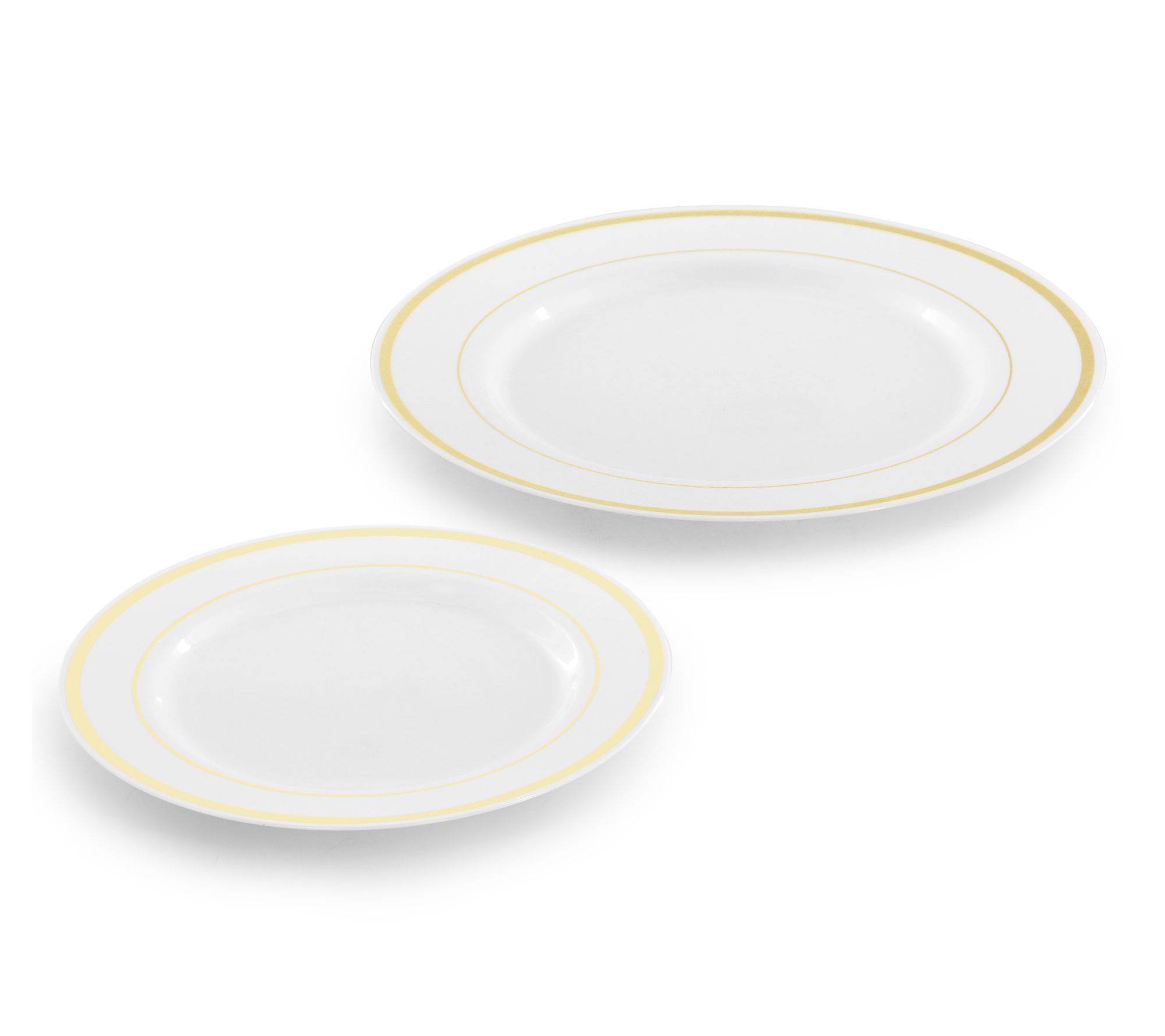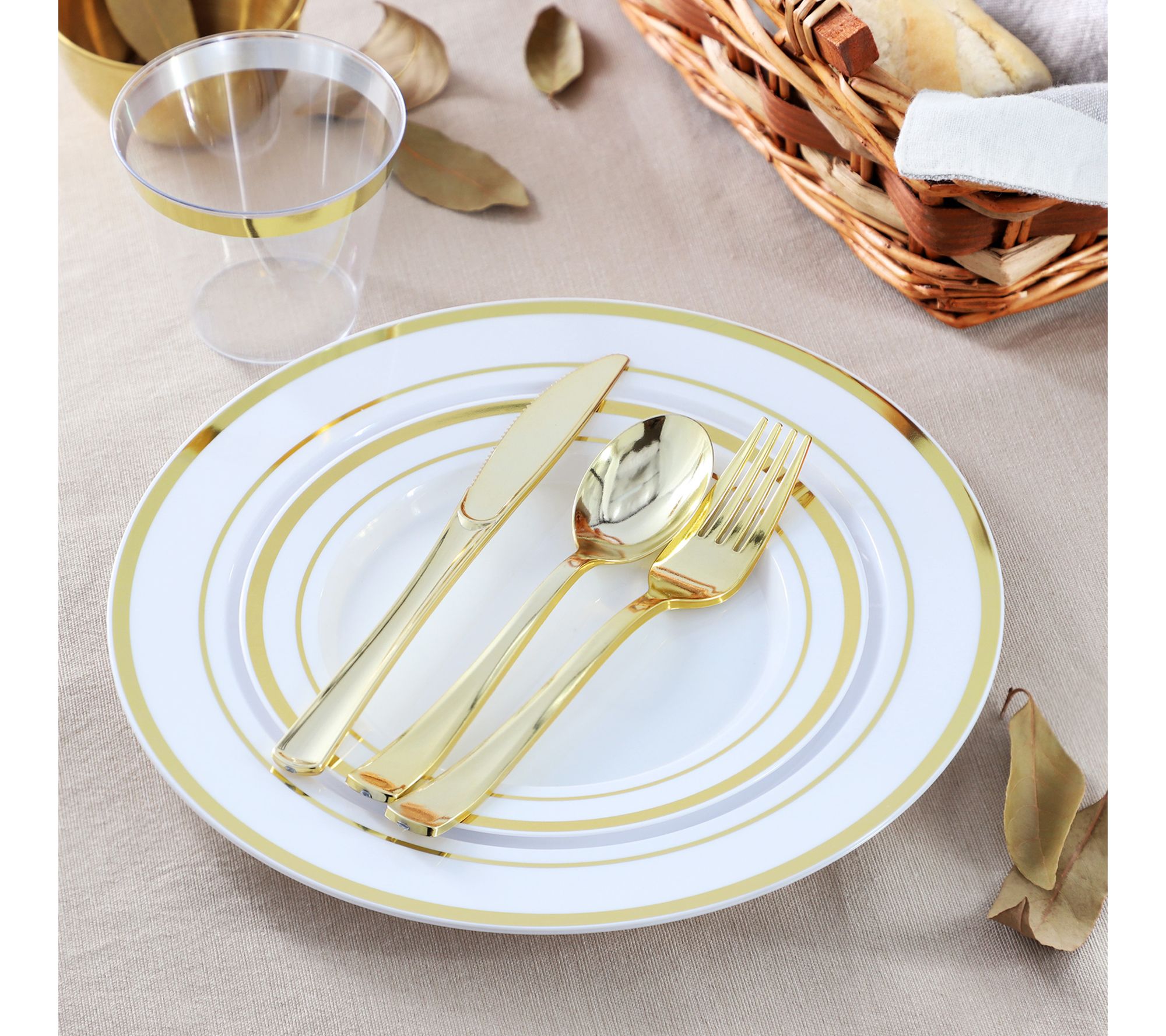Set the scene for your next celebration with this disposable dinnerware set, blending crisp white with a touch of goldtone trim for instant elegance at weddings, parties, or family gatherings. Designed to serve up to 100 guests, this convenient collection makes hosting large groups a breeze with matching plates, cutlery, and cups that make both setup and cleanup effortless. From Elama.