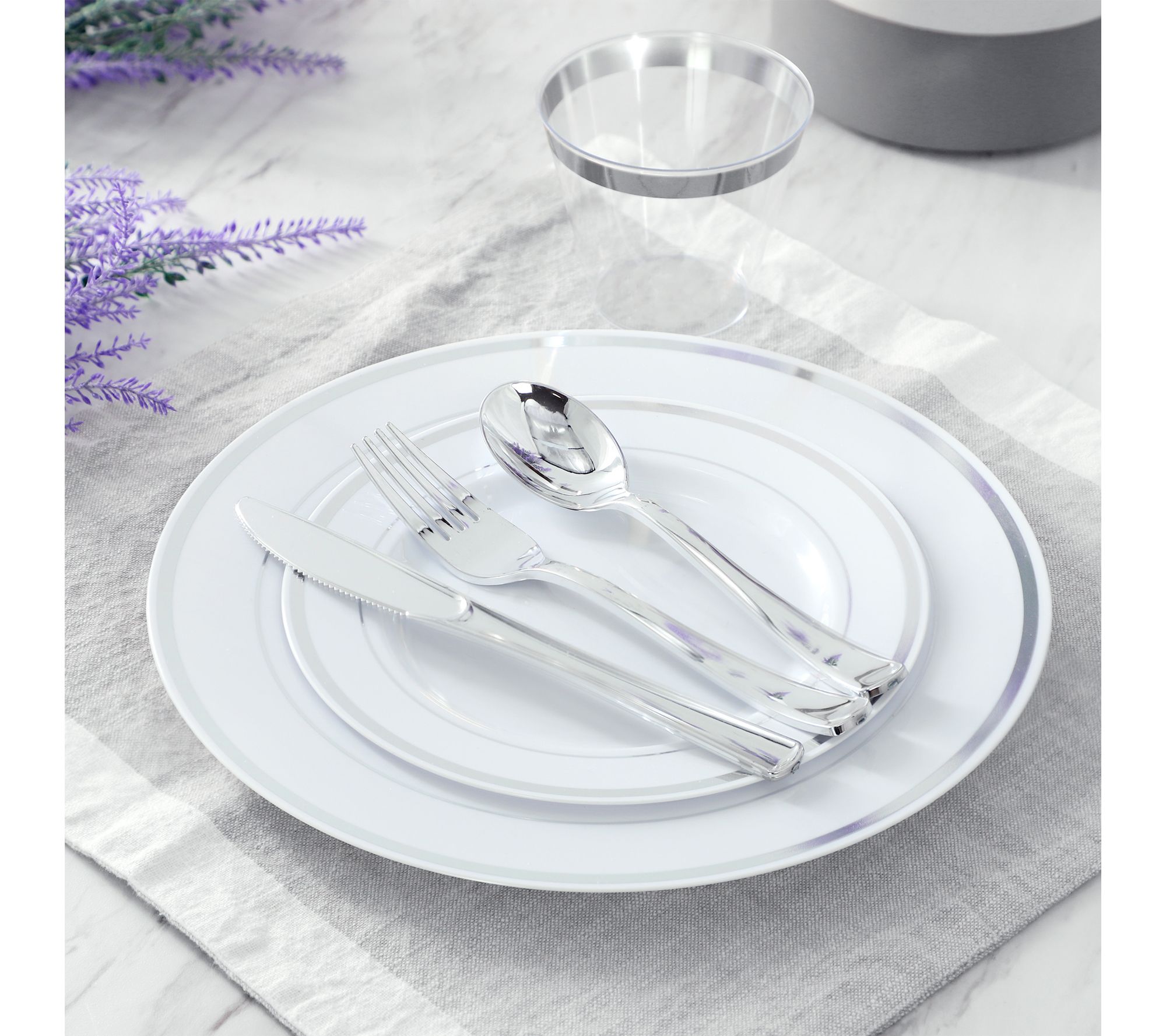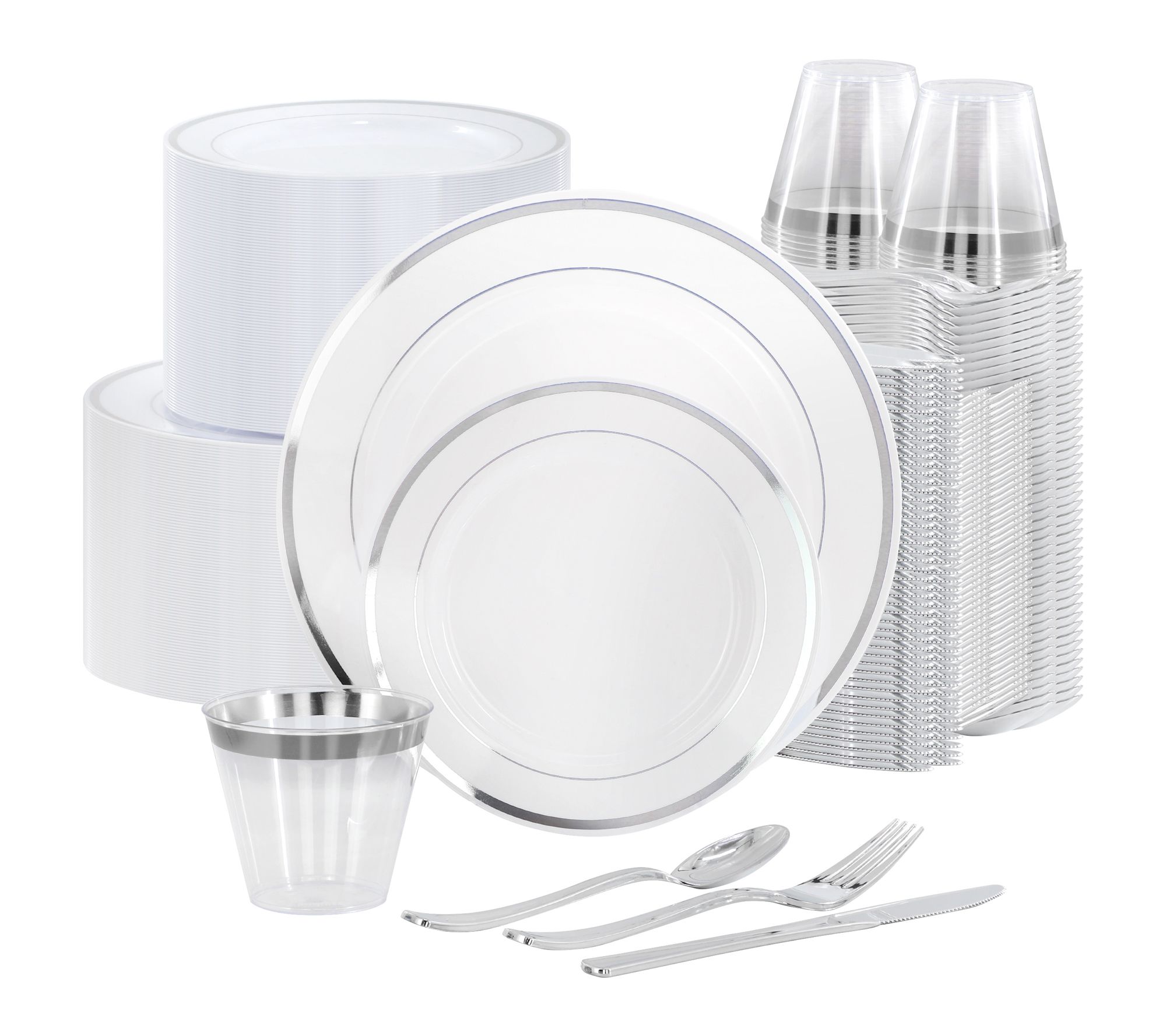 Hosting a crowd for a wedding, milestone birthday, or holiday gathering? This 600-piece disposable dinnerware set delivers an effortless way to serve up to 100 guests with style -- each plate, cup, and utensil features a chic white design with silvertone detailing that adds a touch of sophistication to your event. Elegant, convenient, and easy to clean up after the celebration. From Elama.