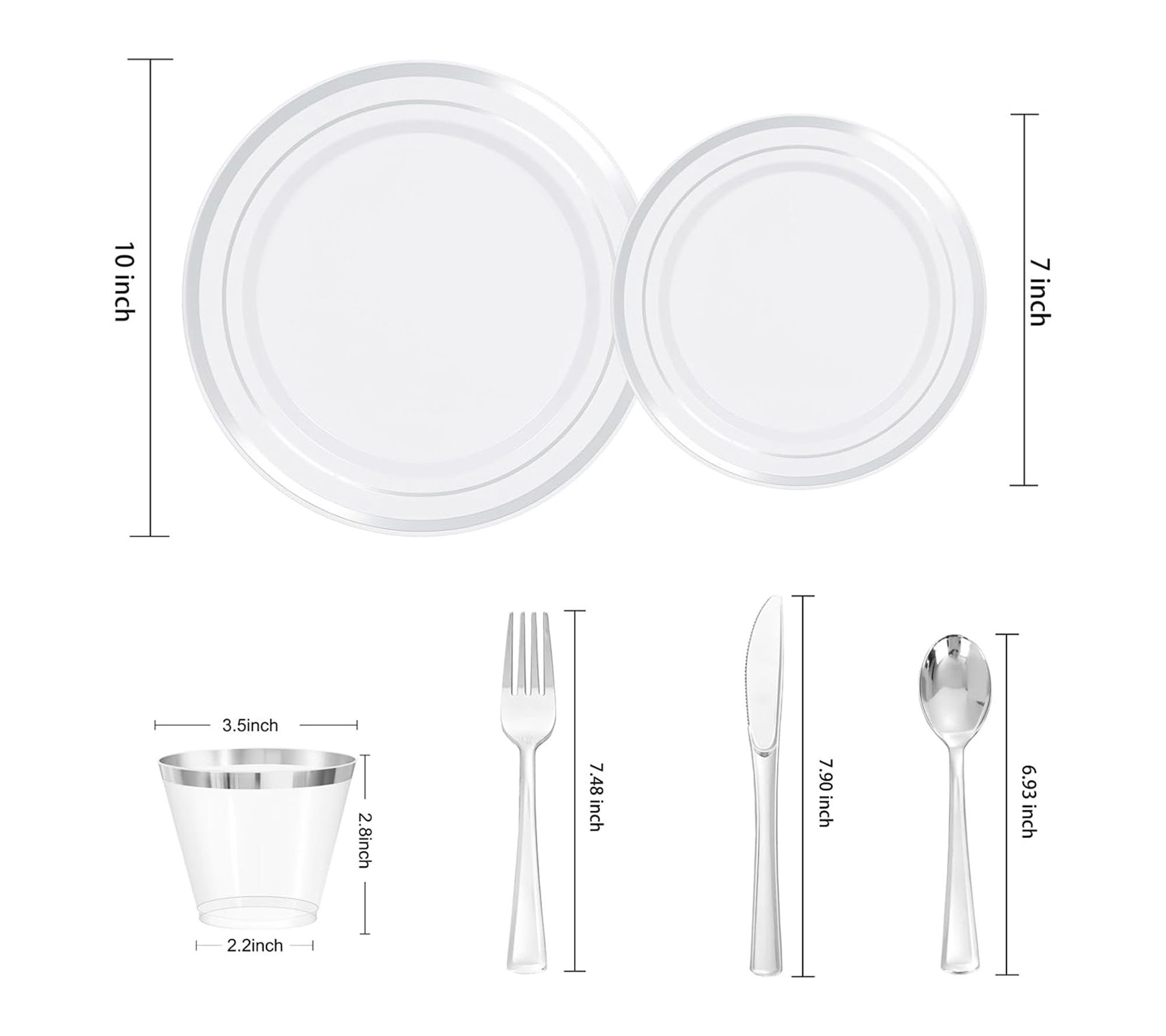 • Includes 100 10" dinner plates, 100 7" salad plates, 100 forks, 100 spoons, 100 knives, and 100 9-oz cups