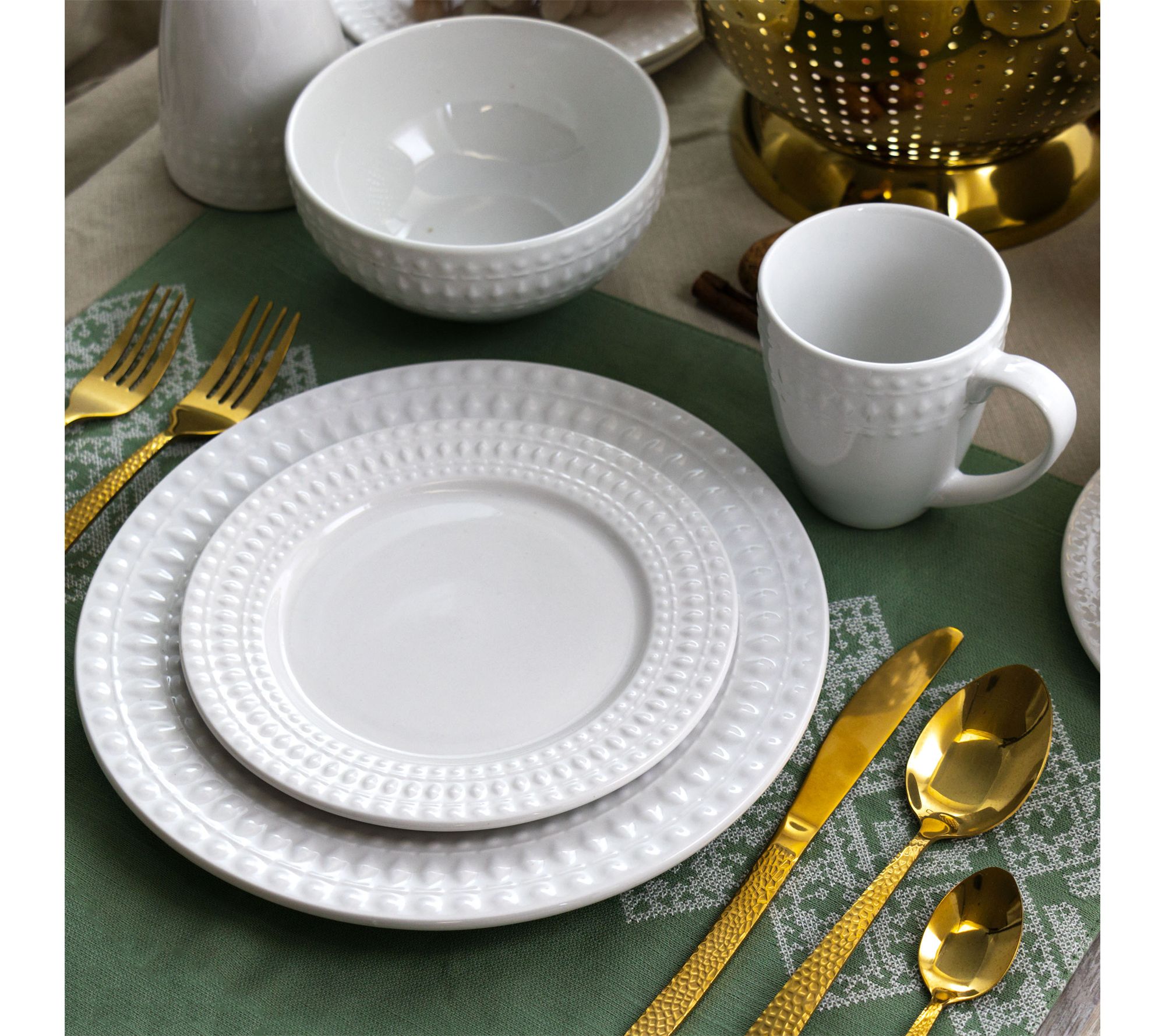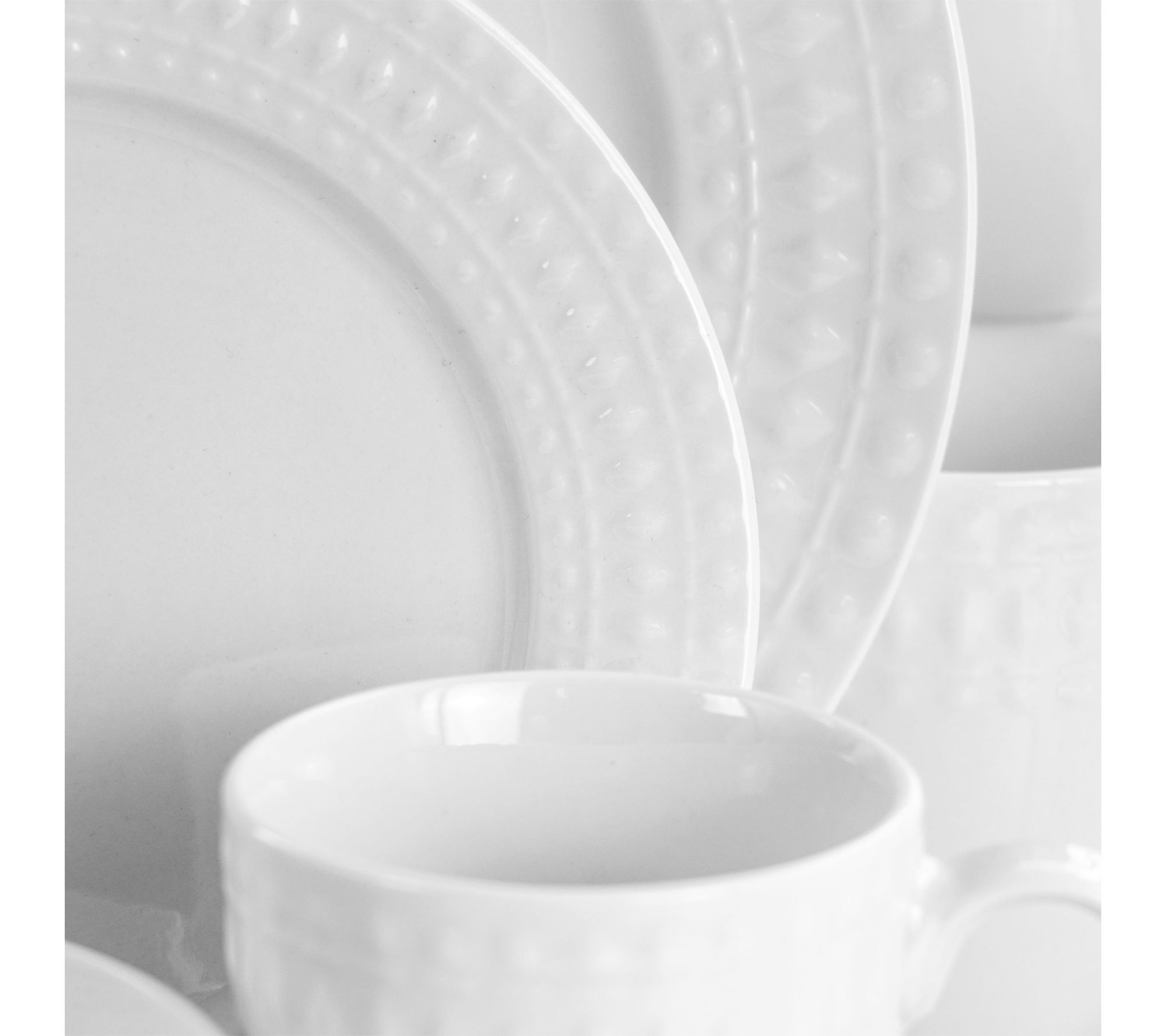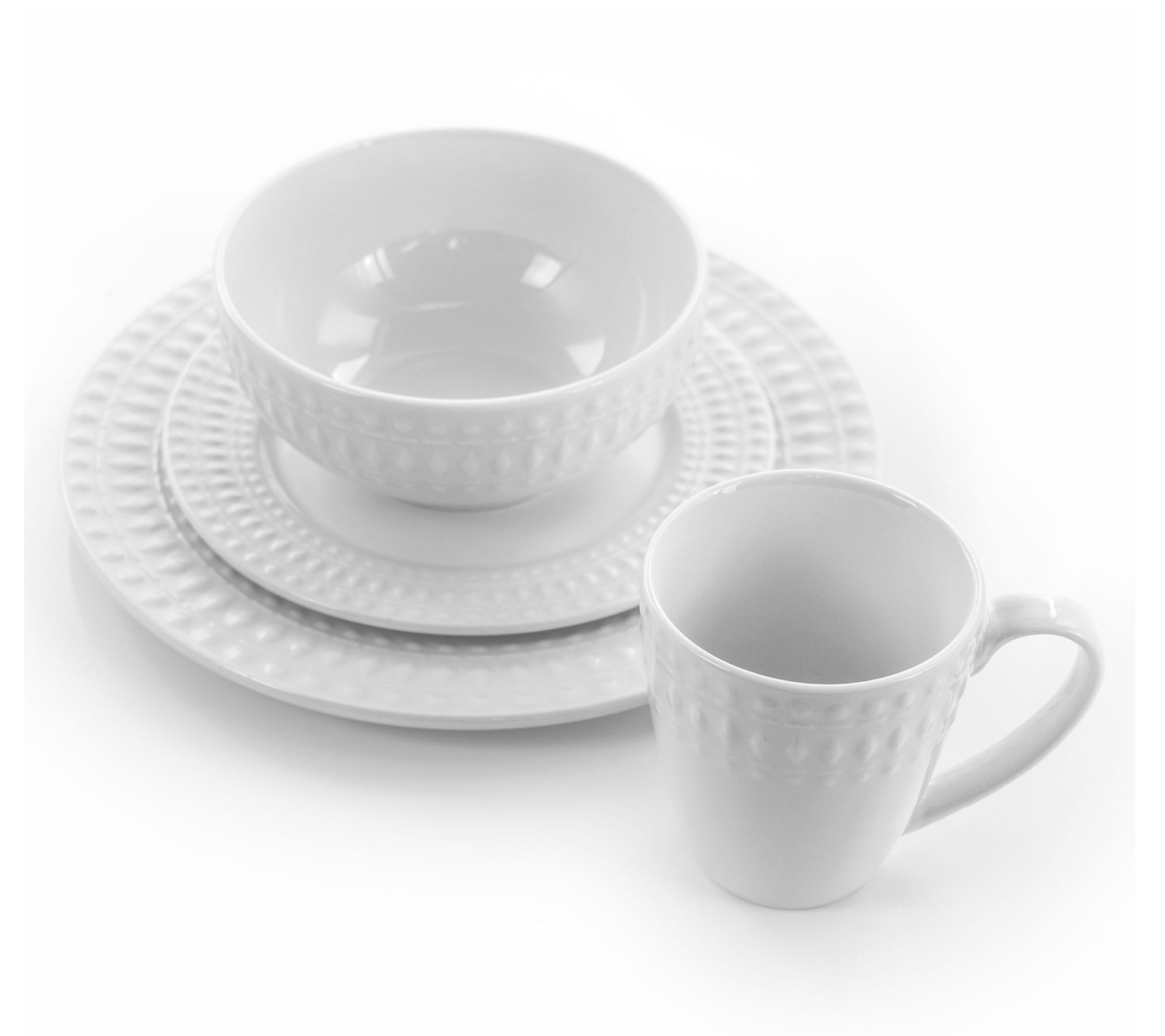 Create a welcoming table for family dinners or friendly gatherings with this round porcelain dinnerware set. Embossed circular patterns add a stylish touch to every place setting, while the complete service for four makes it easy to share everyday meals or celebrate special occasions. From Elama.