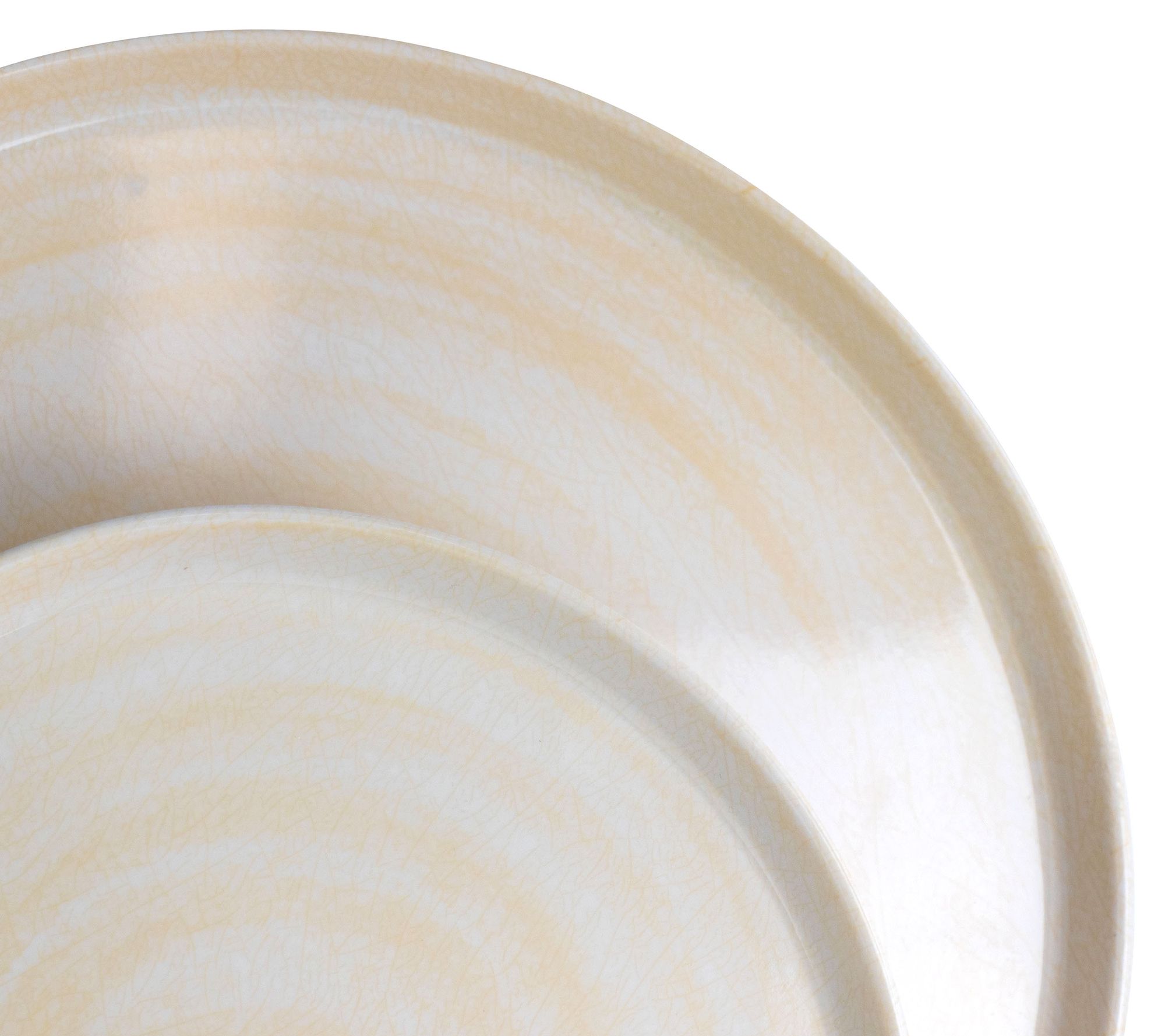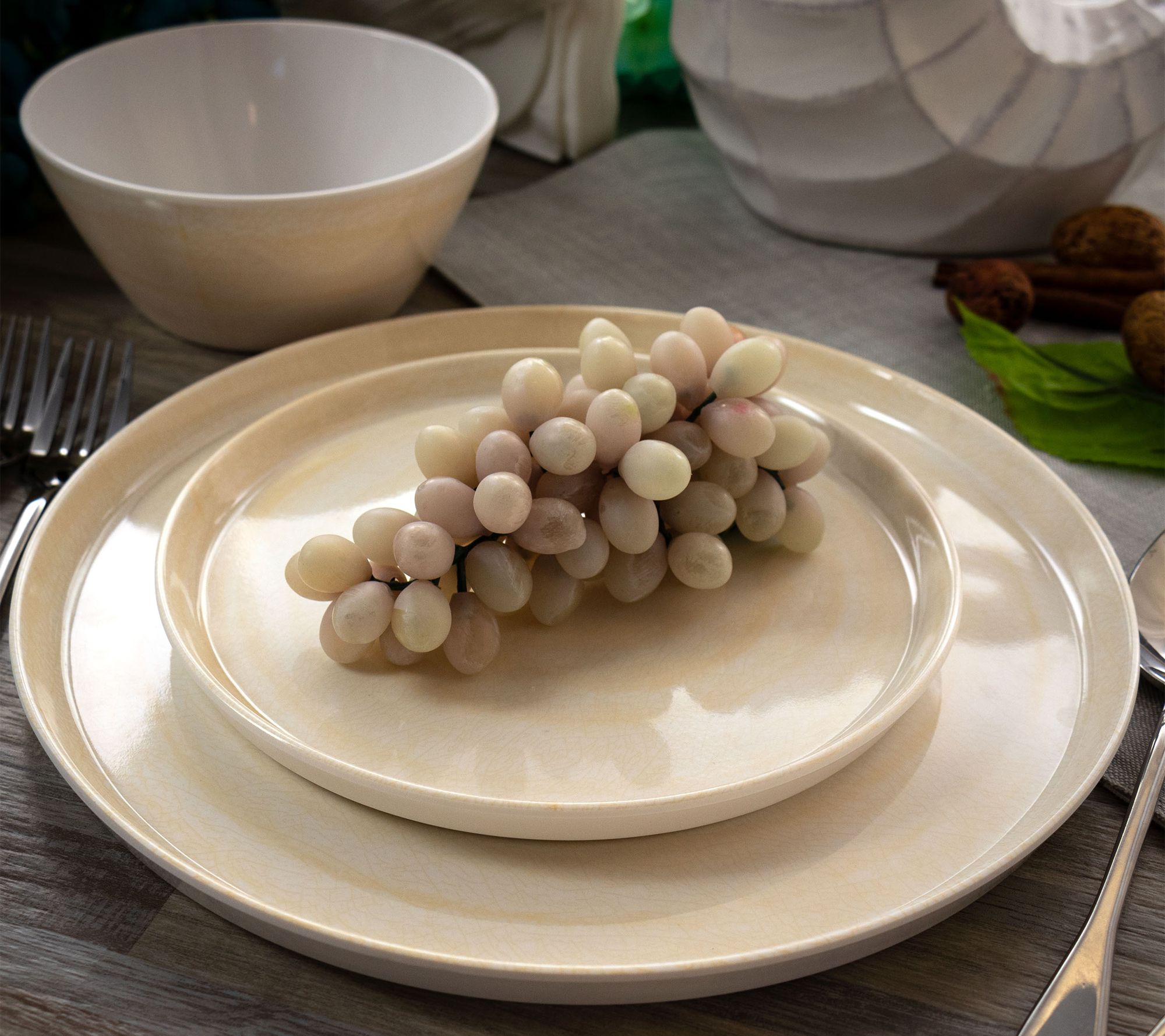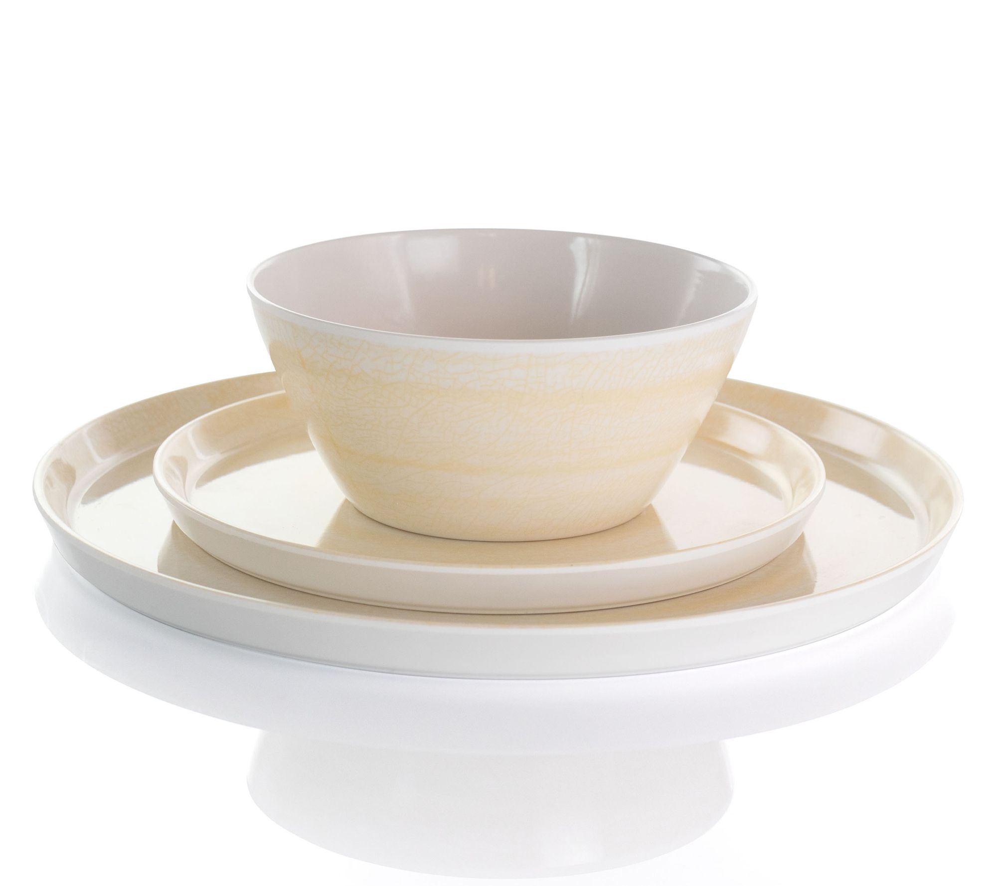 Bring an elegant, yet natural look to your tablescape with this service for four dinnerware set made from lightweight melamine. With a cream and unique crackle design, these plates and bowls bring a charming, minimalist vibe and they're shatter-resistant so they're great for kids' parties, pool parties or camping. From Elama.