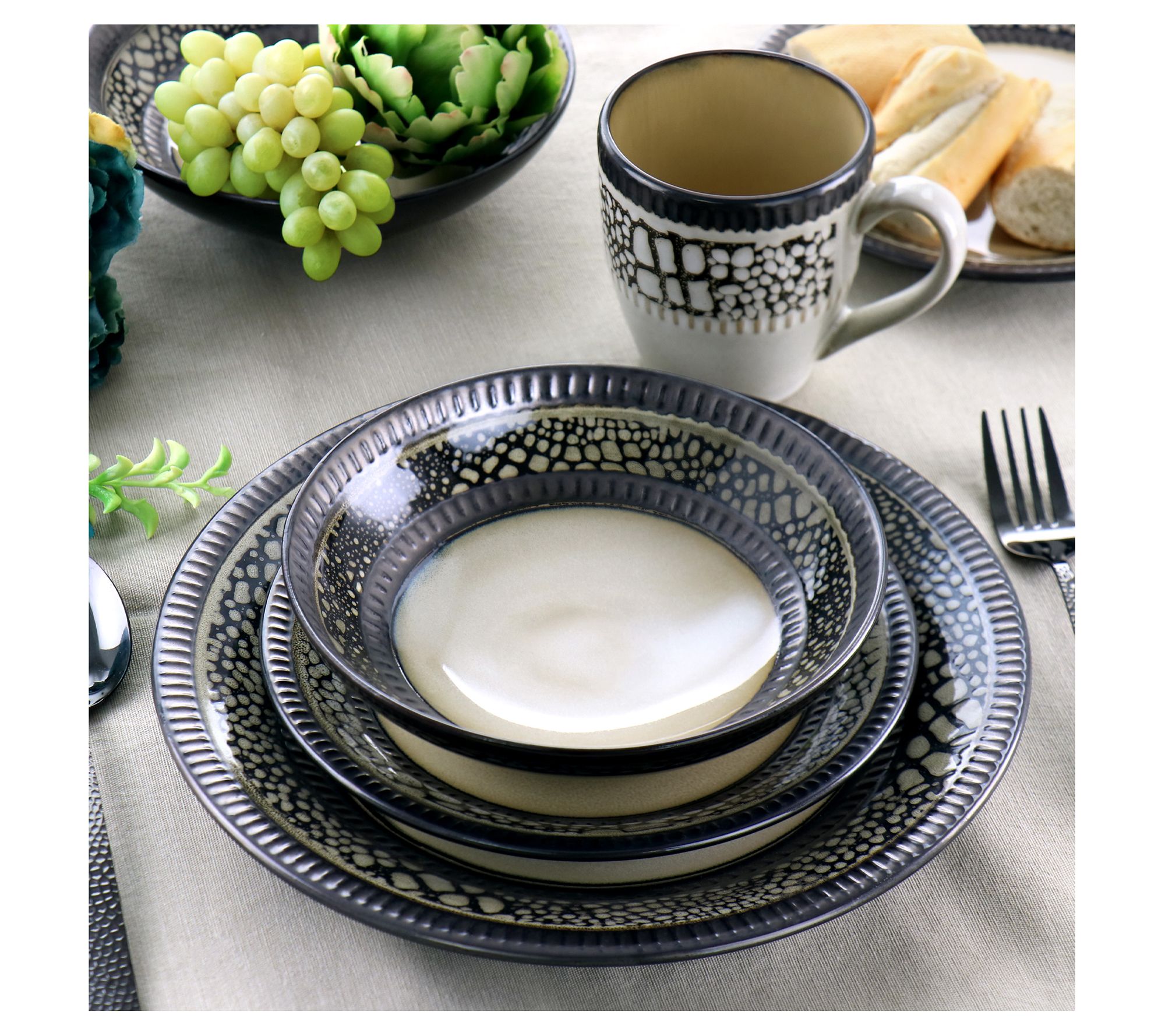 • Includes four dinner plates, four salad plates, four 14-oz cereal bowls, and four 12-oz mugs
