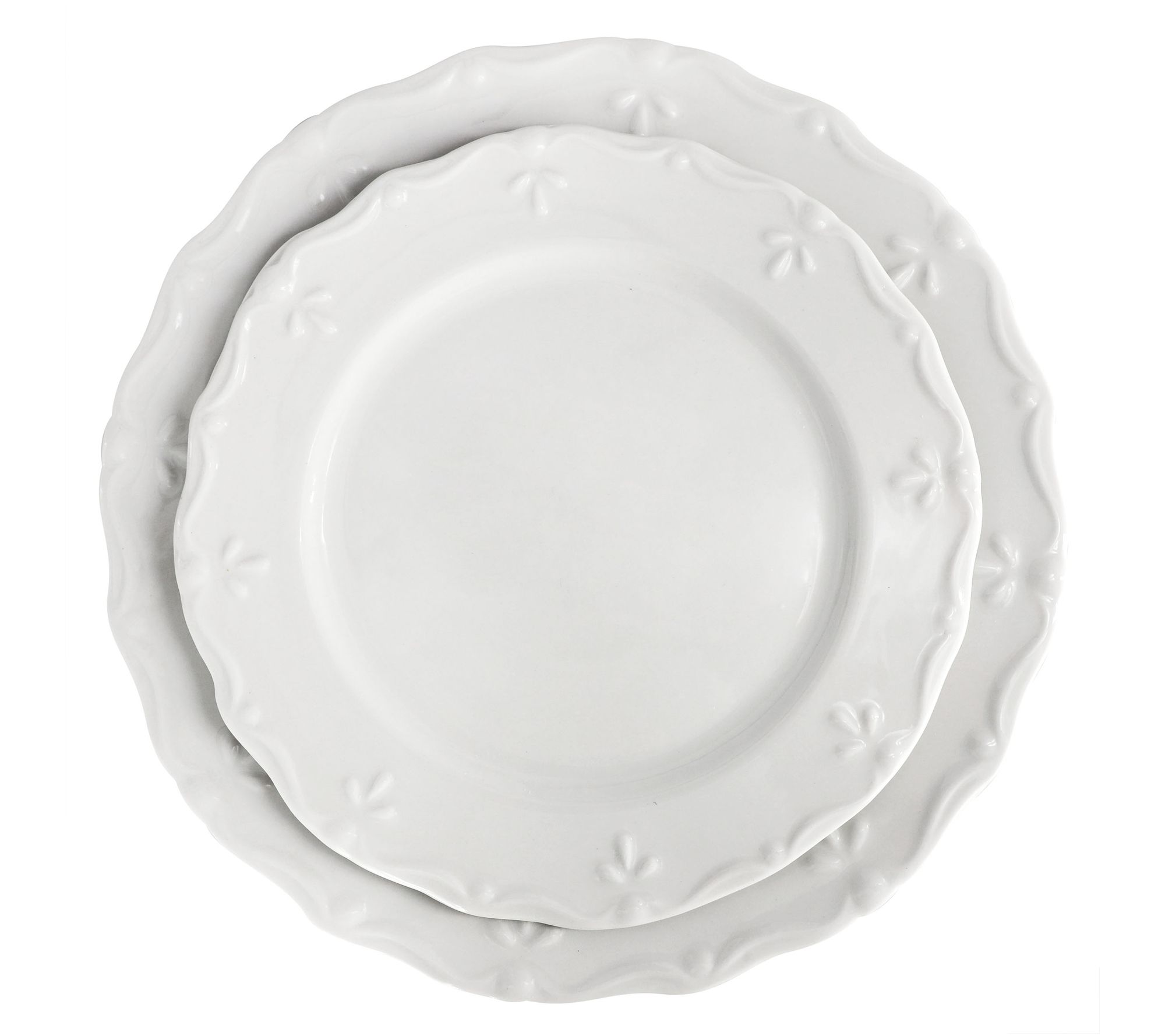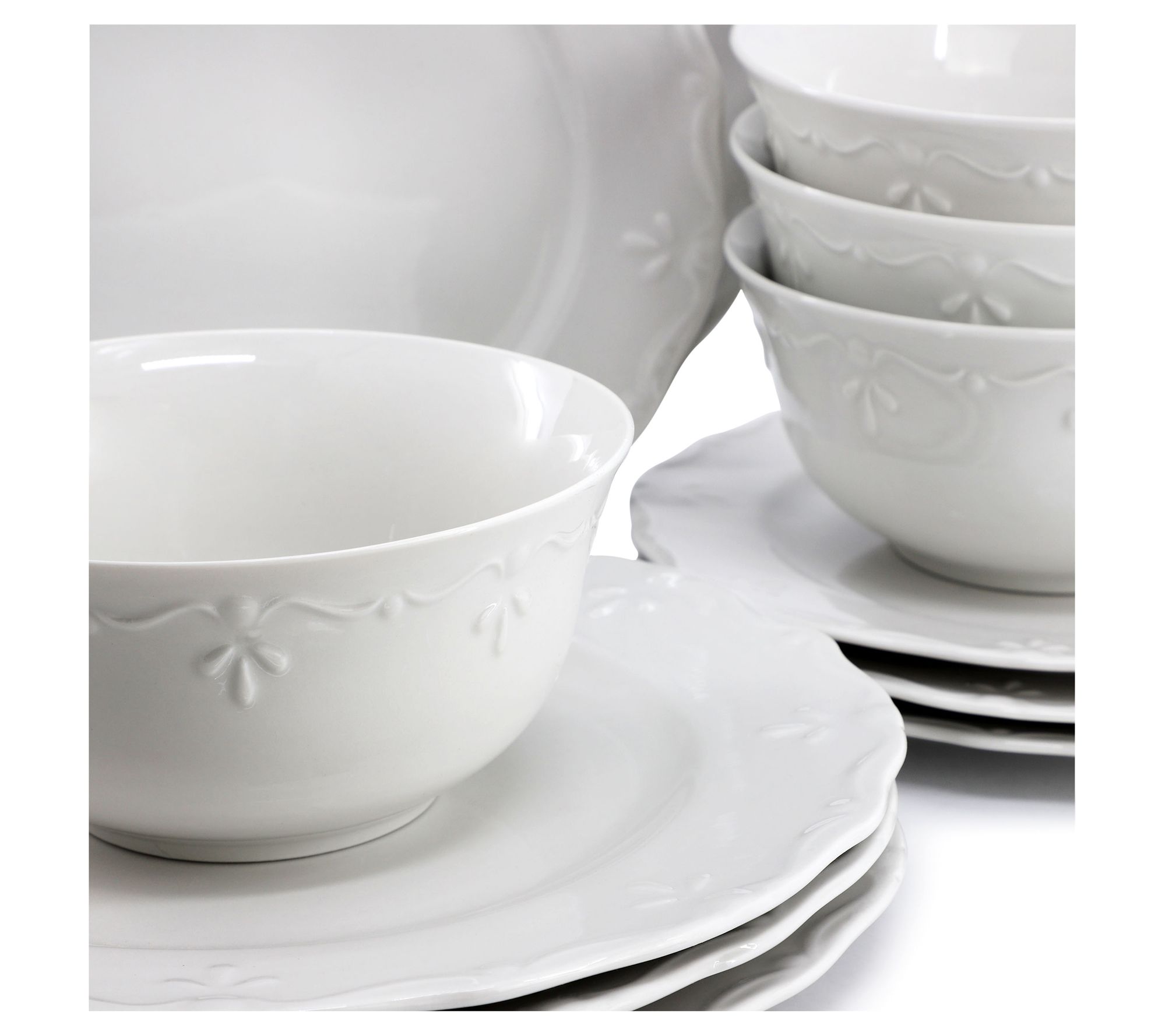 Imagine hosting a dinner party or a cozy family meal with this exquisite 16-piece porcelain dinnerware set. The elegant Elama Henryi collection brings both sophistication and functionality to your table. Its embossed rim and scalloped edges provide a timeless appeal, suitable for any occasion. Versatile in white, this collection pairs seamlessly with any decor. From Elama.
