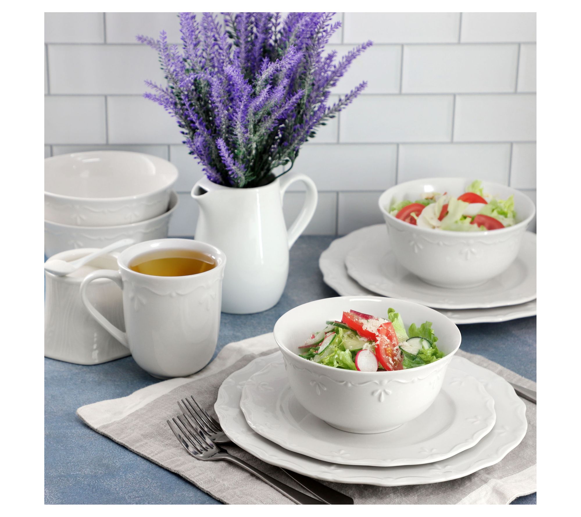 • Includes four dinner plates, four salad plates, four bowls, and four 12-oz mugs