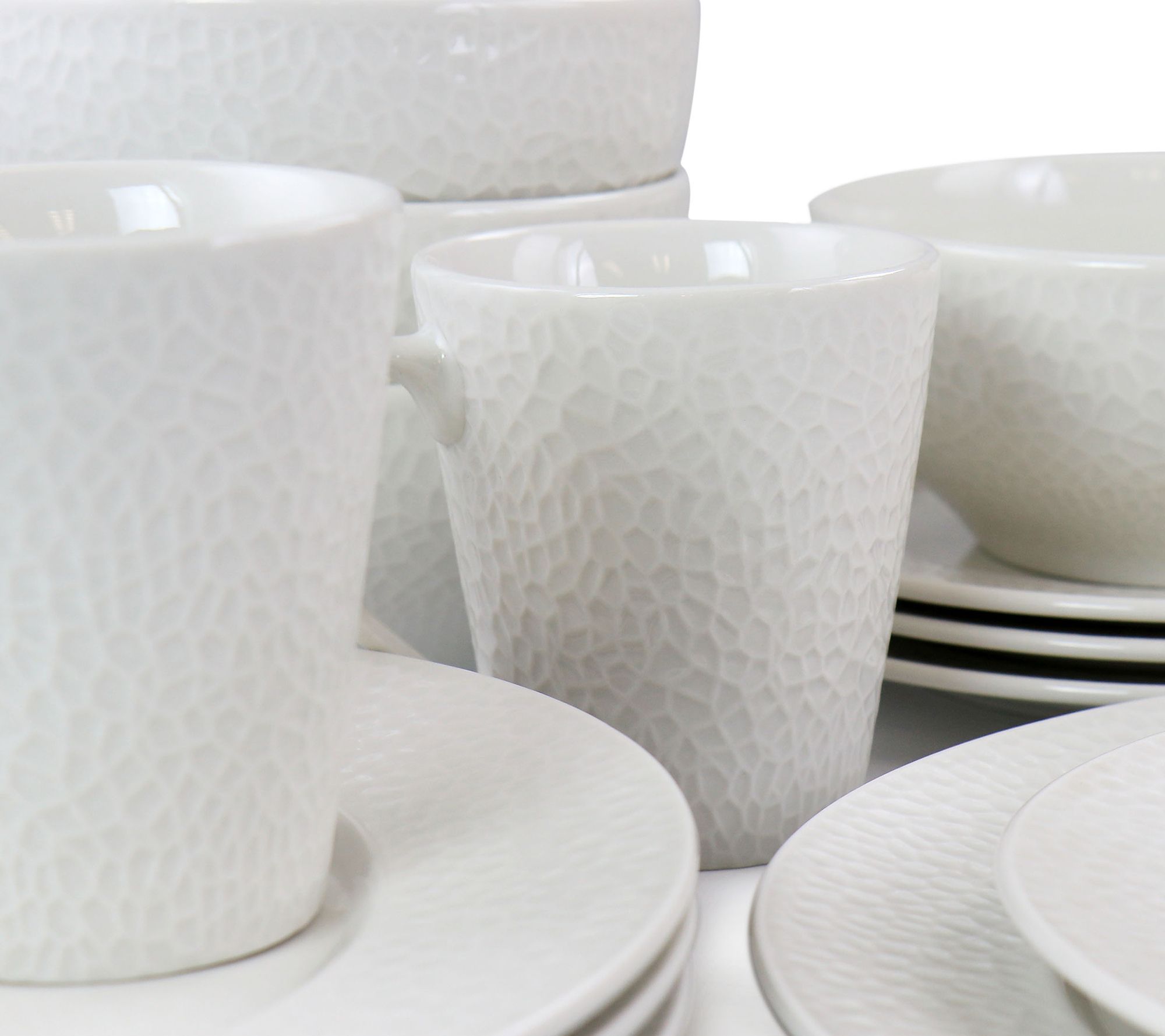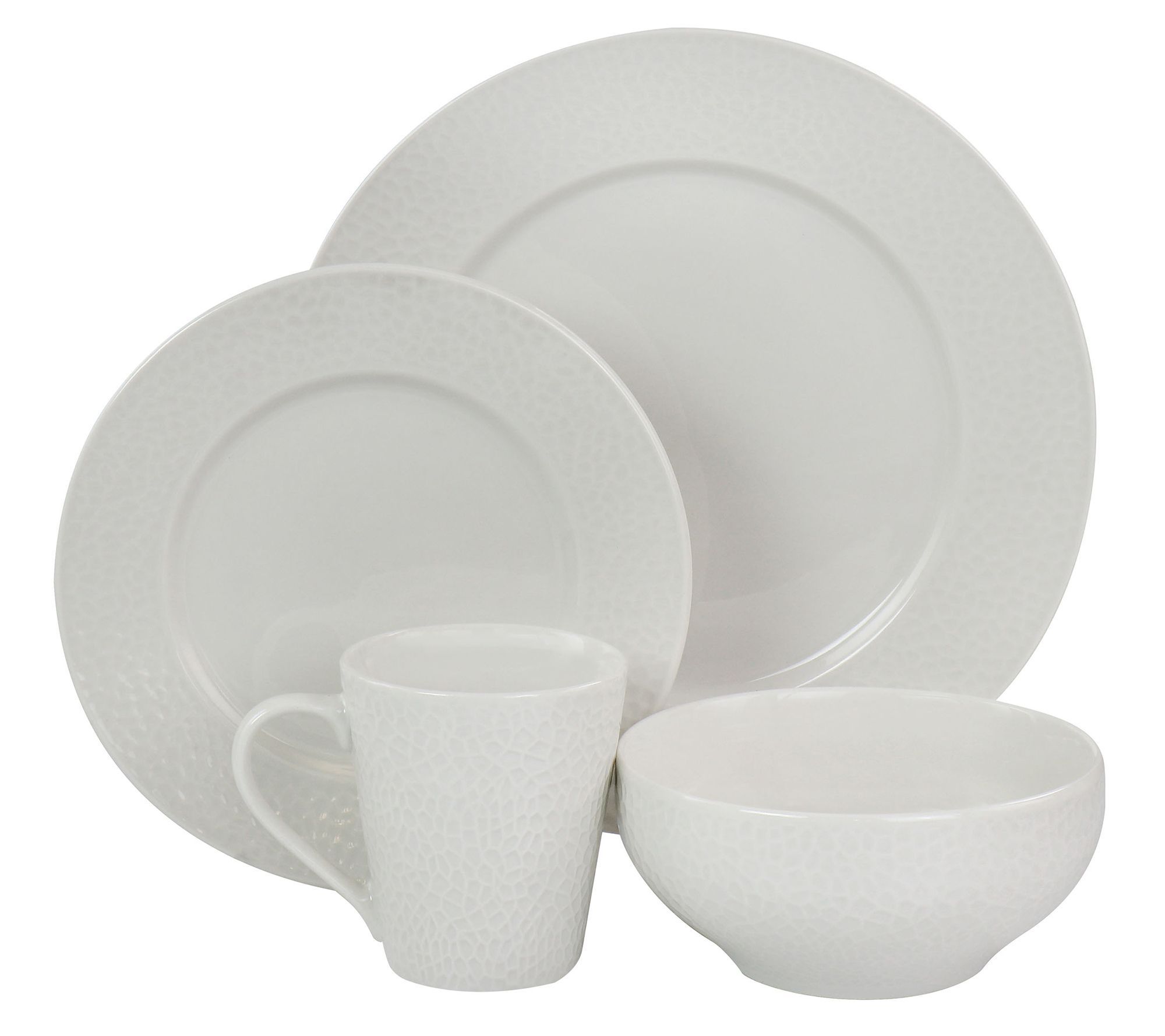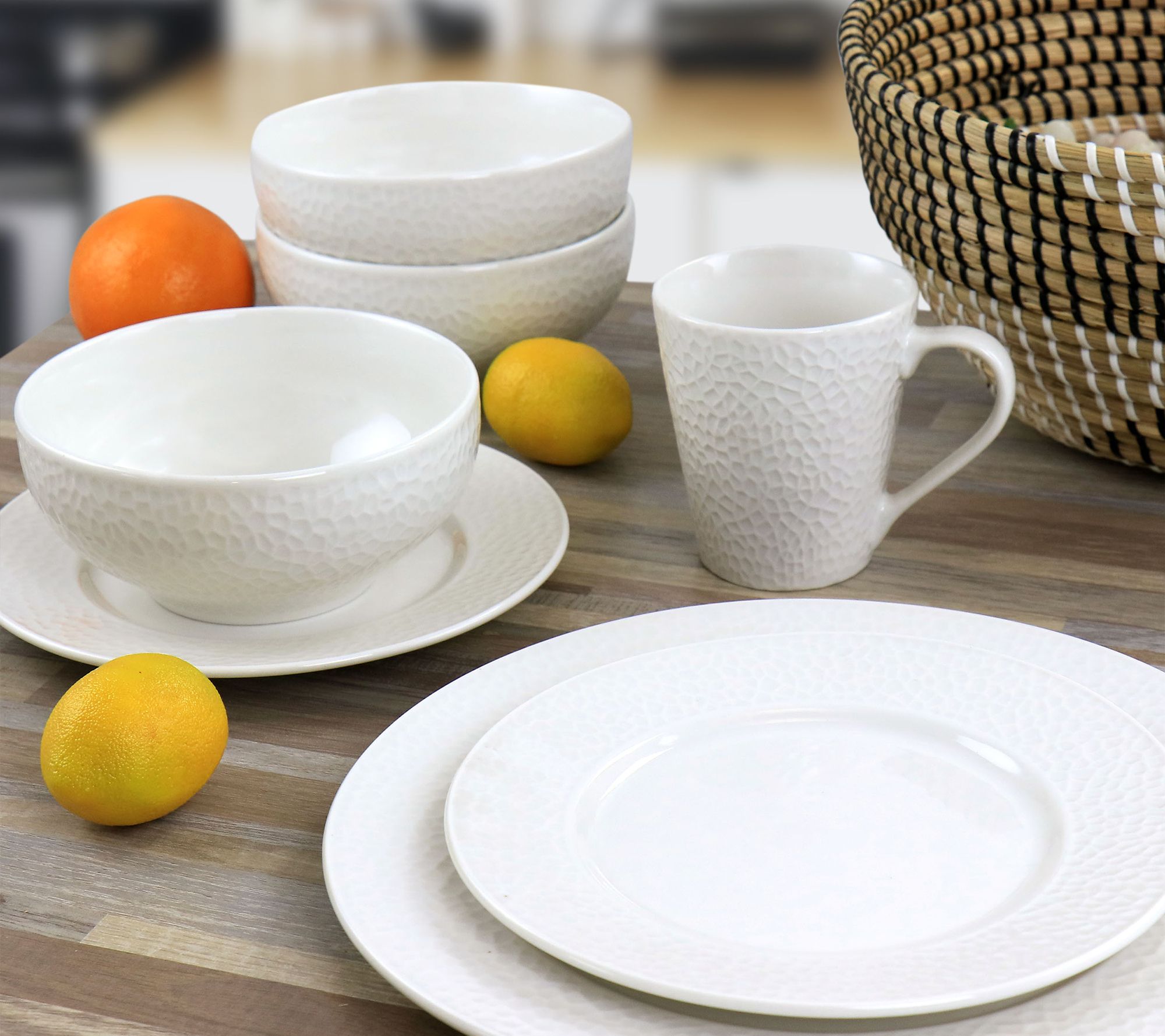 • Includes four 10.5" dinner plates, four 8", four 6" bowls, and four 12-oz mugs
