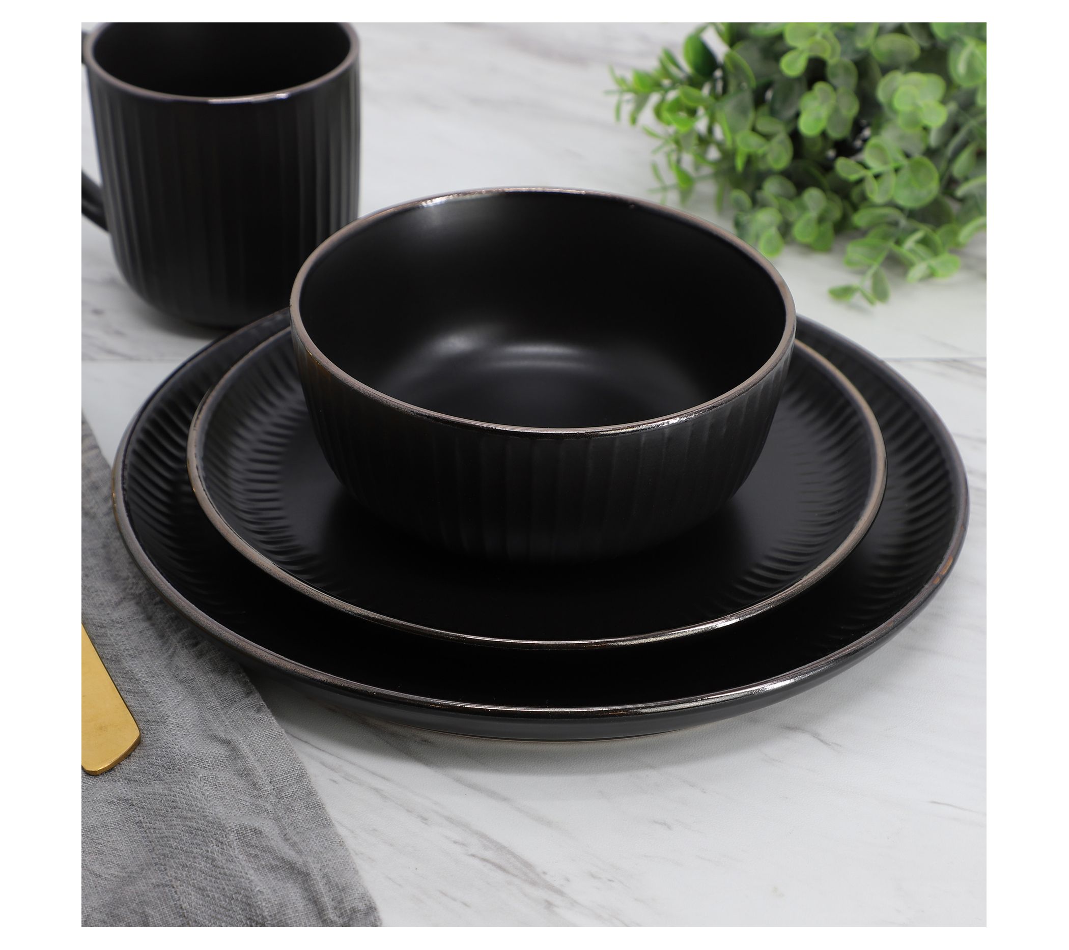 Elevate your dining experience with the Elama Leo 16-piece stoneware dinnerware set. Crafted with sophistication and durability in mind, this set boasts a sleek black finish that adds a touch of elegance to any table setting. Perfect for everyday use or special occasions, the versatile design seamlessly complements any kitchen decor. From Elama.