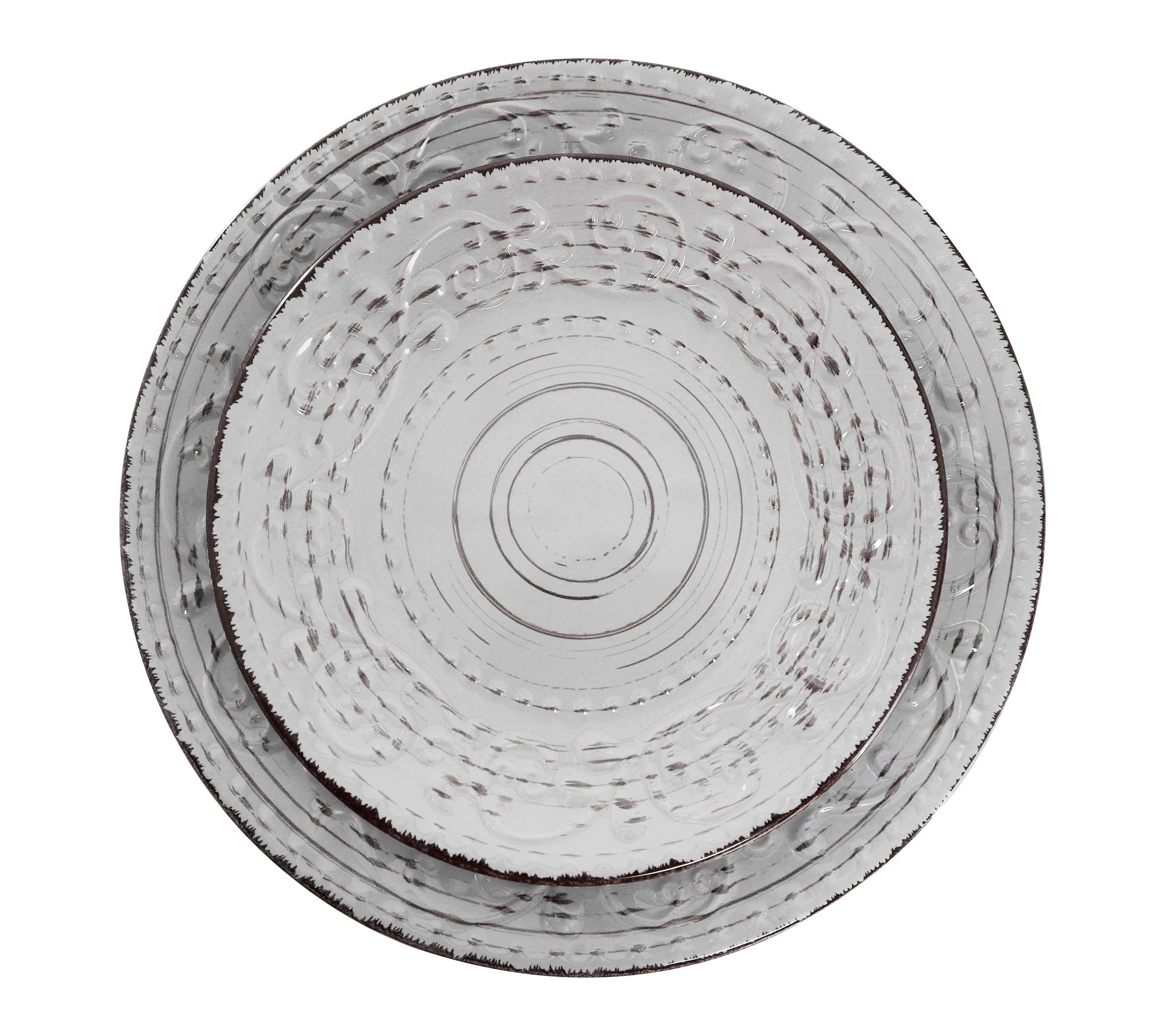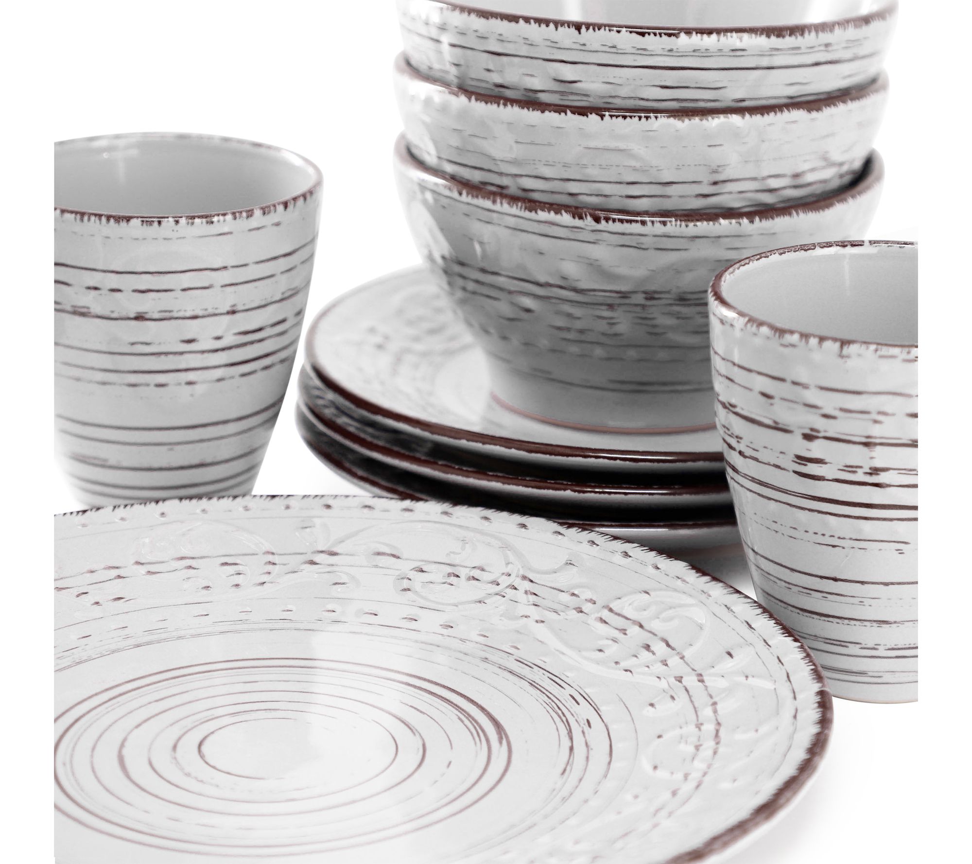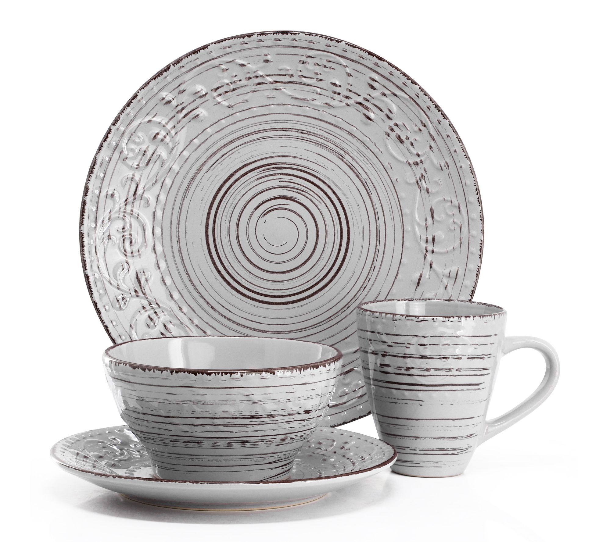 Set the scene for memorable dinners and casual brunches with this stoneware dinnerware set, where a coastal-inspired light gray finish and embossed, hand-painted swirl details bring a sophisticated yet relaxed vibe to your table. Designed to serve four, these pieces blend artistic style with everyday convenience -- ideal for everything from weeknight meals to festive gatherings. From Elama.