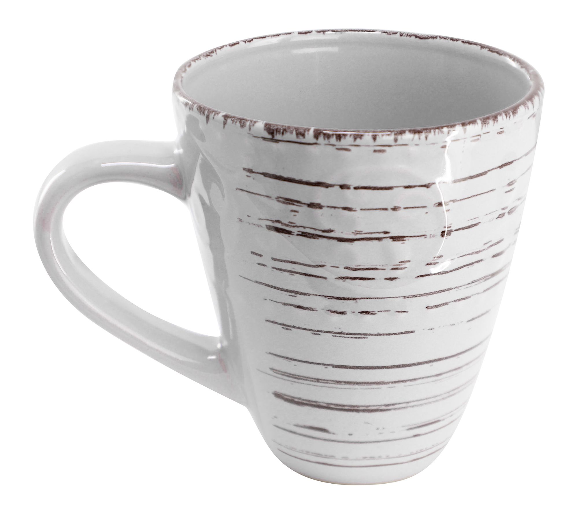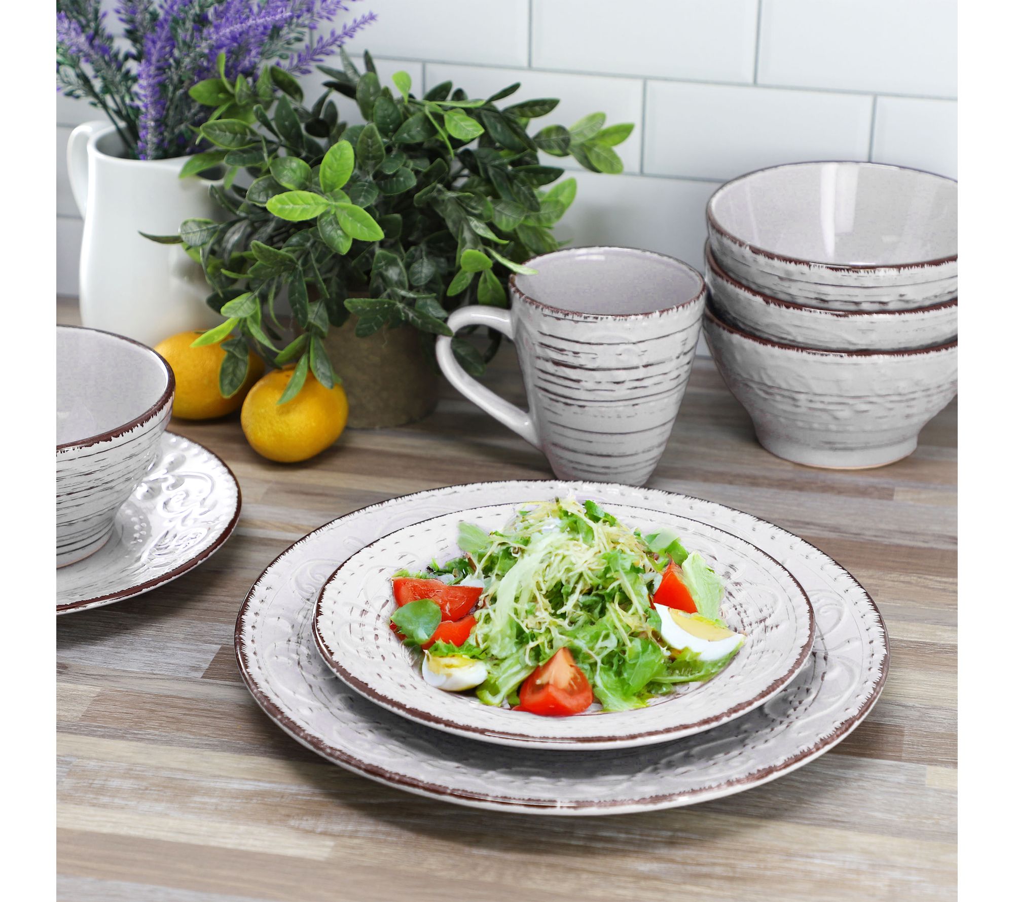 • Includes four 10.75" dinner plates, four 8.25" salad plates, four 6" bowls, and four 12-oz mugs