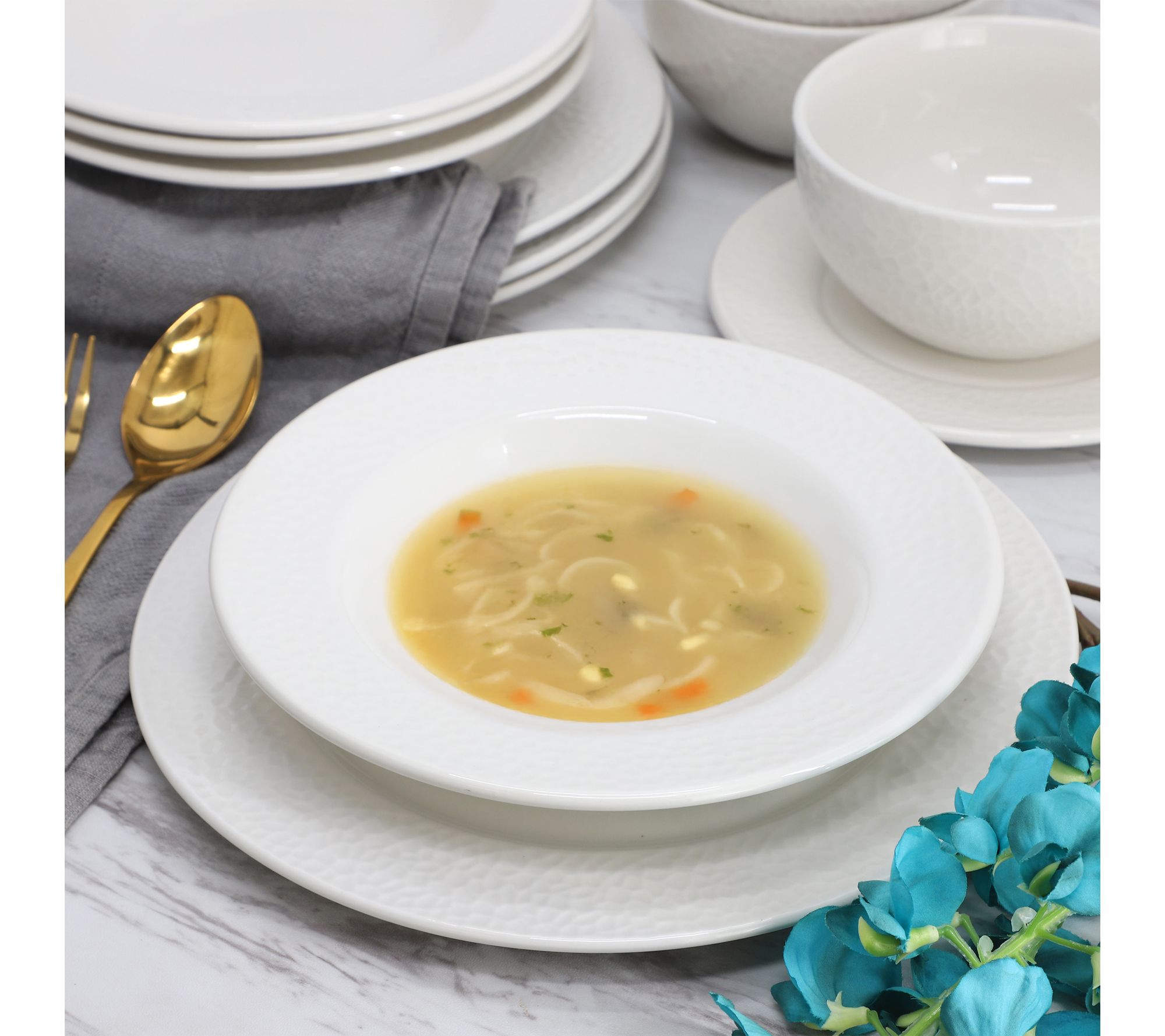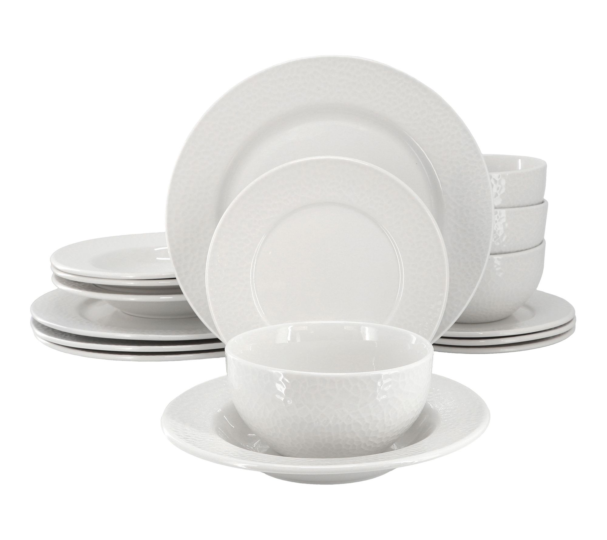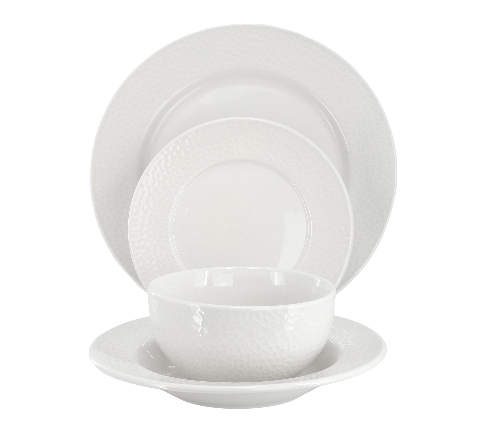 Includes four 10.6" dinner plates, four 7.5" salad plates, four 8.8" soup bowls, and four 5.6" cereal bowls