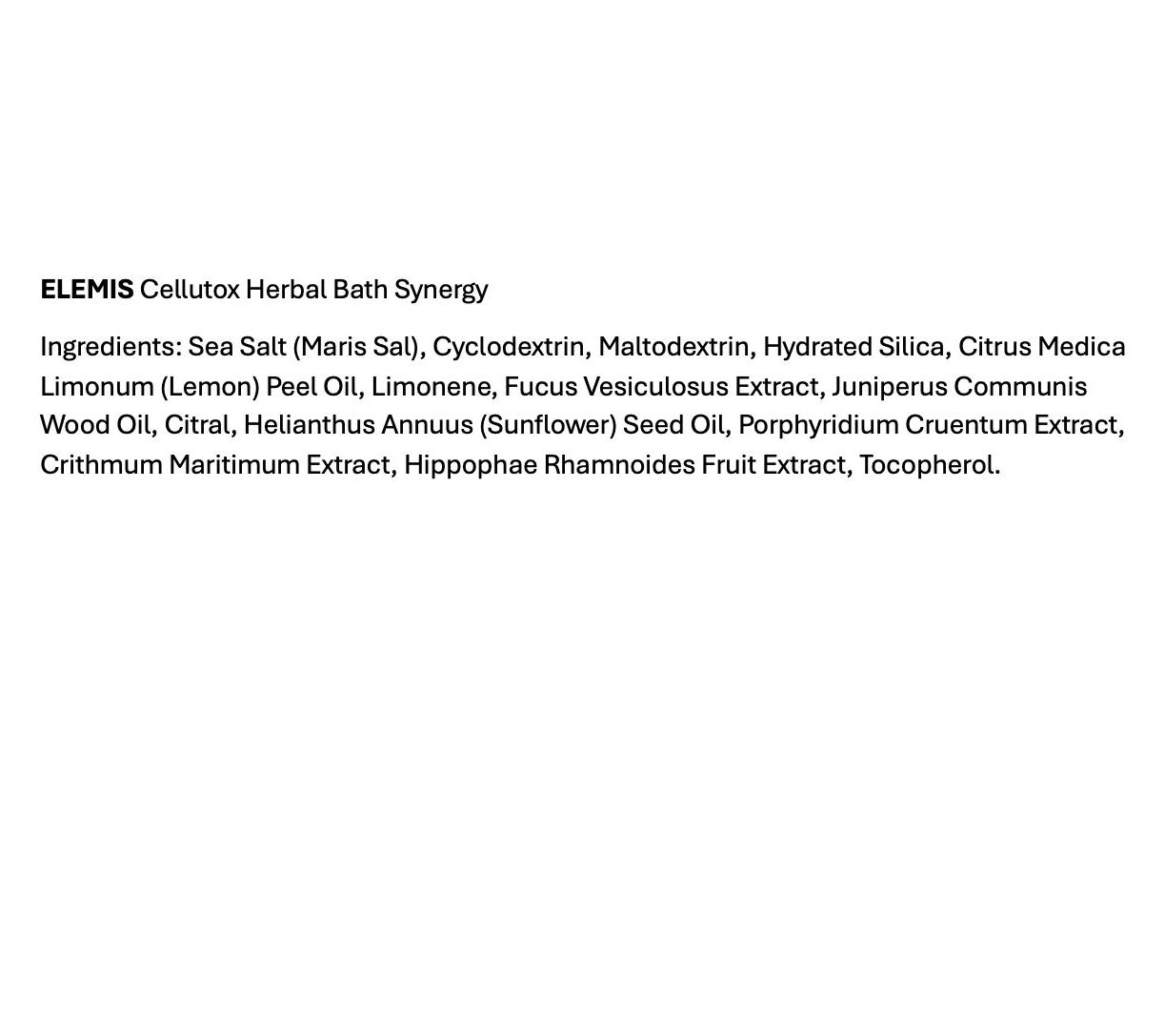 Cellutox Herbal Bath Synergy from ELEMIS is a bath soak that helps to leave the body feeling renewed. Relax with these bath salts. Formulated with algae, sea buckthorn, and sea fennel extracts combined with oils of juniper and lemon, it combines the richness of sea plants with the essence of pure aroma. Use as part of a body cleansing program to leave skin feeling soft and refreshed.How do I use it: Empty one sachet while filling the bath with warm water at body temperature. Soak in the bath and concentrate on abdominal breathing for 15 to 20 minutes.From ELEMIS.Includes: