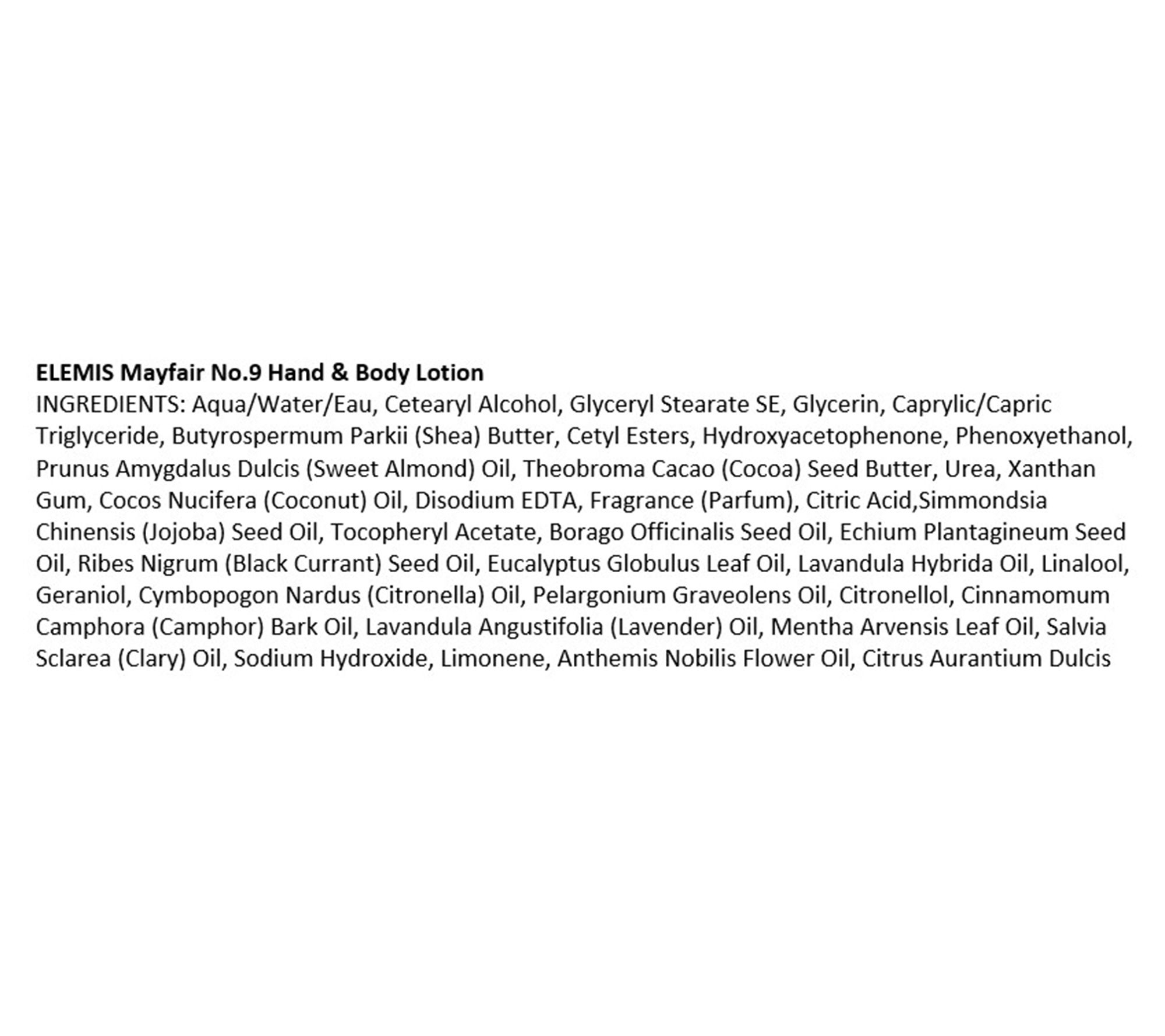 Mayfair No. 9 Hand & Body Lotion is a luxurious formula that leaves skin silky smooth and contains shea butter and borage oil. It's scented with ELEMIS' signature British Mayfair No. 9 fragrance, inspired by Pro-Collagen Cleansing Balm with nine key essential oils.How do I use it: Gently massage into clean, dry skin until absorbed.From ELEMIS.Includes: