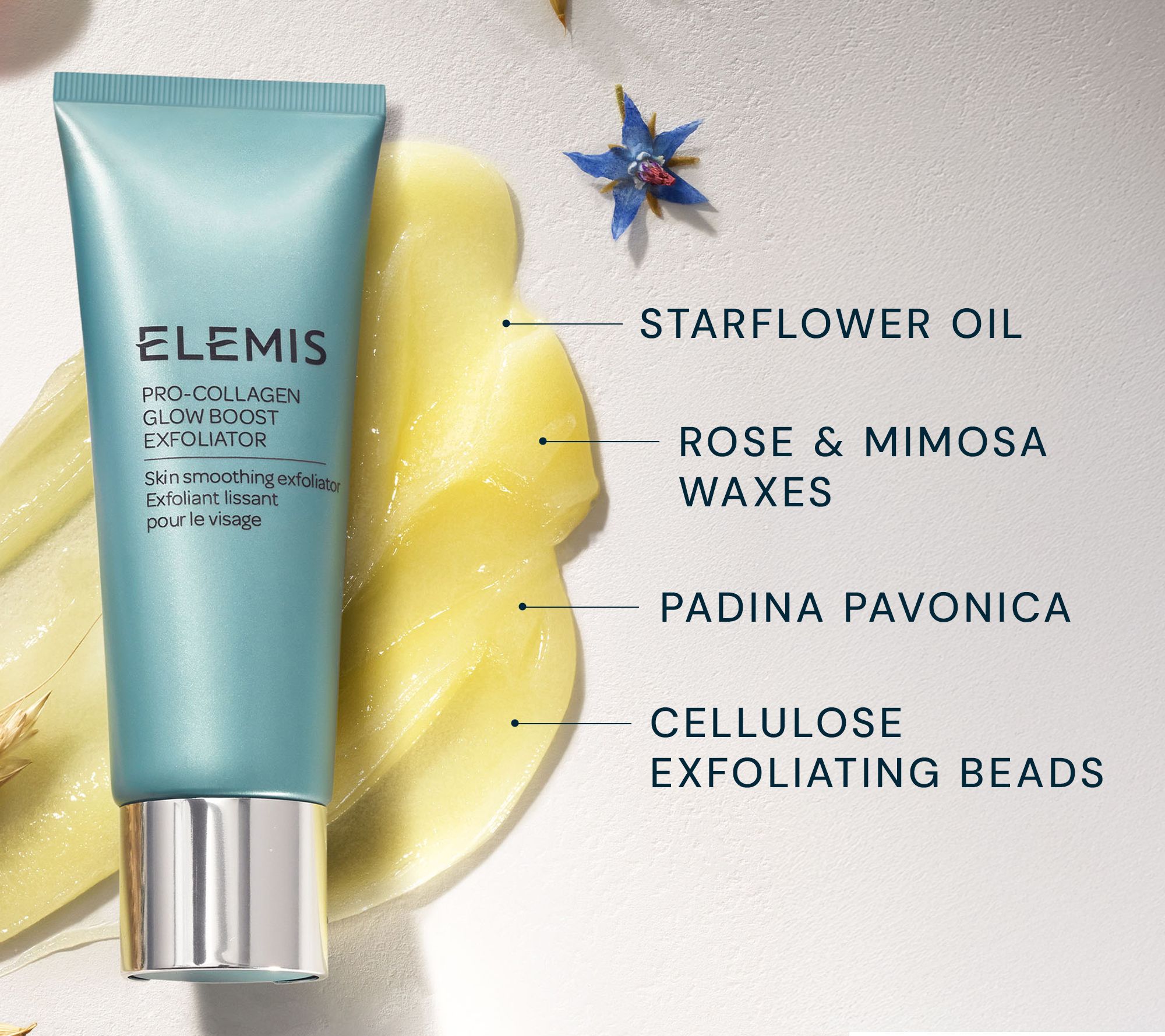 Pro-Collagen Glow Boost Exfoliator is formulated with cellulose beads combined with a trio of oils, starflower, elderberry, and optimega oils. It helps to provide moisture to increase the feeling of smoothness and contains rose and mimosa waxes. This blend helps soften the skin, and the aroma inspires a spa-like cleansing experience.