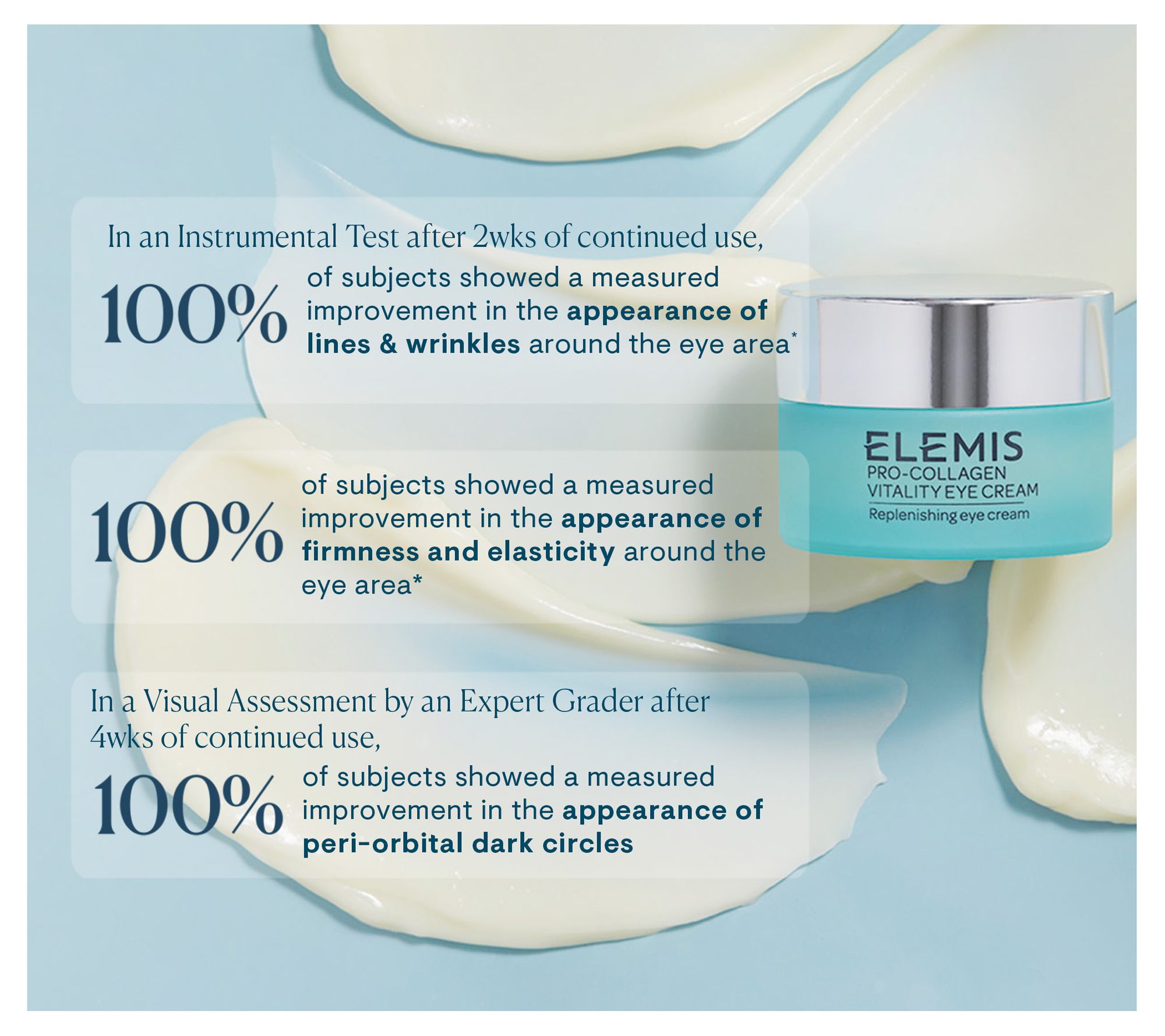 In an instrumental test after, two weeks of continued use: - 100% of subjects showed a measured improvement in the appearance of lines and wrinkles around the eye area - 100% of subjects showed a measured improvement in the appearance of firmness and elasticity around the eye area