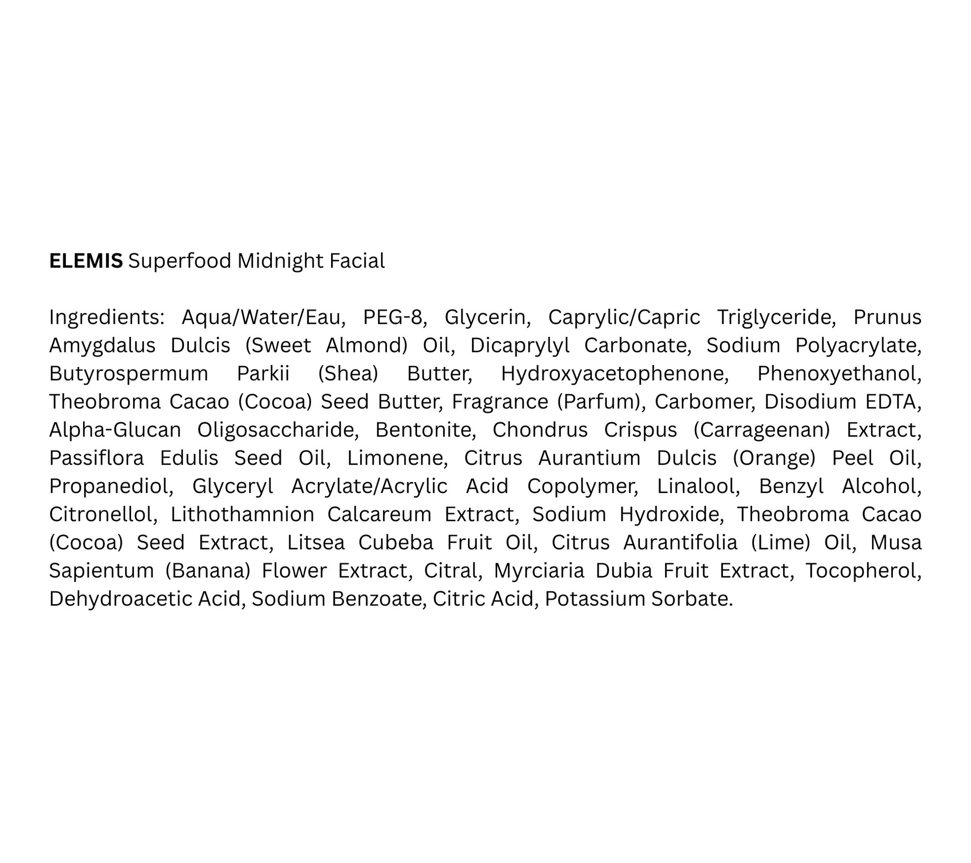 How do I use it: For optimal results, use Superfood Midnight Facial every evening or a minimum of twice weekly. Warm a pea-size amount into the palms and massage into the face and neck with circular movements.