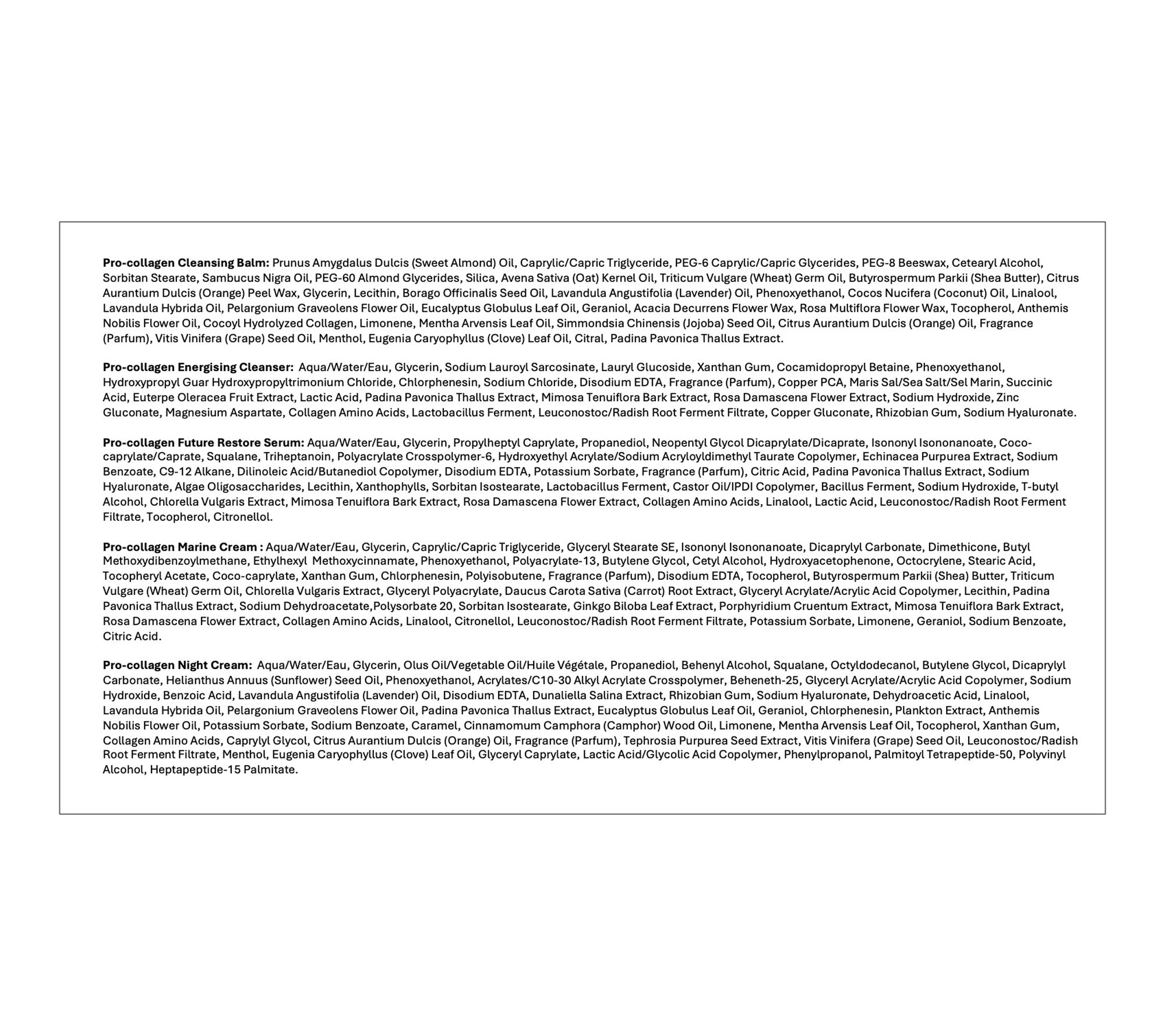 How do I use it: Start with warming an almond-sized amount of Pro-Collagen Rose Cleansing Balm into the skin. Moisten fingertips and continue to massage so that the oil emulsifies into a milk. Rinse off with water or remove with a cleansing cloth. Leave on for 10 to15 minutes, once a week as a nourishing facial mask. For a double cleanse, mix one pump of Pro-Collagen Energising Marine Cleanser into the palms with a little warm water, avoiding the eye area. Gently massage over the face, neck, and decolletage with light, circular massage movements. Rinse away and continue with the rest of your skincare routine. Follow with Pro-Collagen Future Restore Serum every morning and evening to cleansed skin. Dispense two to three drops onto fingertips. Smooth on the face, neck, and decolletage using upward strokes. Every morning, apply a pea-sized amount of Pro-Collagen Marine Cream to the face, neck, and decolletage using sweeping upward strokes. Every evening, apply a pea-sized amount of Pro-Collagen Night Cream using fingertips as the final step of your routine. Smooth over the face, neck, and decolletage using gentle upward strokes.