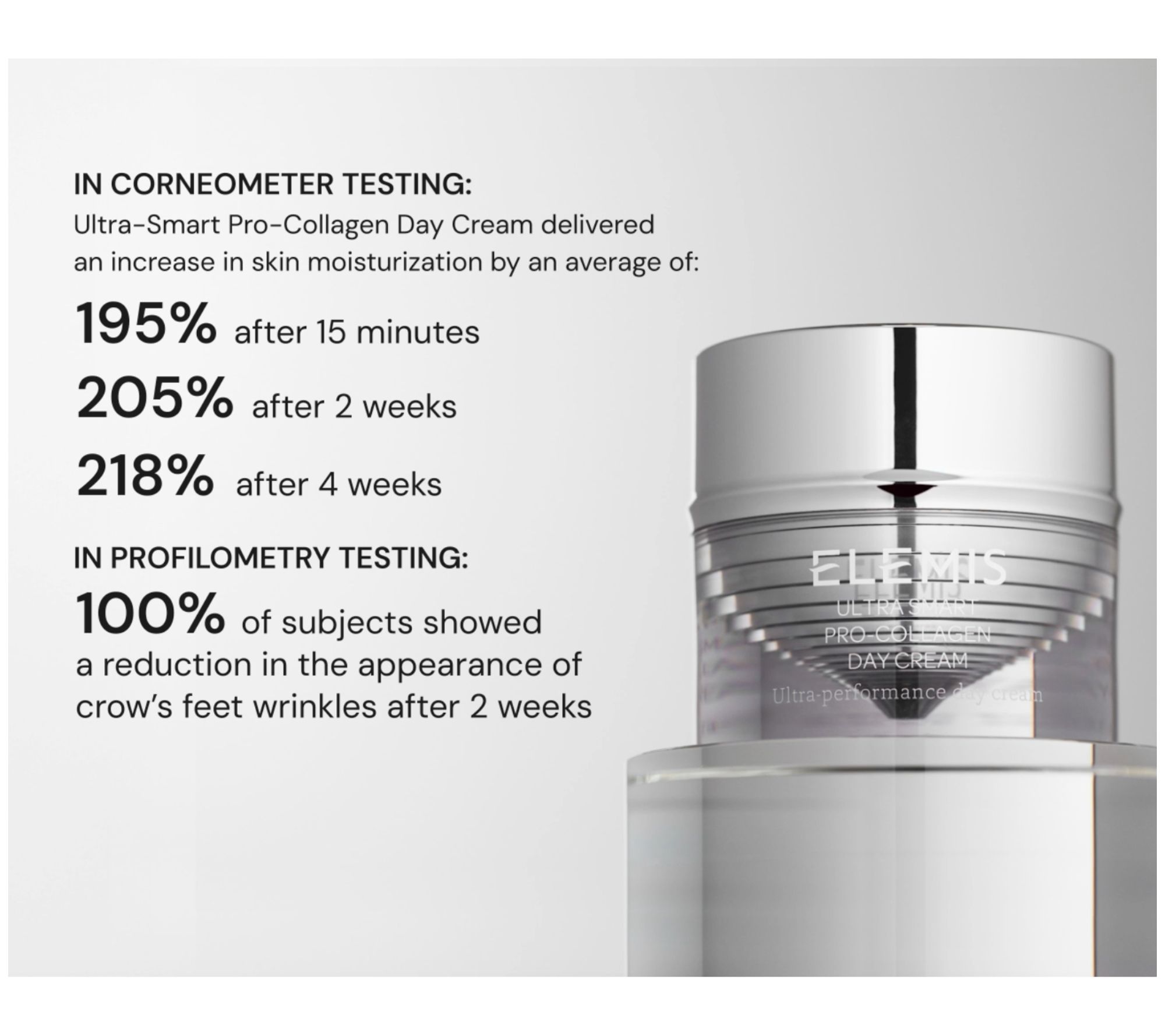 In Corneometer testing, Ultra-Smart Pro-Collagen Day Cream delivered an average increase in skin moisturization of 195% after 15 minutes. In testing using Profilometry, 100% of subjects showed a reduction in the appearance of crow's feet wrinkles after two weeks.
