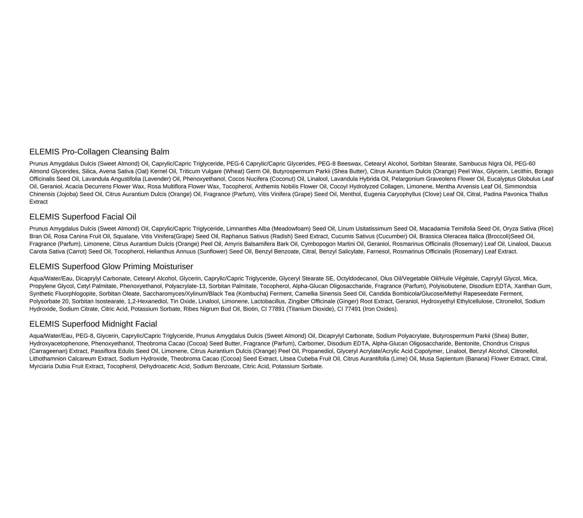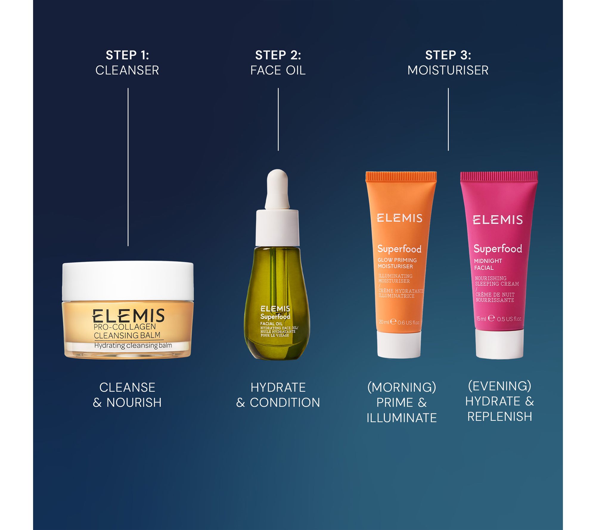How do I use it: Warm an almond-sized amount of Pro-Collagen Cleansing Balm into the skin. Moisten fingertips and continue to massage so that the oil emulsifies into a milk. Rinse off with water or remove with a cleansing cloth. Leave on for 10 to 15 minutes, once a week. Follow with dropping three to four drops of Superfood Facial Oil into the palm of hands. Cup hands in front of your face and inhale the herbal aromatic. Press and massage onto the face, neck and decolletage. Smooth a pea-sized amount of Superfood Glow Priming Moisturizer to the face and neck in upward strokes. To use as a highlighter, dab a rice grain-sized amount on the high points of the face, including the cheekbones, bridge of the nose and Cupid's bow. For optimal results, use Elemis Superfood Midnight Facial every evening or a minimum of twice weekly. Warm a pea-sized amount into the palms and massage into the face and neck with circular movements.