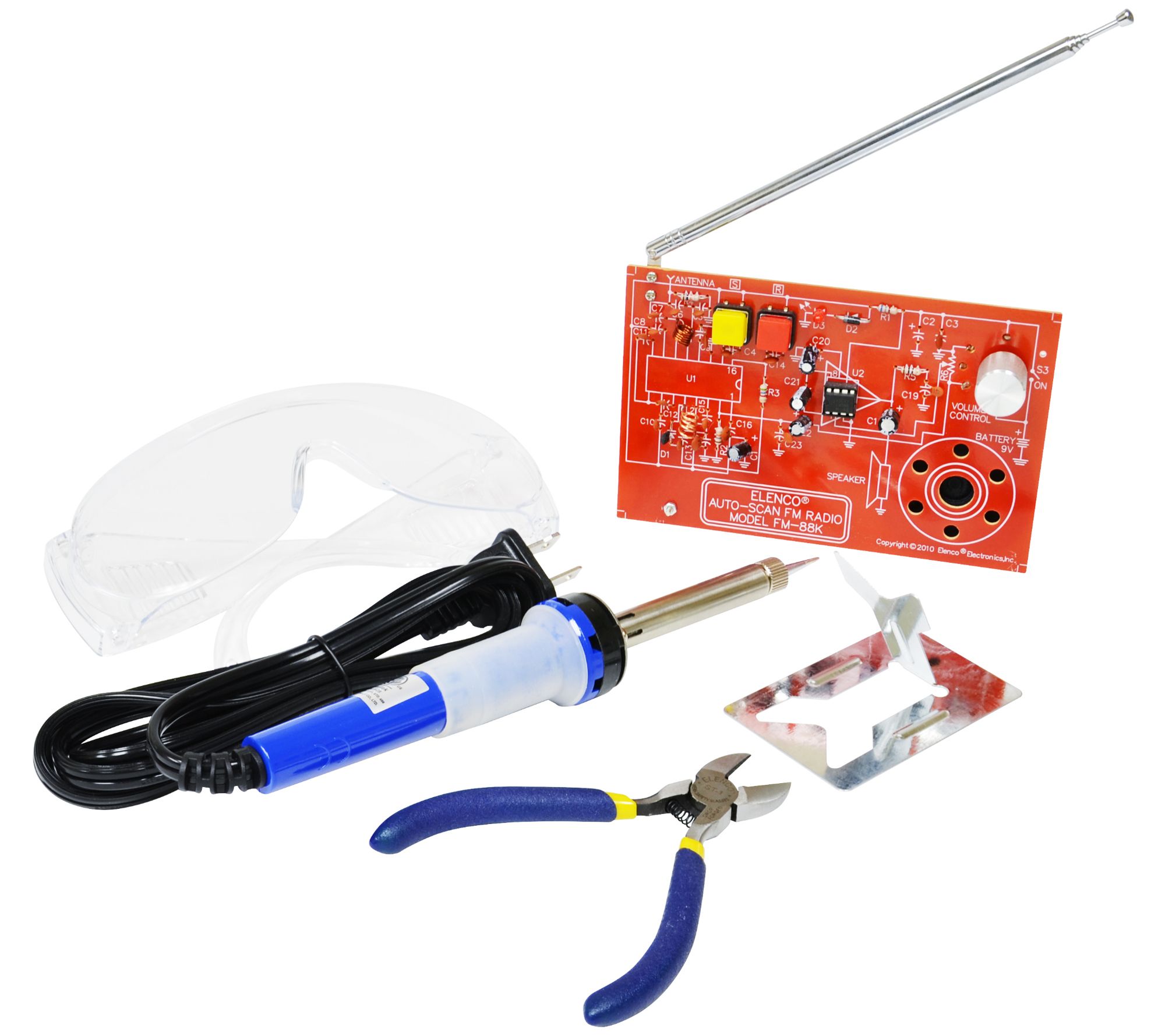 • Includes 25W iron with stand, side cutter, safety glasses, and an FM-88K two IC (integrated circuit) radio soldering kit