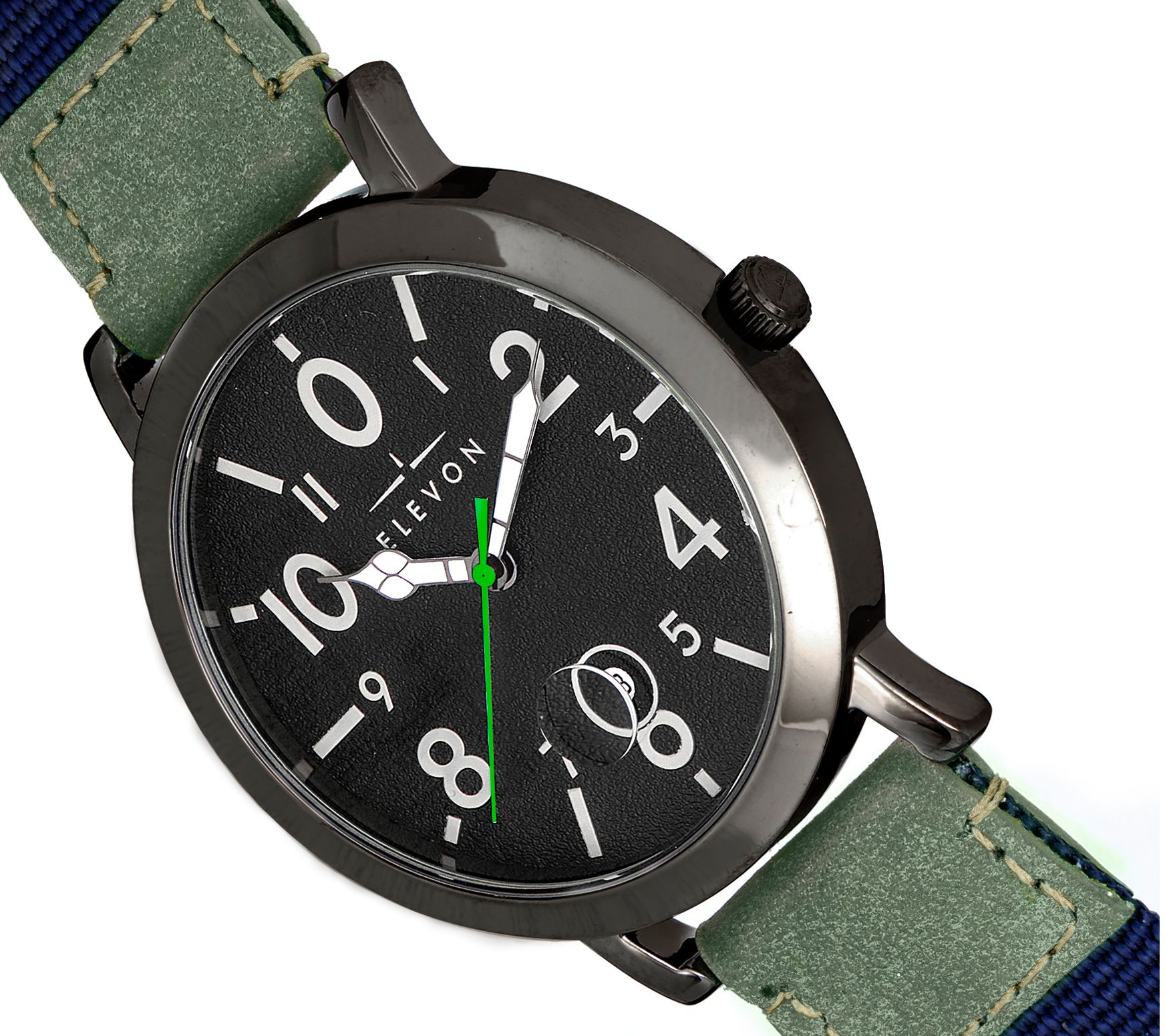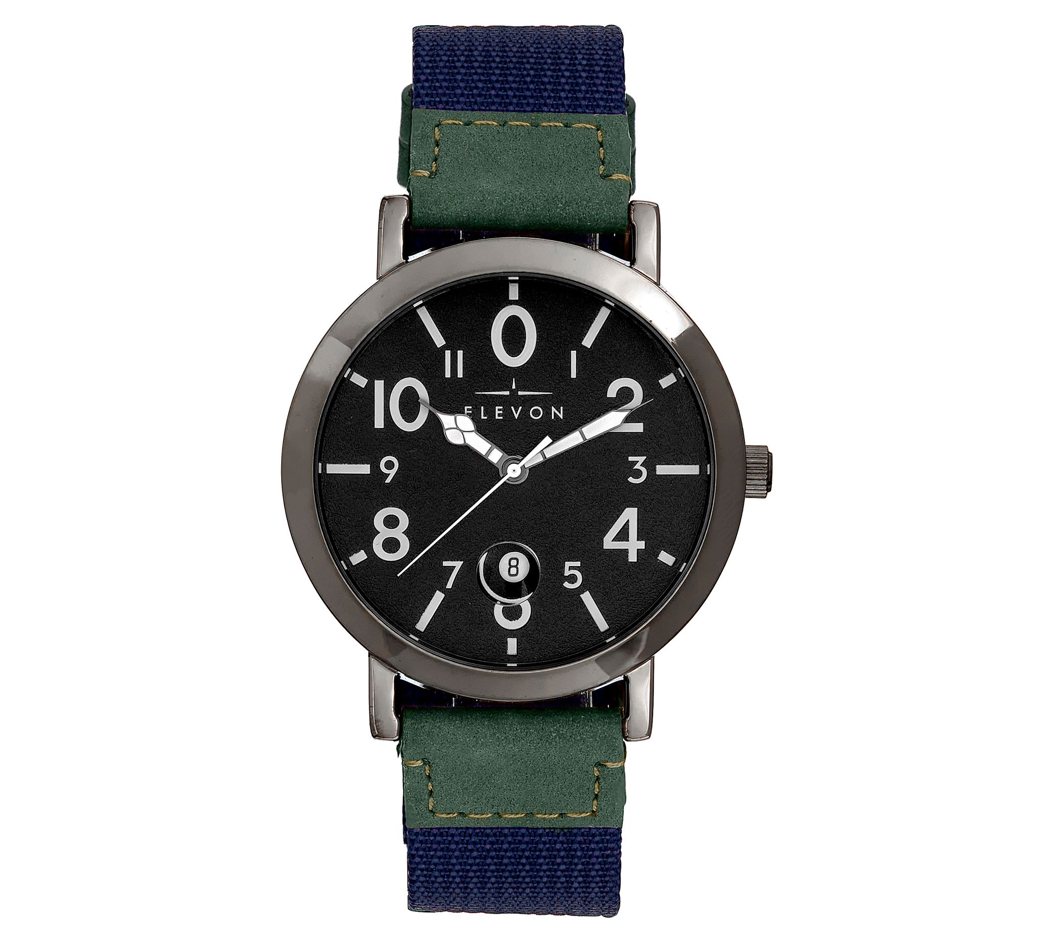 A laid-back look for your more casual days, this Mach 5 watch combines a bold dial design (with magnified date display) with a beige fabric strap. From Elevon.