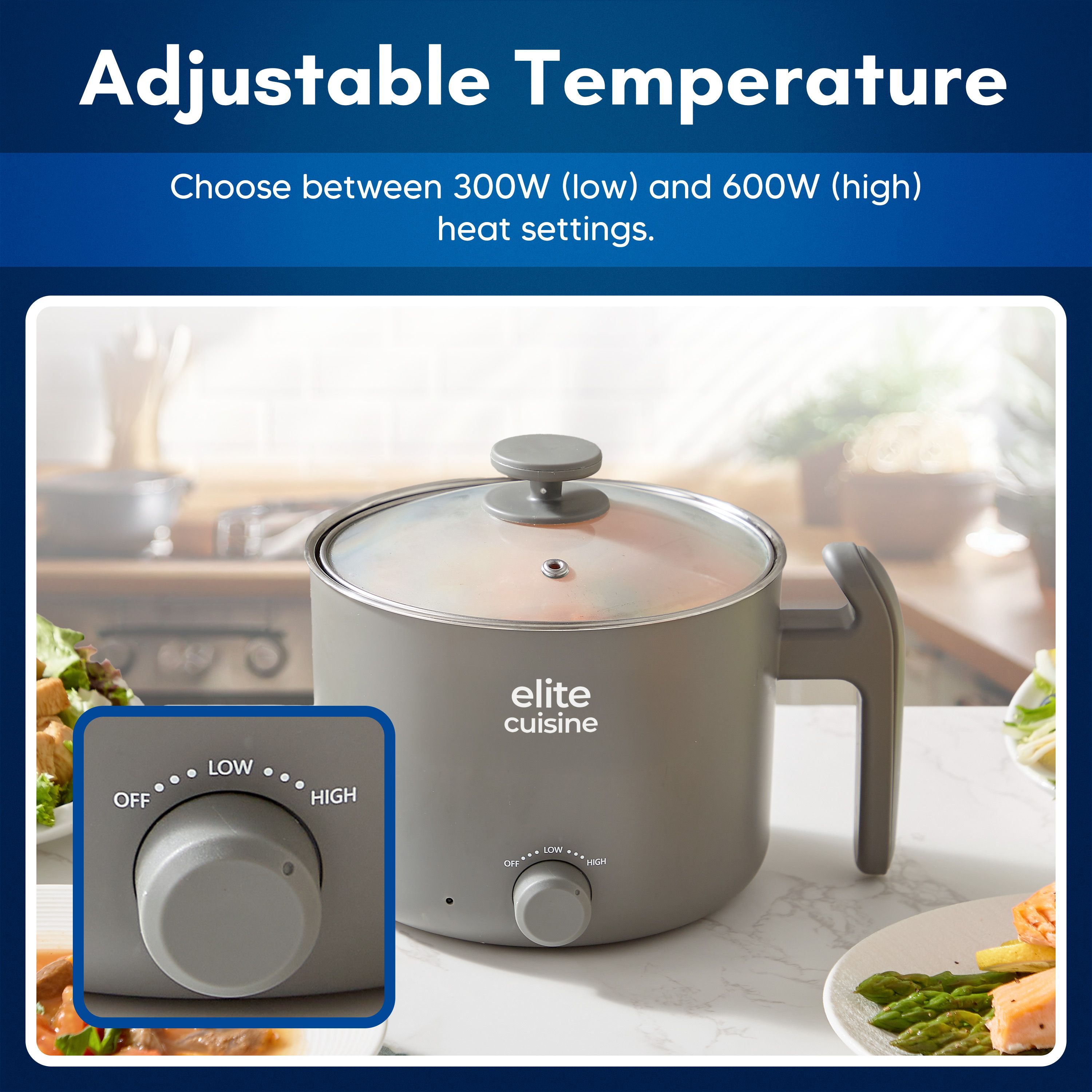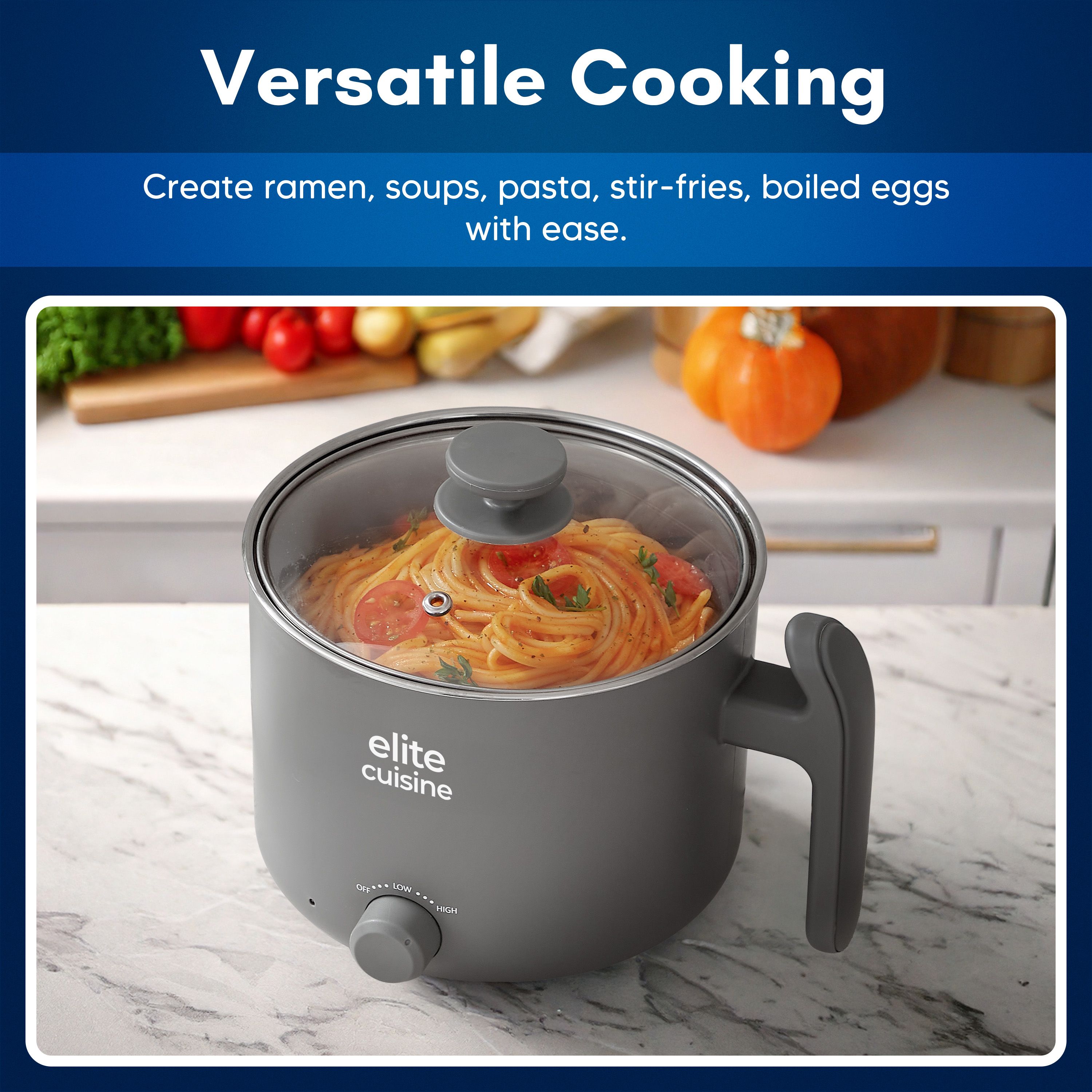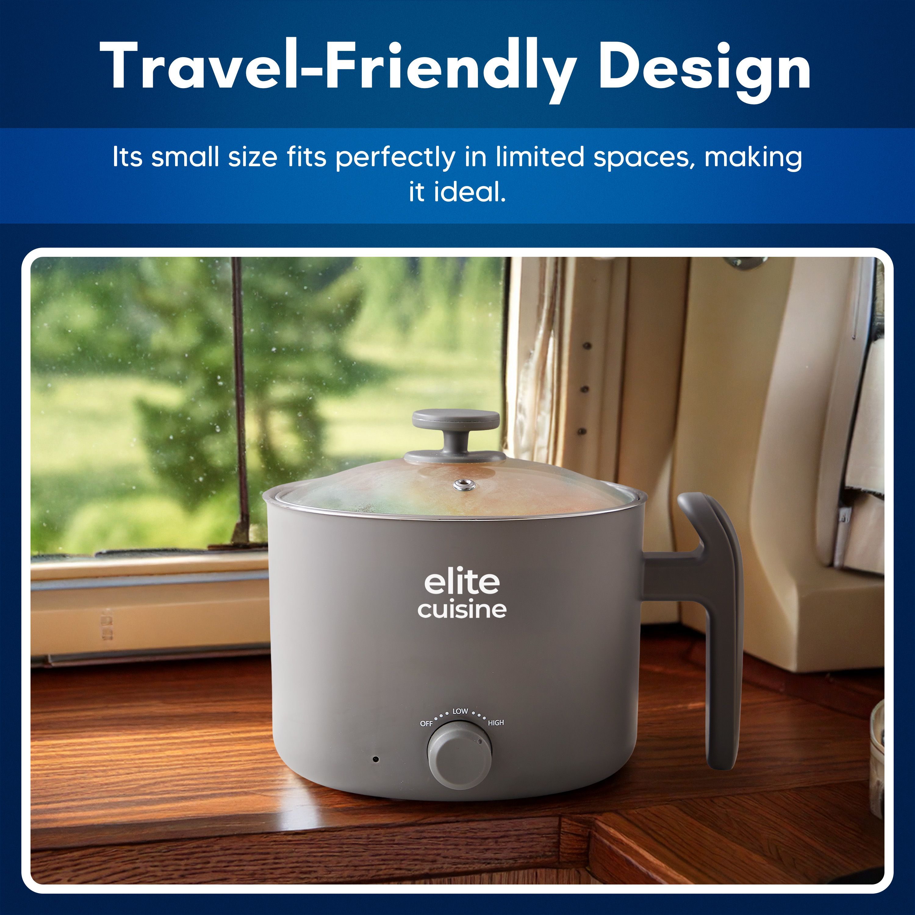 Whip up a cozy bowl of noodles, simmer savory soups, or boil eggs in minutes with this compact noodle express hot pot. Its adjustable heat settings and cool-touch handle make it a breeze for quick meals whether you're in a dorm, office, or on the road in your RV. From Elite Cuisine.