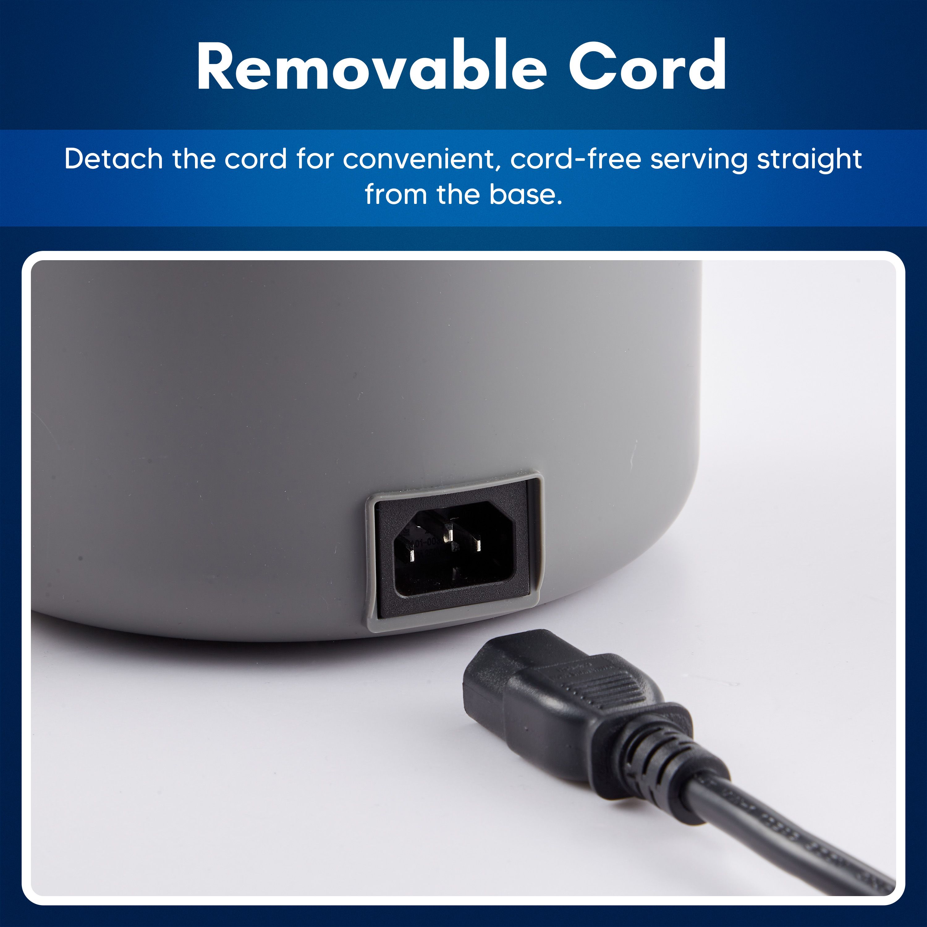 • Adjustable heat settings for simmering or boiling; concealed heating element; cool-touch handle; removable power cord; tempered glass lid with steam vent