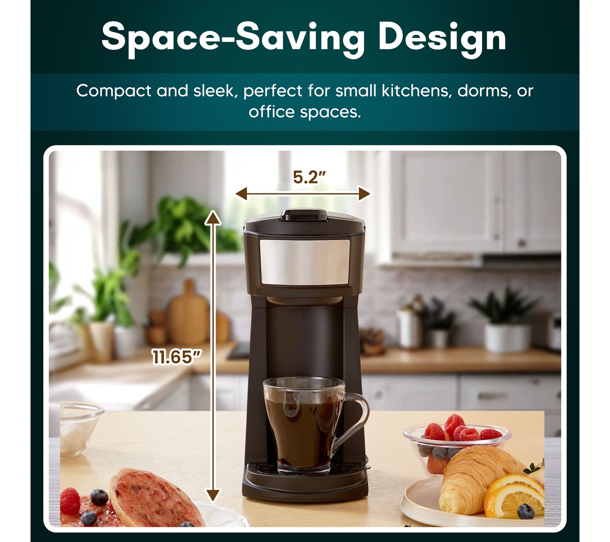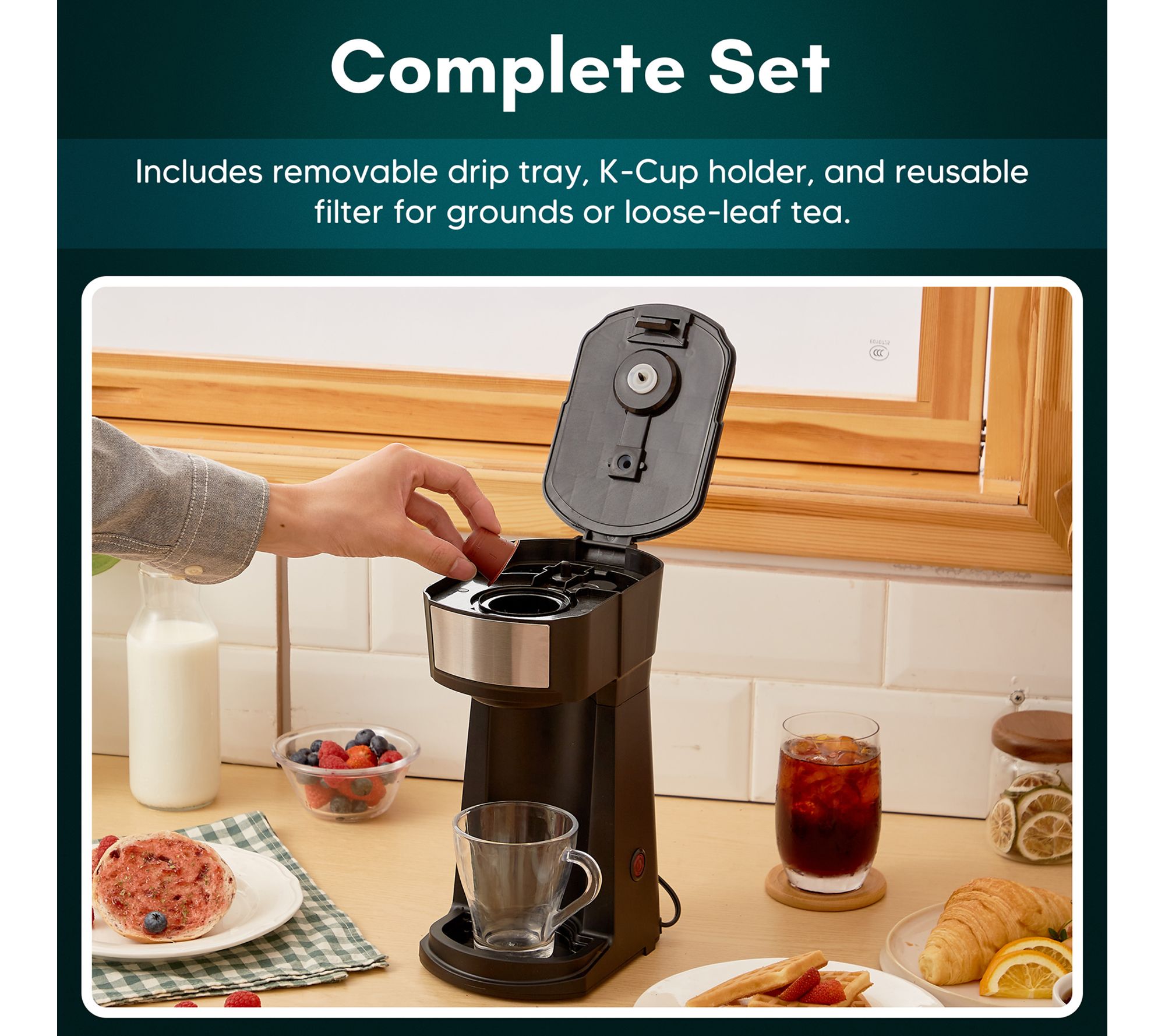 Brews iced or hot beverages using K-Cup®s, ground coffee, or looseleaf tea; compact and portable design; auto shut-off; top-rack dishwasher-safe parts except brewing base
