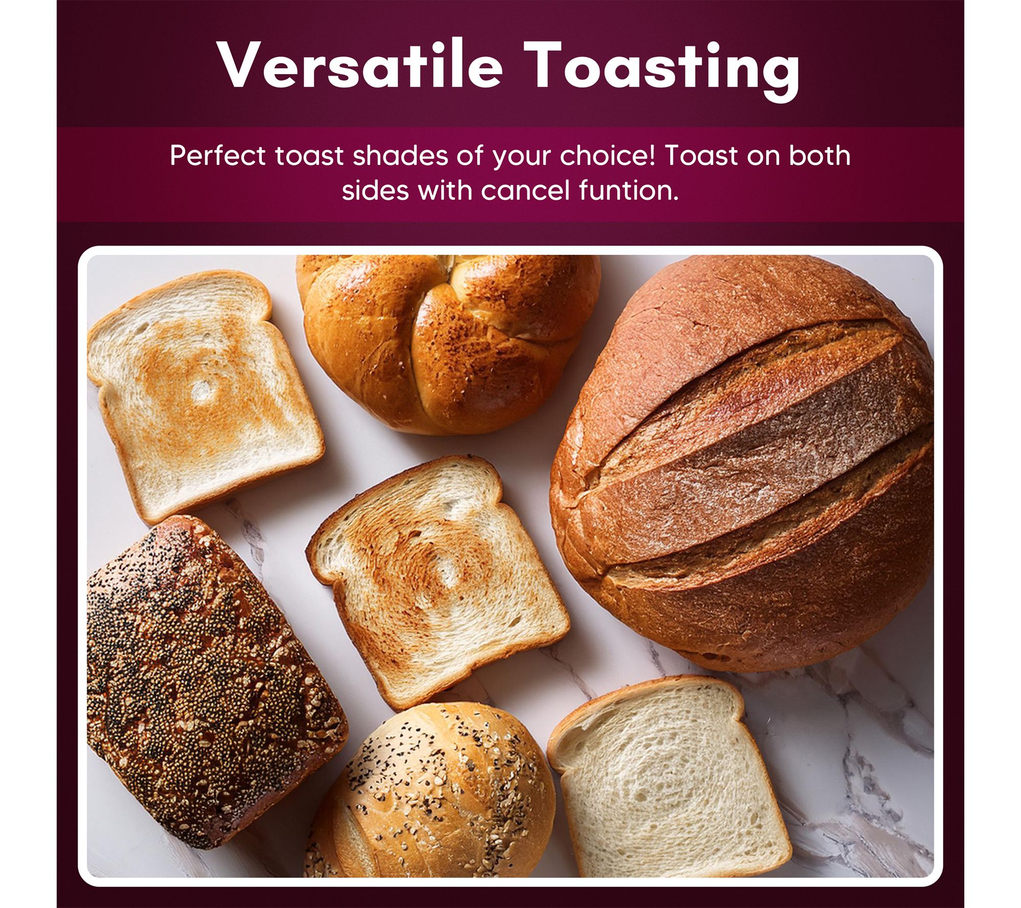 • Six variable toasting shades; cool-touch exterior; lever for easy removal; cancel function; drop-down crumb tray; auto shut off