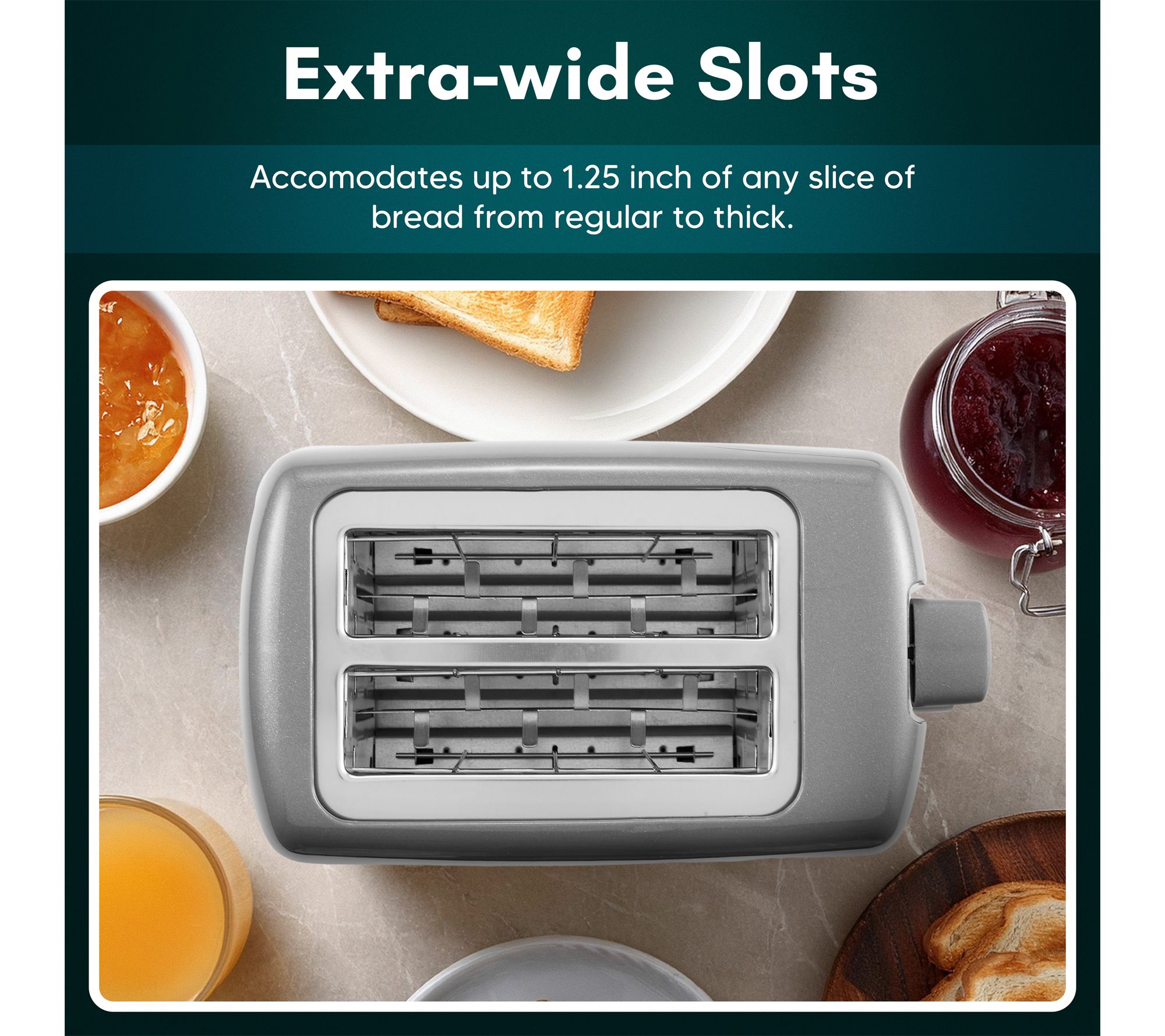 • Extra-wide 1.25" slots fit bread, muffins, waffles, and bagels