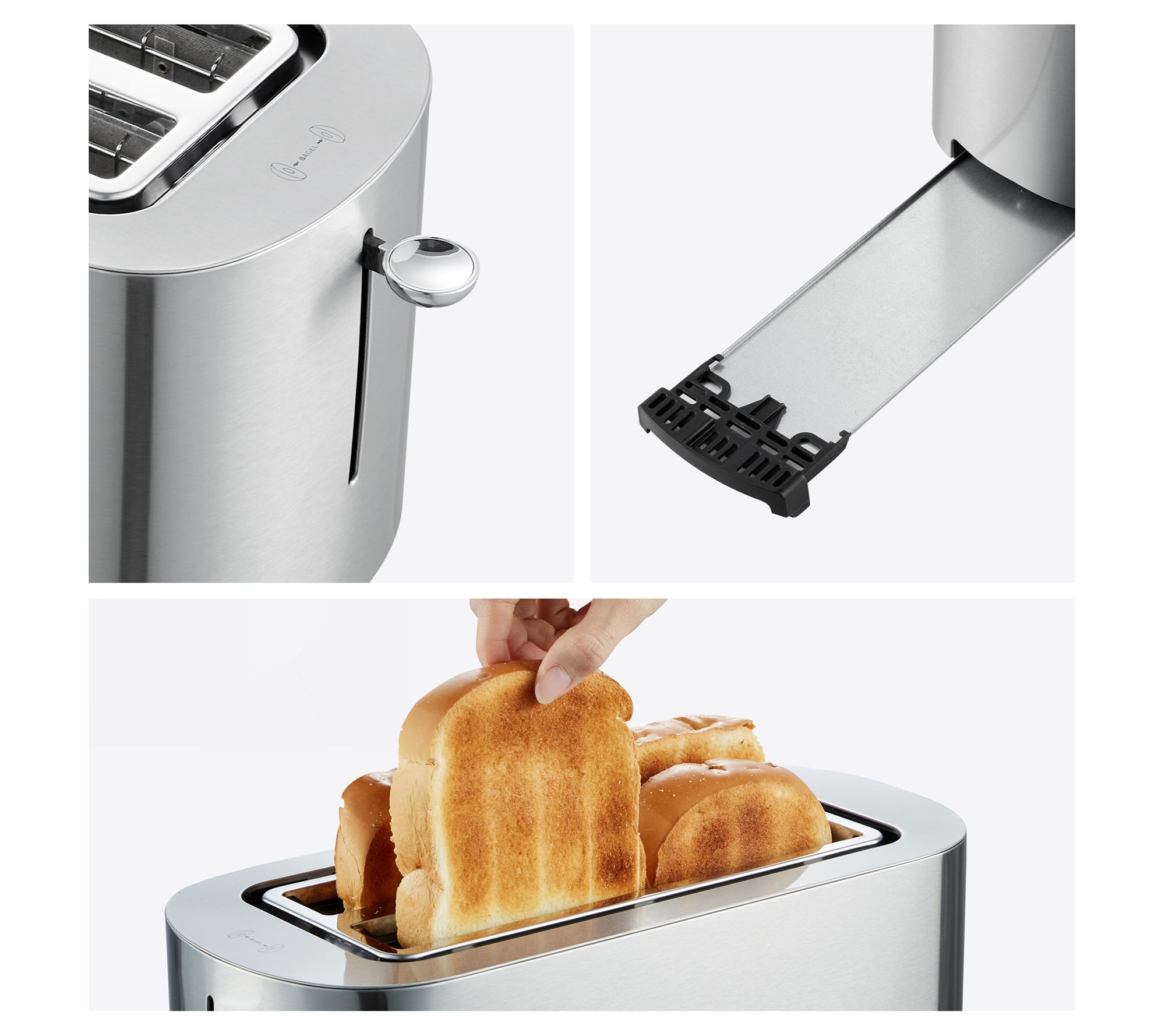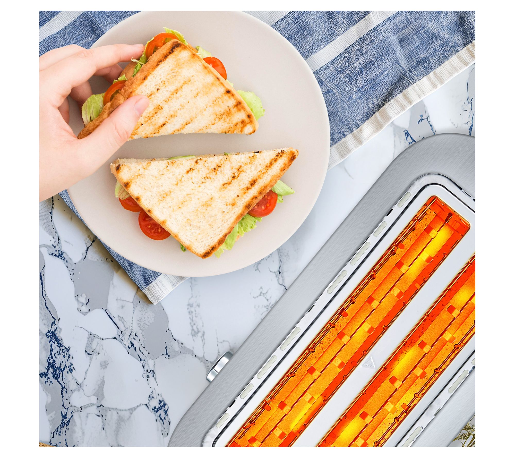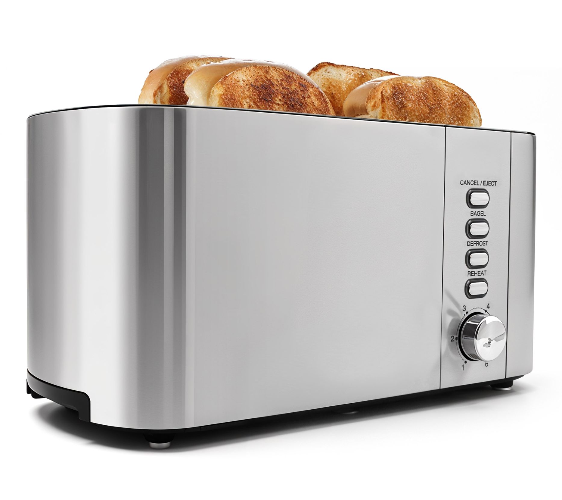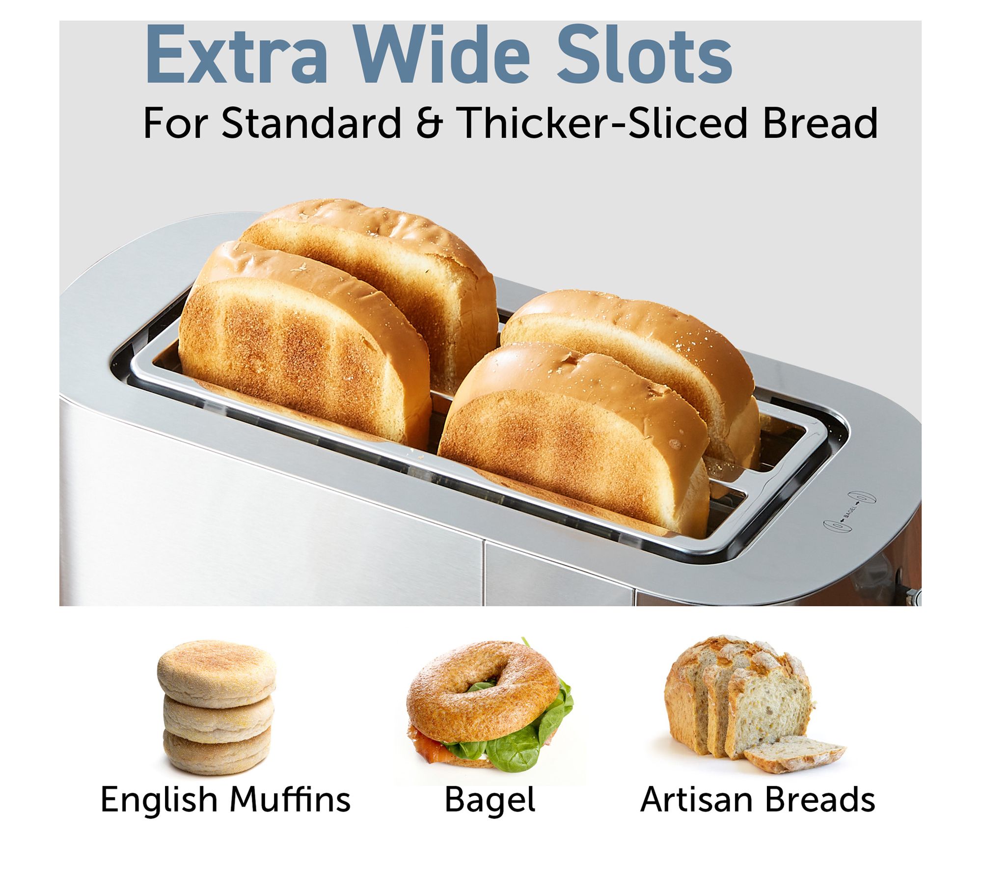 Enjoy perfectly toasted bread every time with this toaster. With extra-large slots and six adjustable toasting levels, you can toast everything from thick slices to bagels just the way you like it. Its one-touch buttons and reheat function make it a convenient addition to any kitchen. From Elite Cuisine.