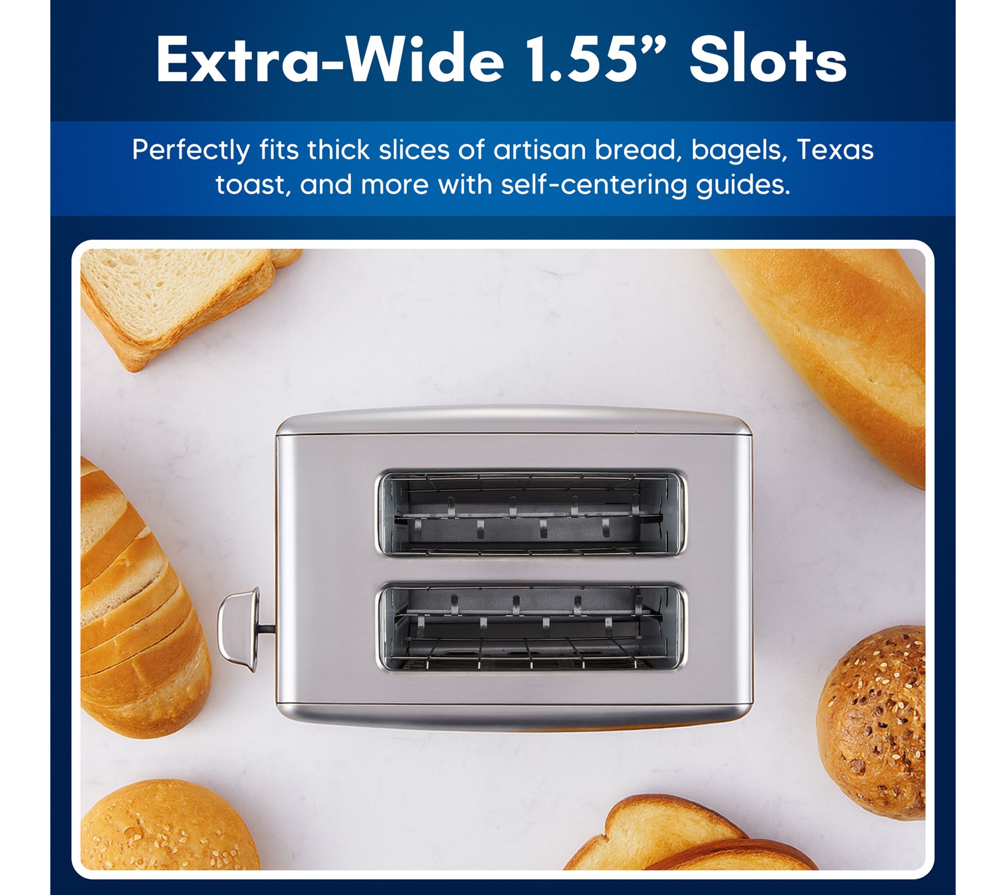 • Extra-wide 1.55" slots accommodate thick breads, bagels, waffles, pastries, and more