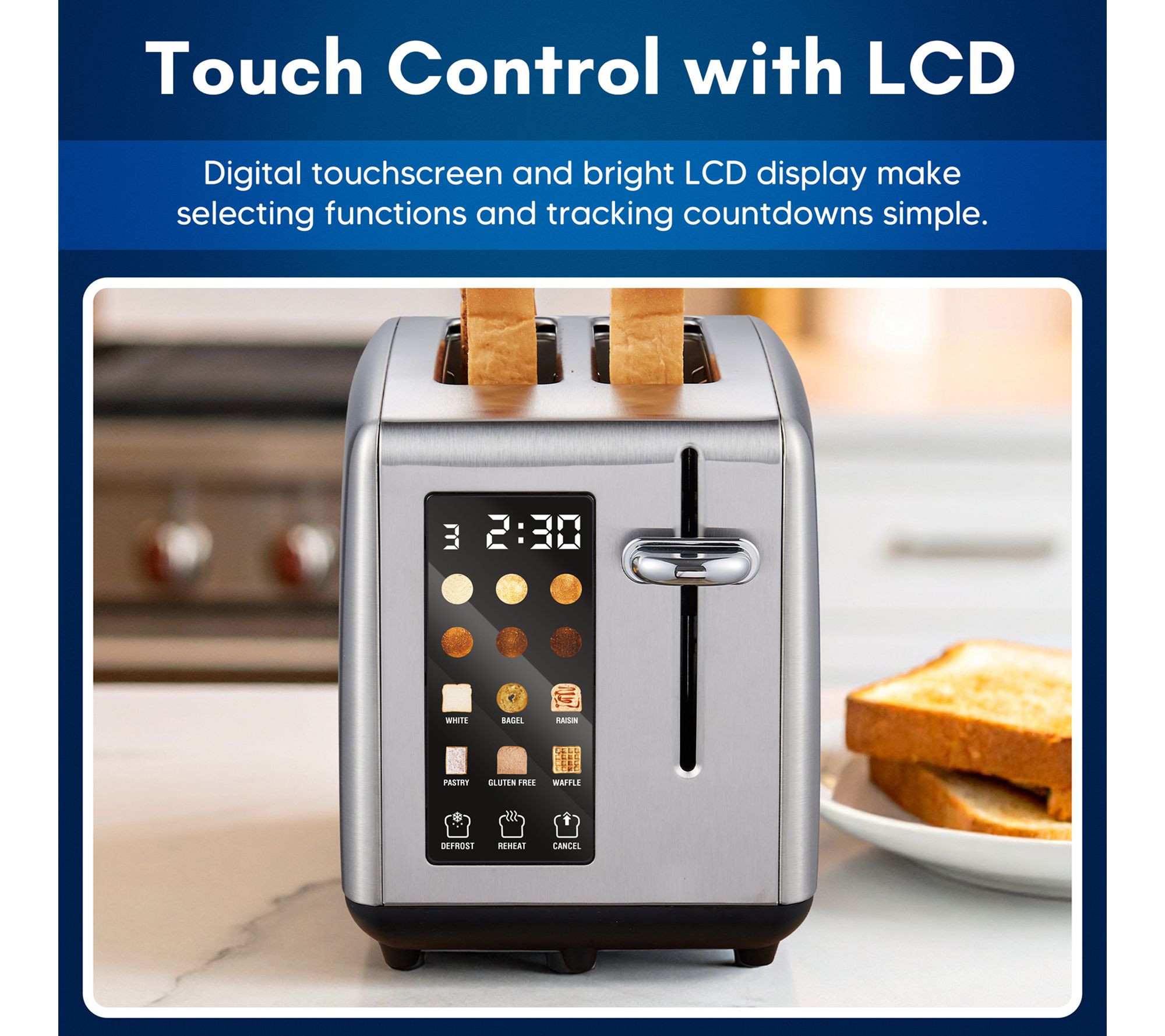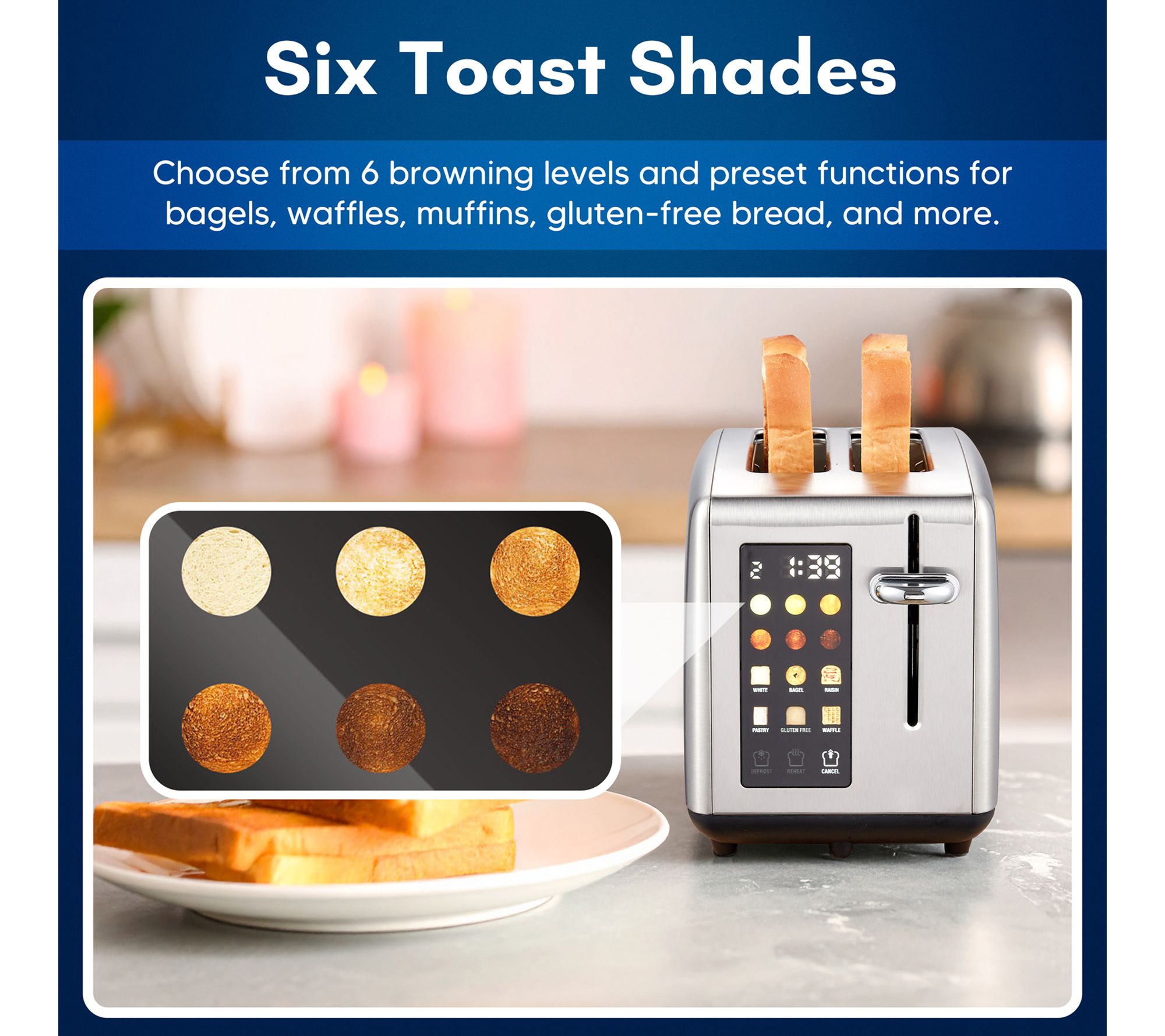 • Settings for white bread, bagel, raisin bread, pastry, gluten-free, waffles, defrost, and reheat