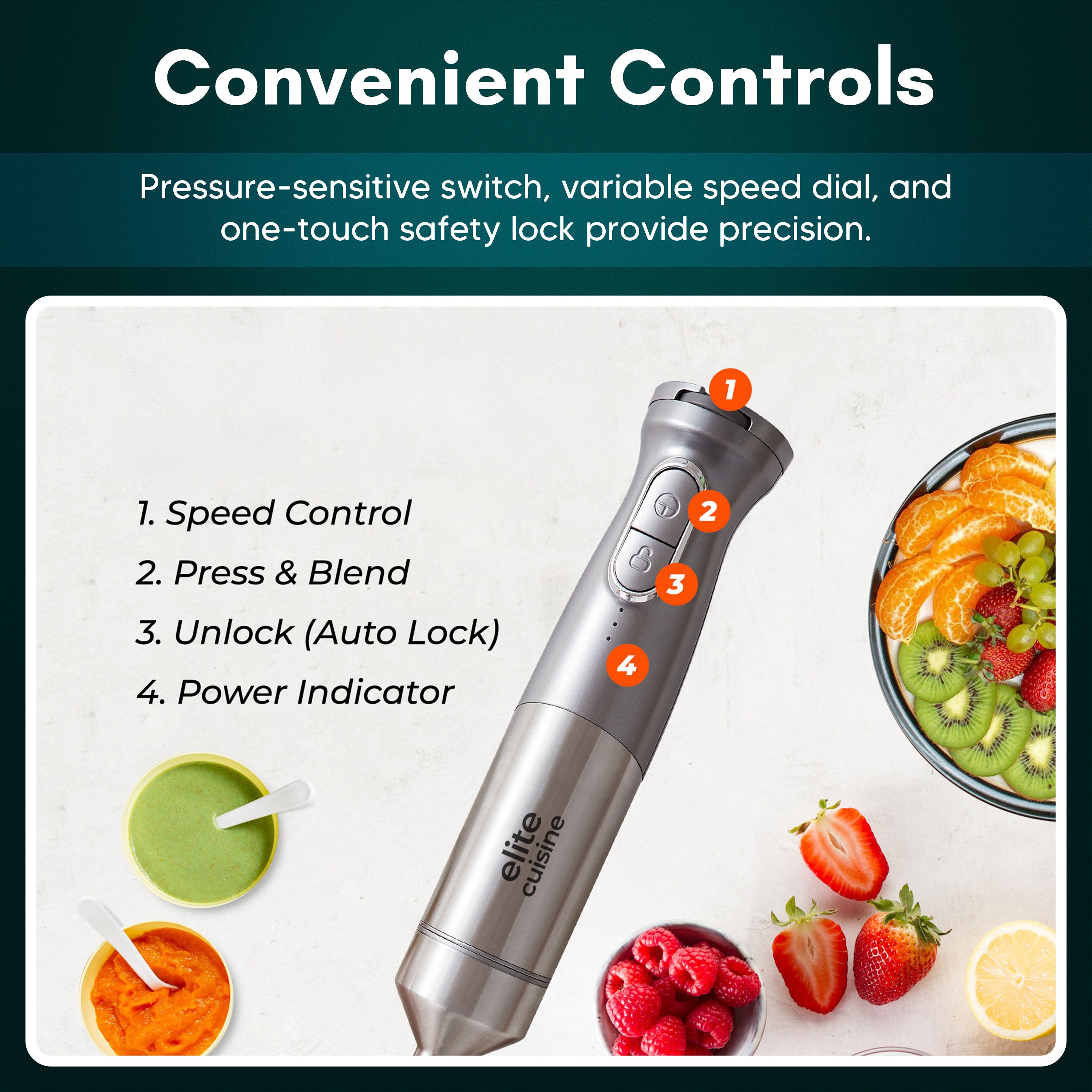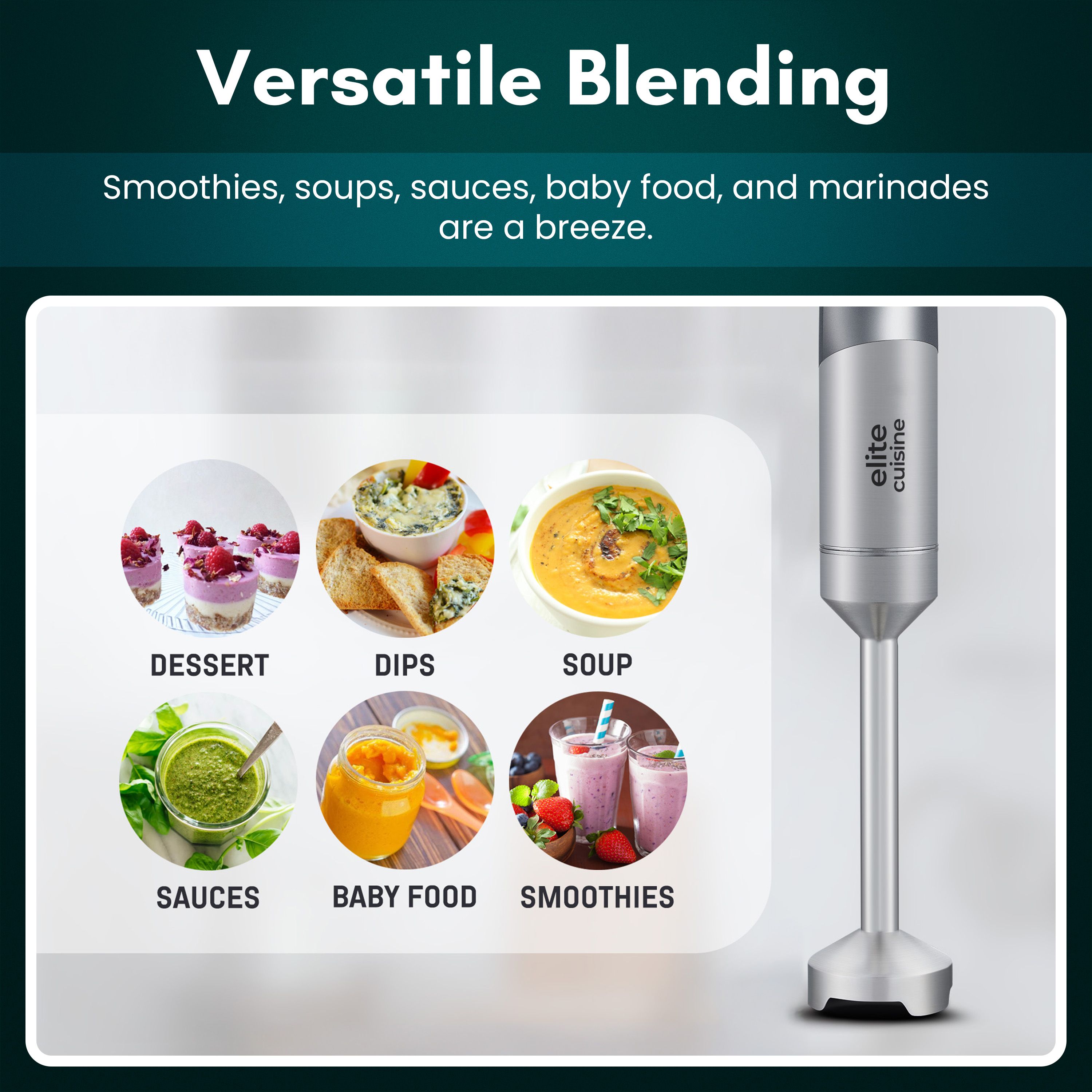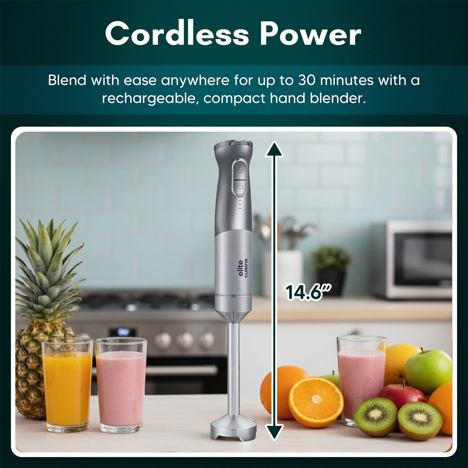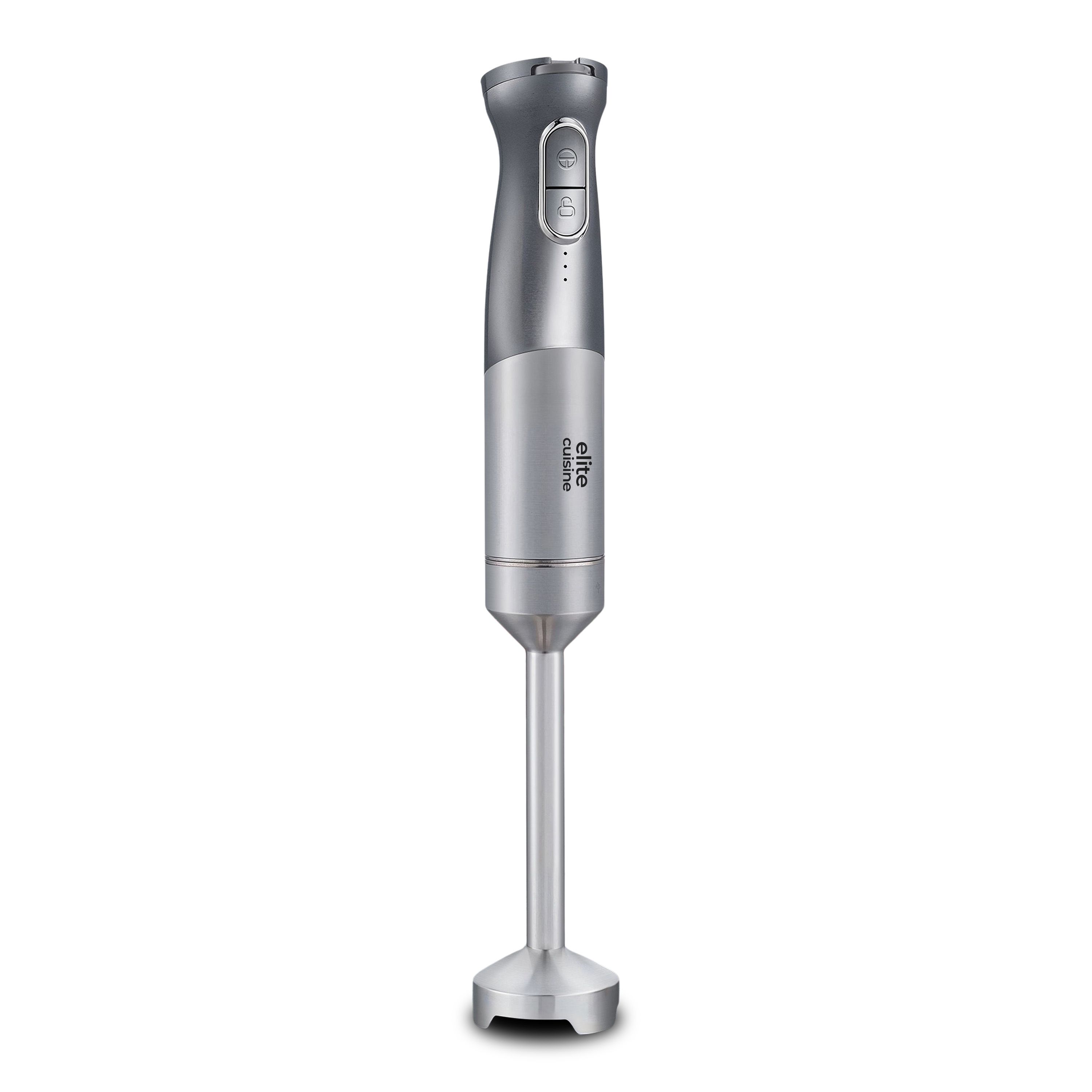 Whip up creamy soups, silky smoothies, and fresh salsas in moments with this cordless hand blender. Its lightweight, ergonomic design and powerful motor make meal prep effortless, whether you're blending in a pot or mixing in a bowl. Enjoy up to 30 minutes of blending per charge and five adjustable speeds for every kitchen task. From Elite Cuisine.