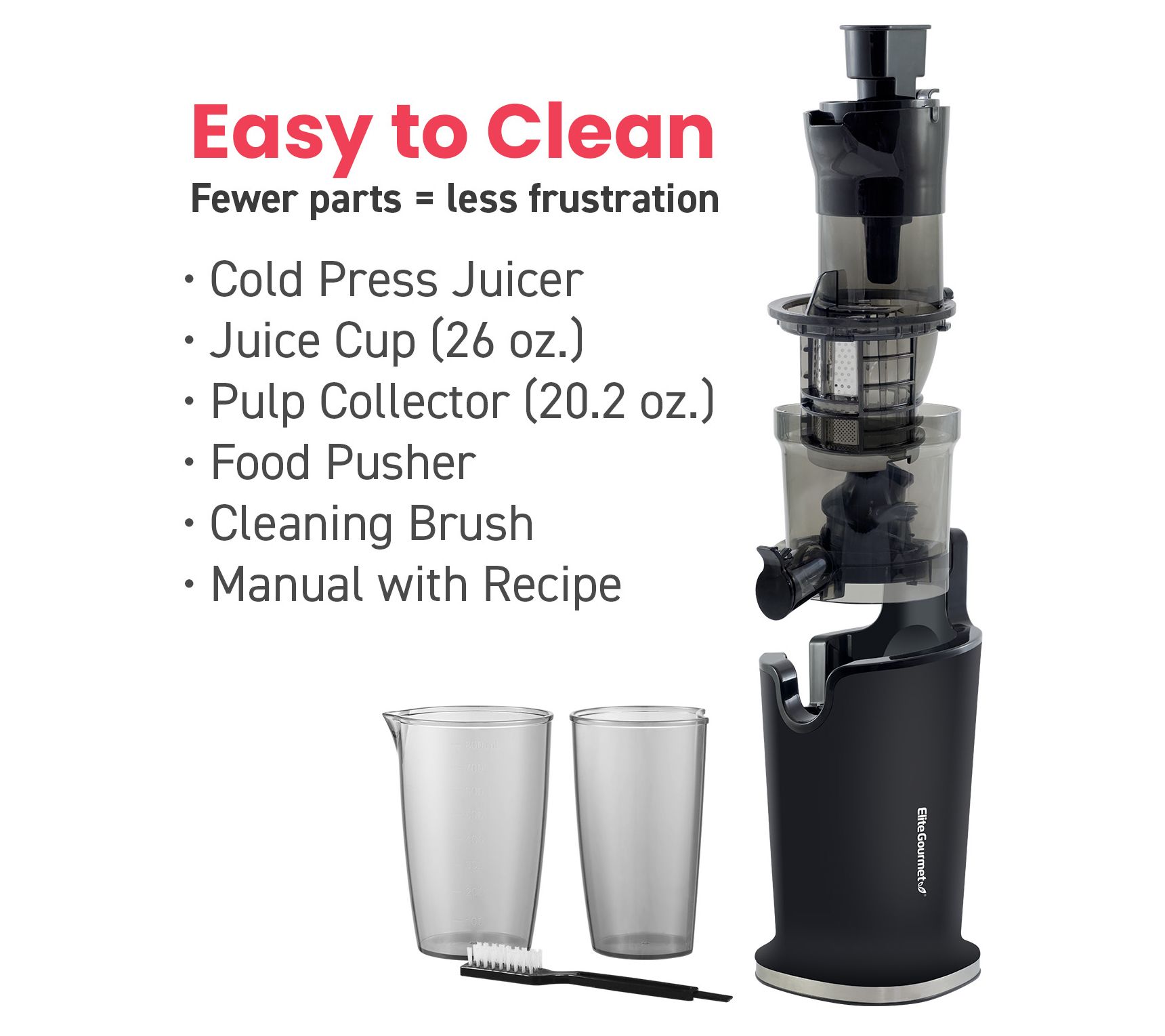 • Includes EJX017X juicer assembly, 26-oz juice cup, pulp cup, and cleaning tool