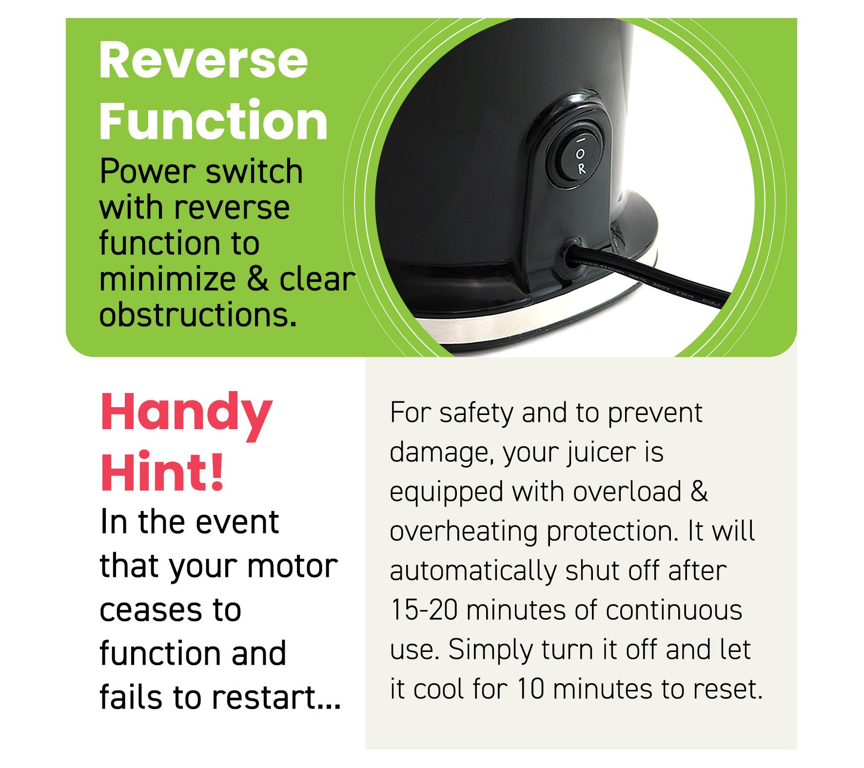 • Feeding chute accepts up to 3" whole fruits and vegetables