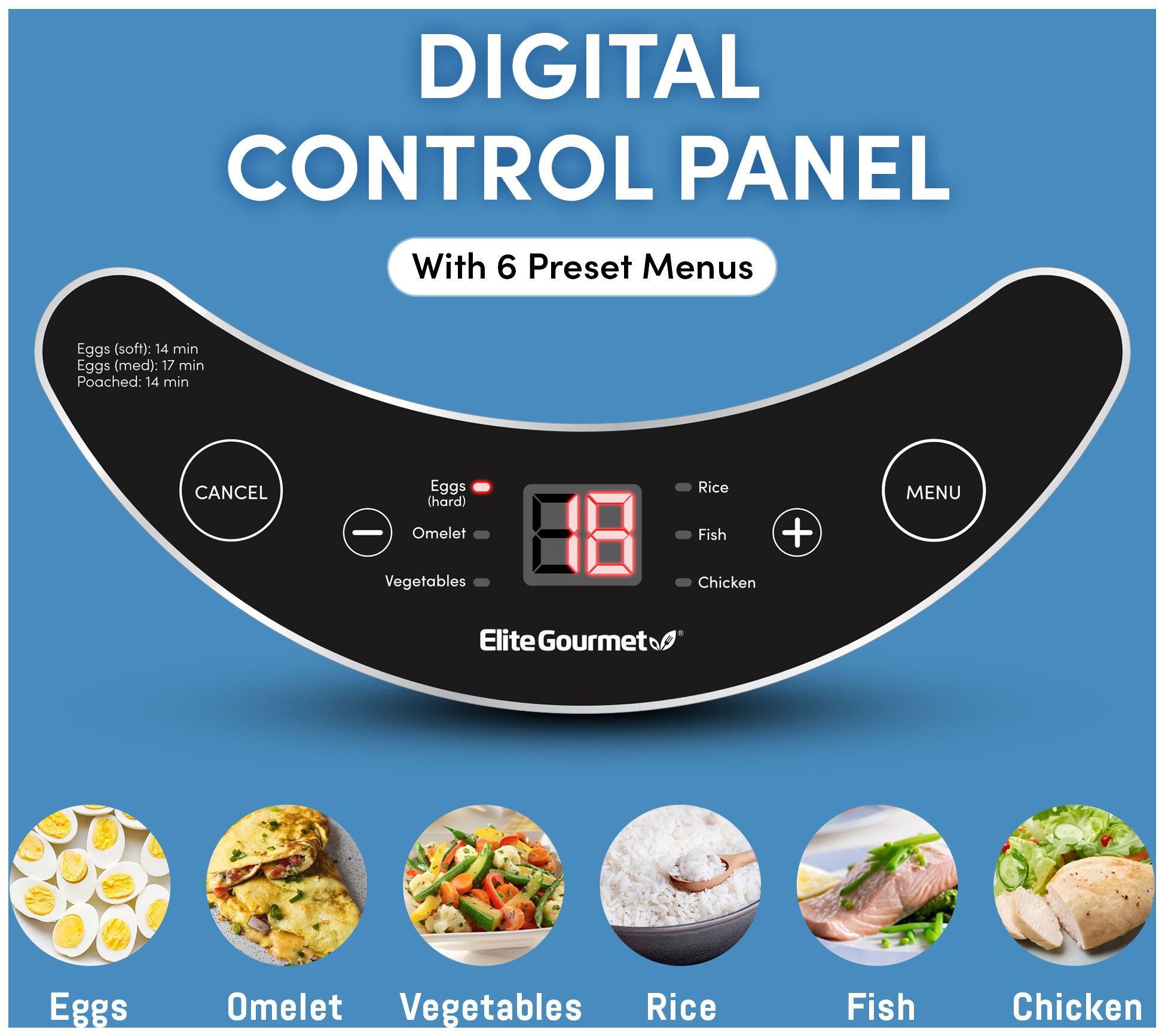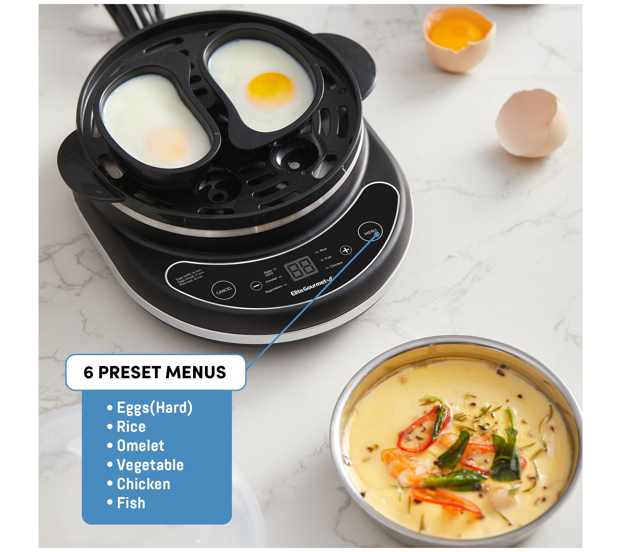 • Six presets: boiling eggs, omelets, steaming fish, vegetables, chicken or rice