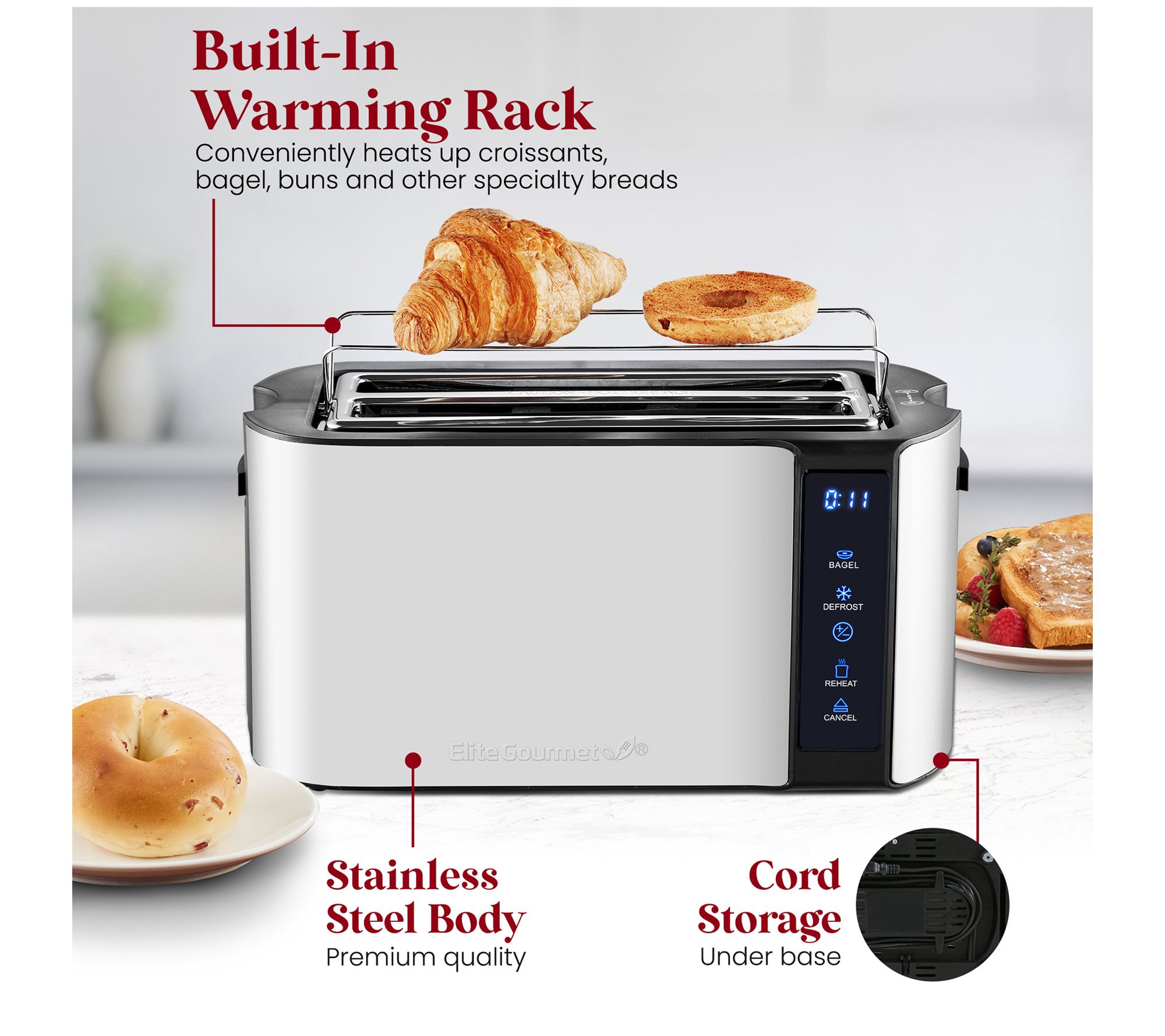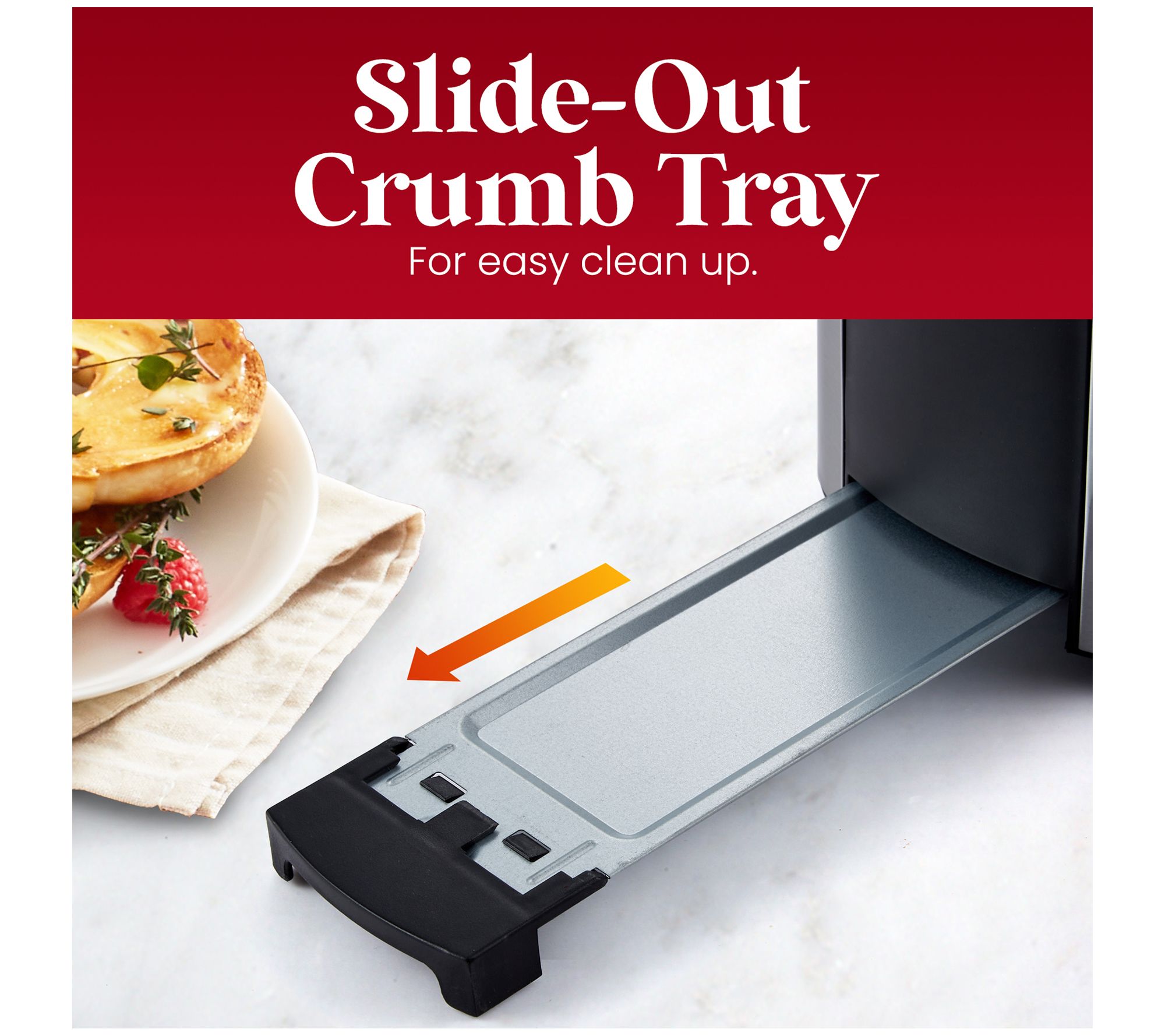 • Cord storage; slide-out crumb tray