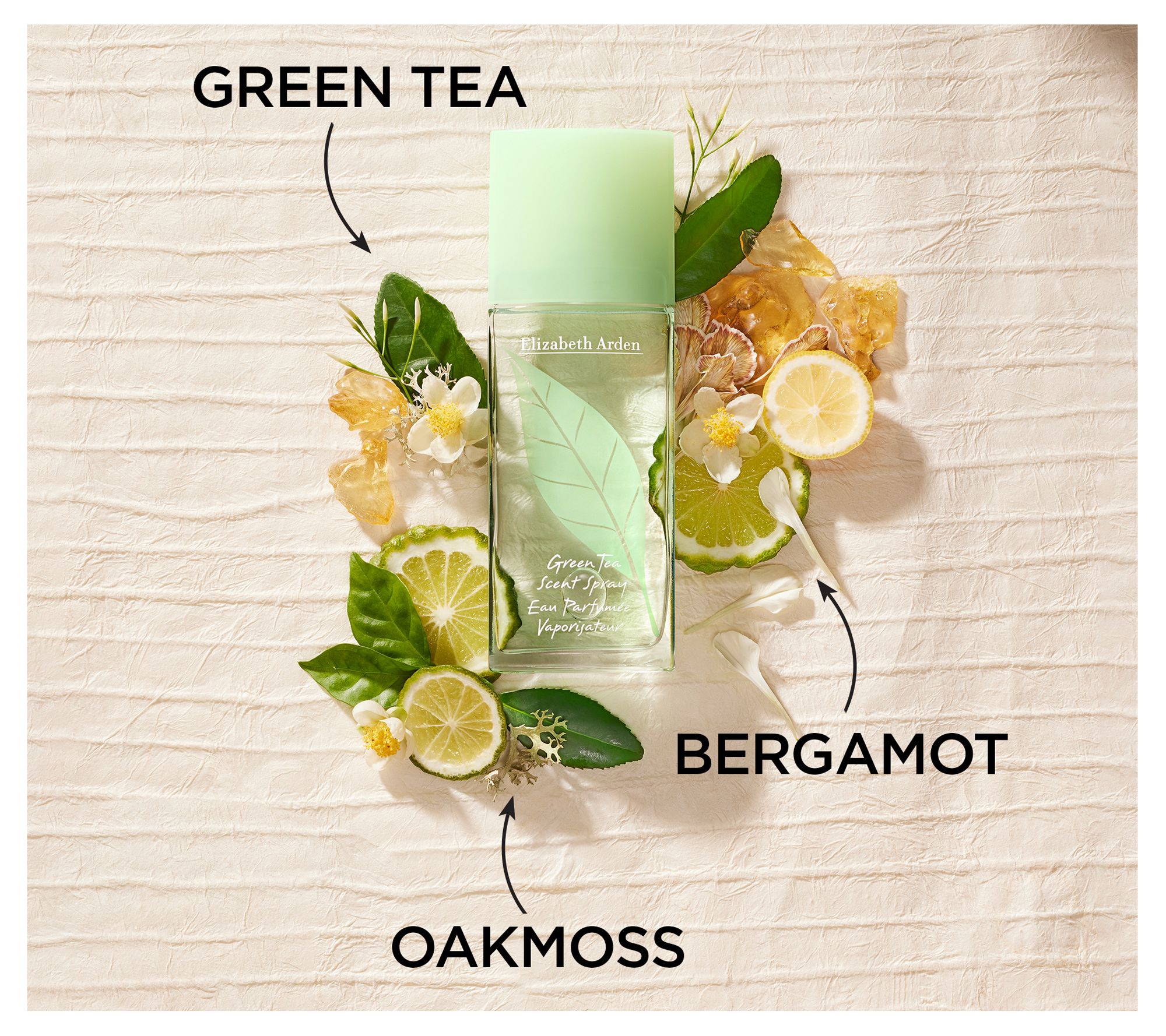 Elizabeth Arden's invigorating perfume is inspired by green tea to awaken your senses. The fragrance opens with bright bergamot and lemon at the top, green tea, jasmine, and celery at its heart. Balanced with amber, musk, and oakmoss at the base for a refreshing and harmonizing scent.