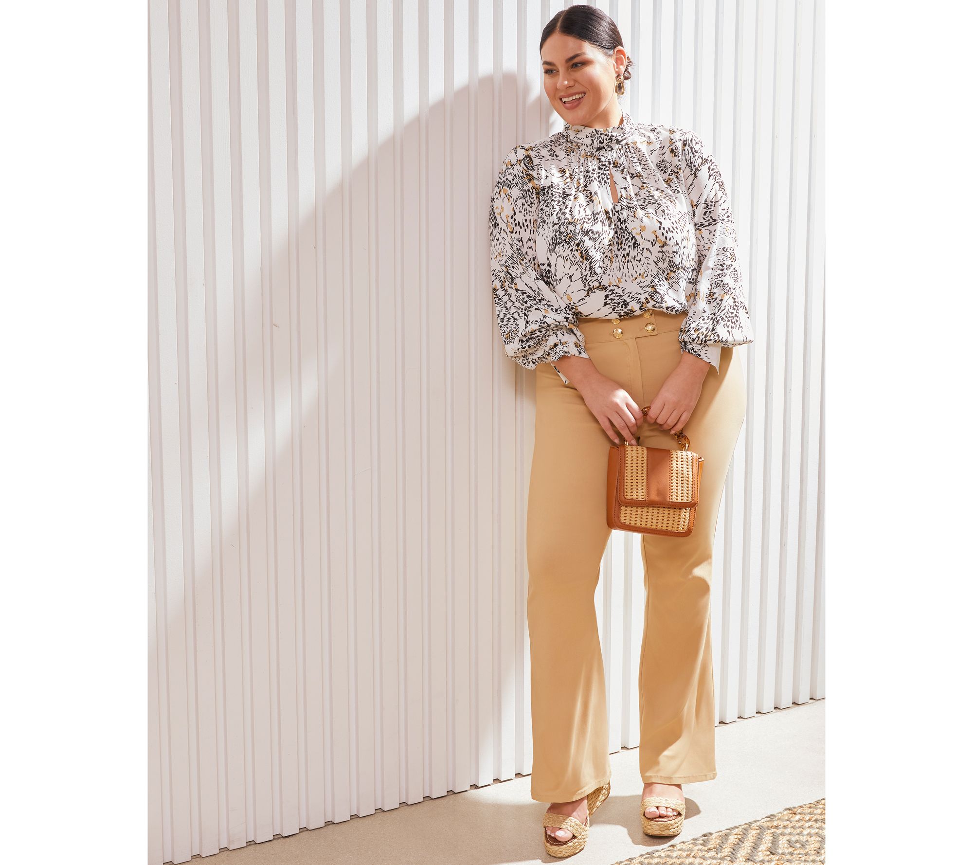 Featuring a modern, stretchy fit and fun flared legs, these twill pants flatter your curves and pair perfectly with anything from an office-appropriate blouse to a sweater. From Ella Rafaella.
