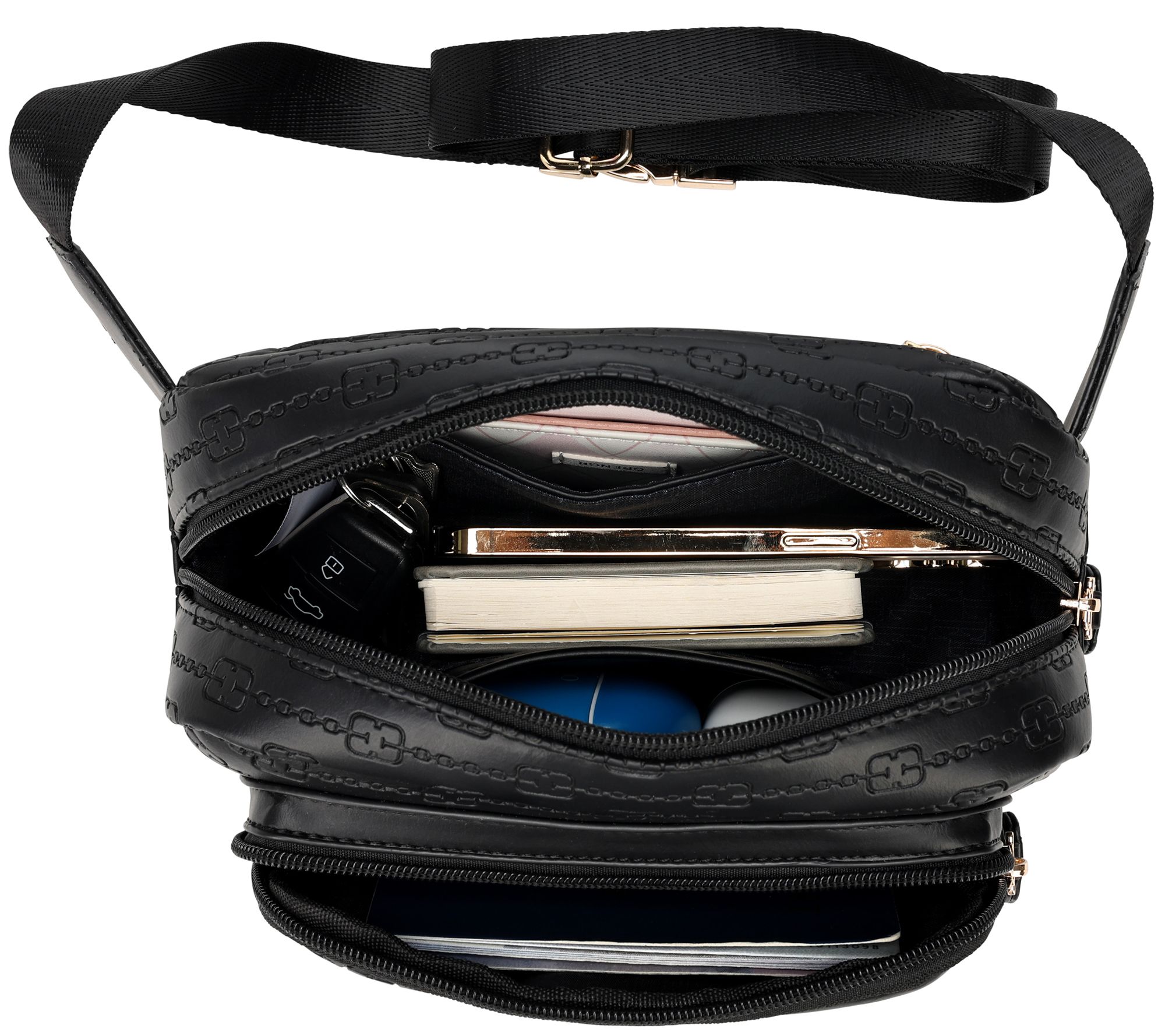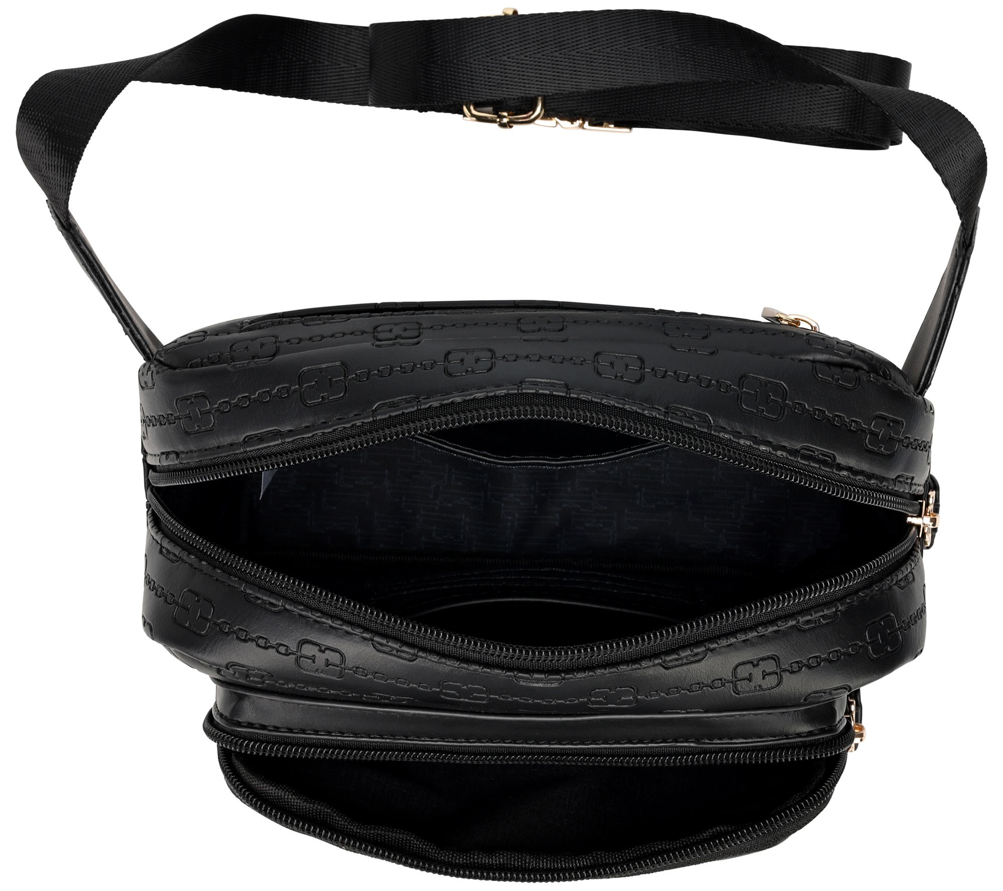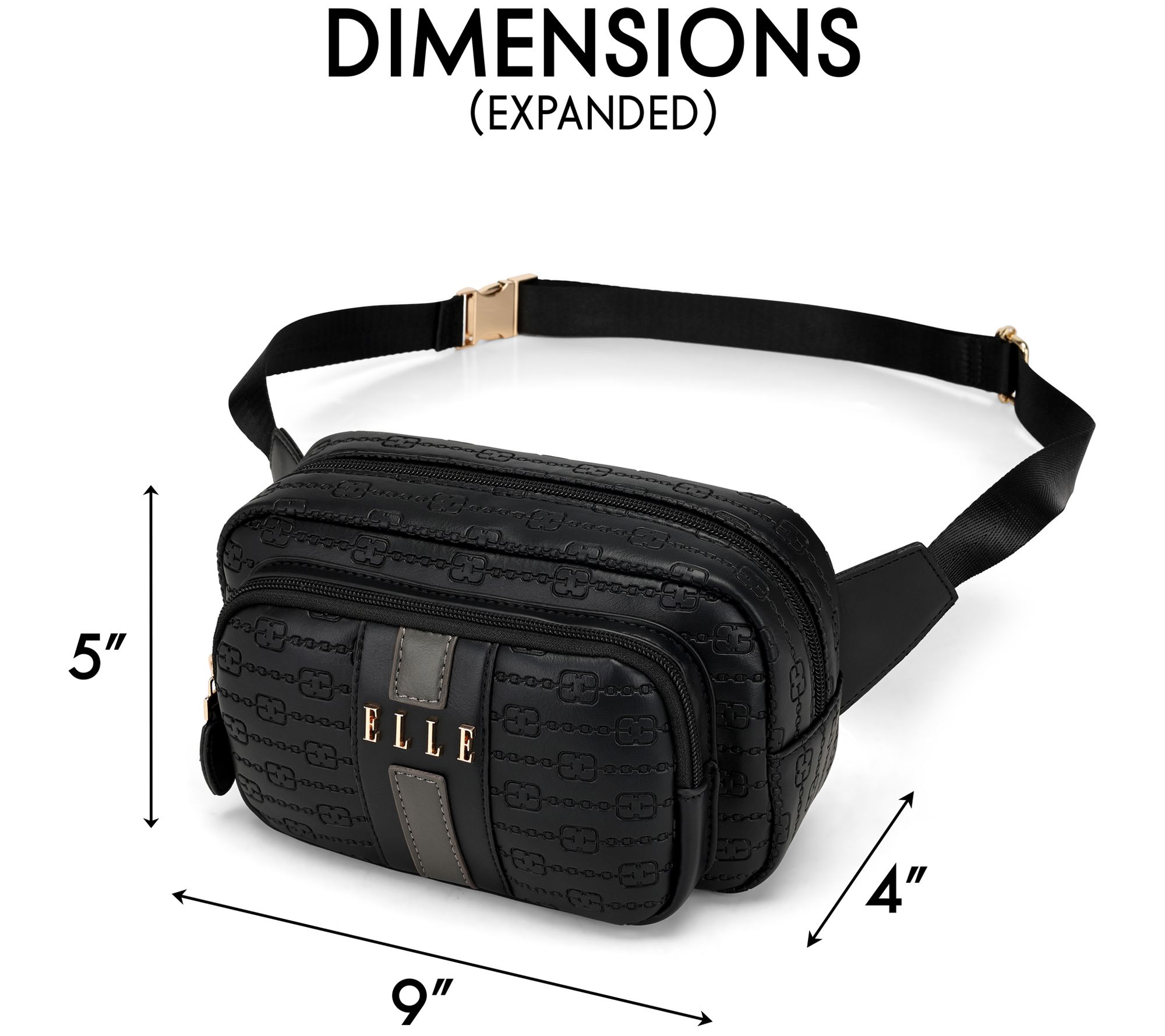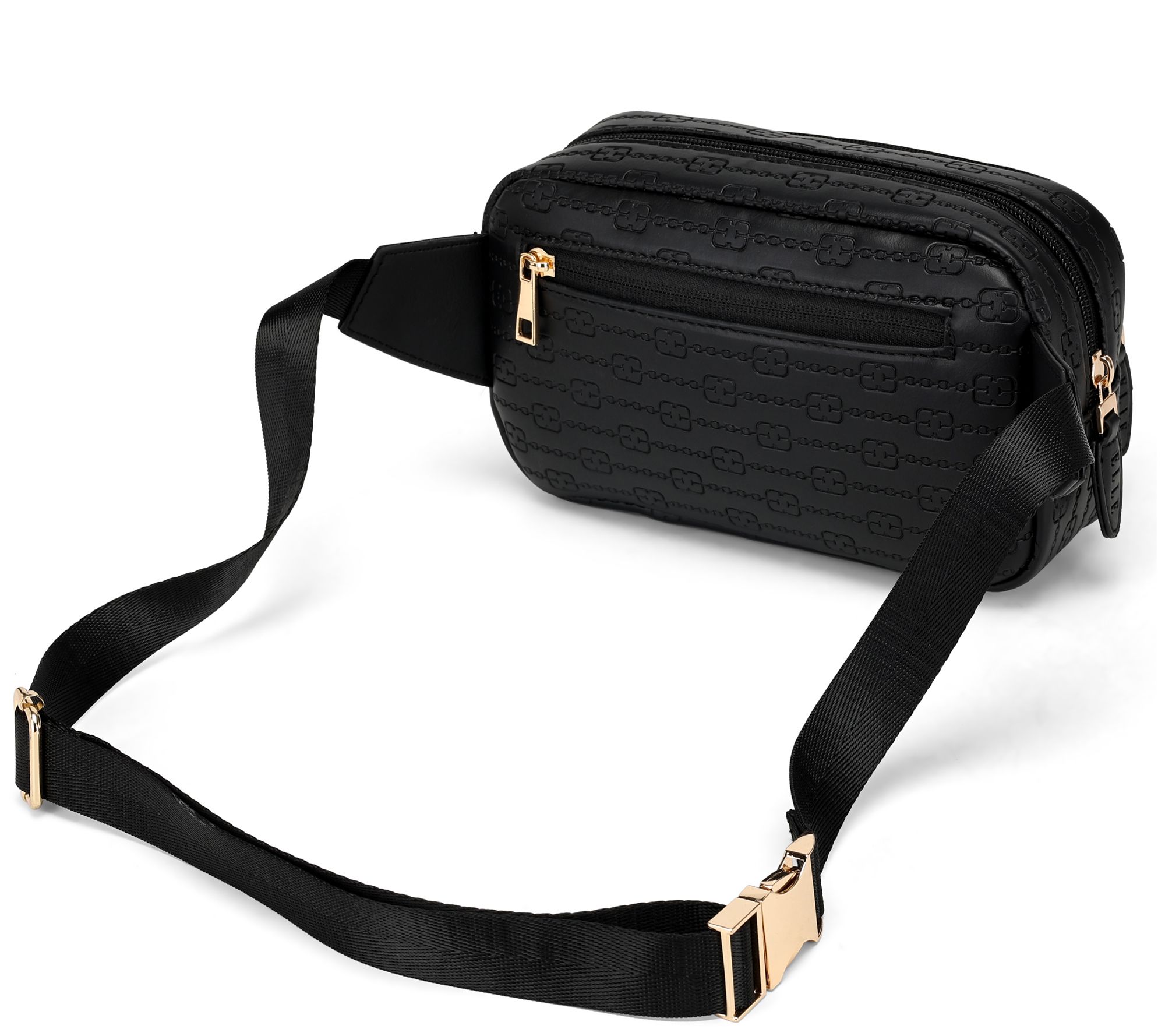 • Adjustable strap, front zip pocket, rear zip pocket, zip top closure, goldtone hardware