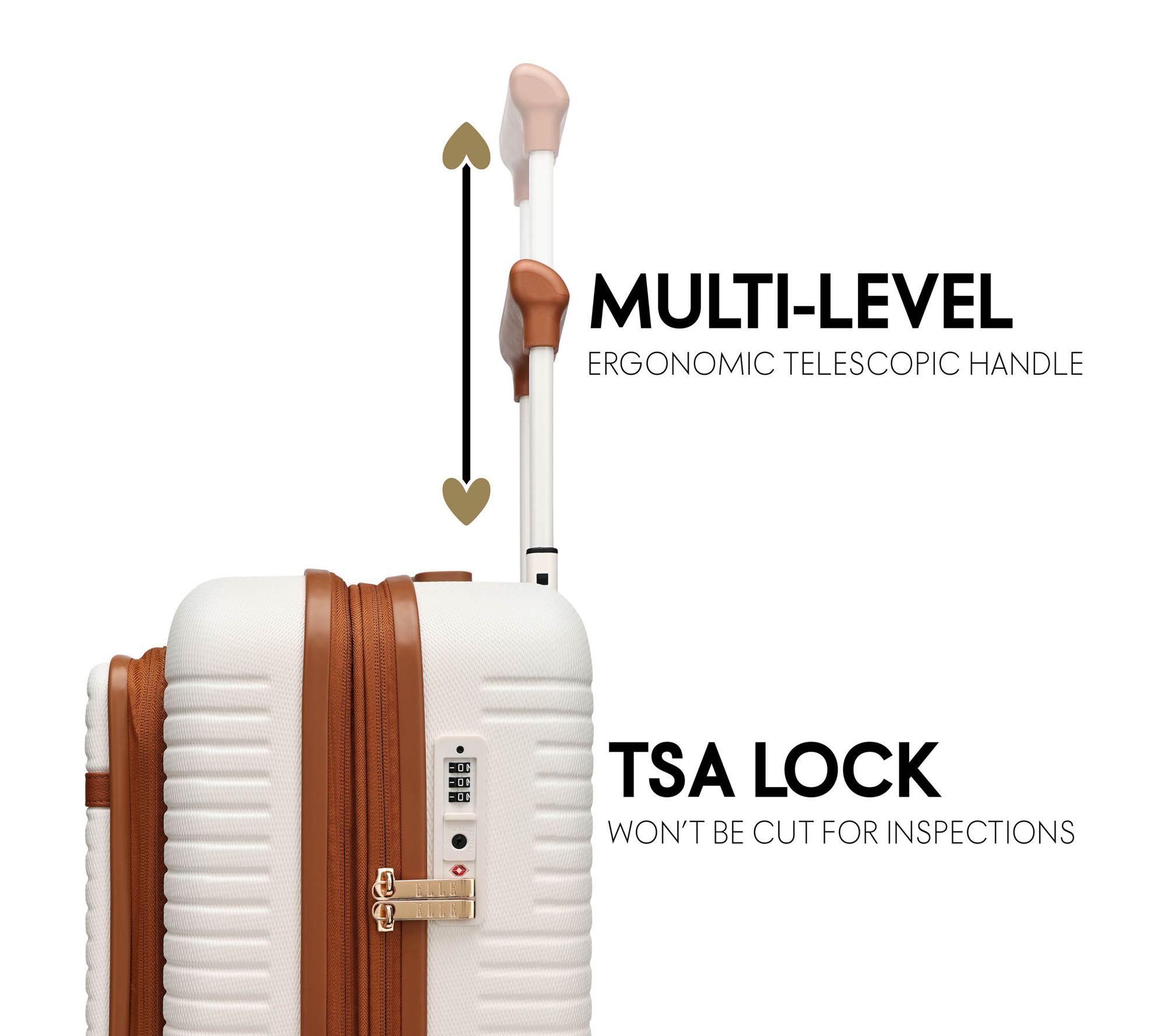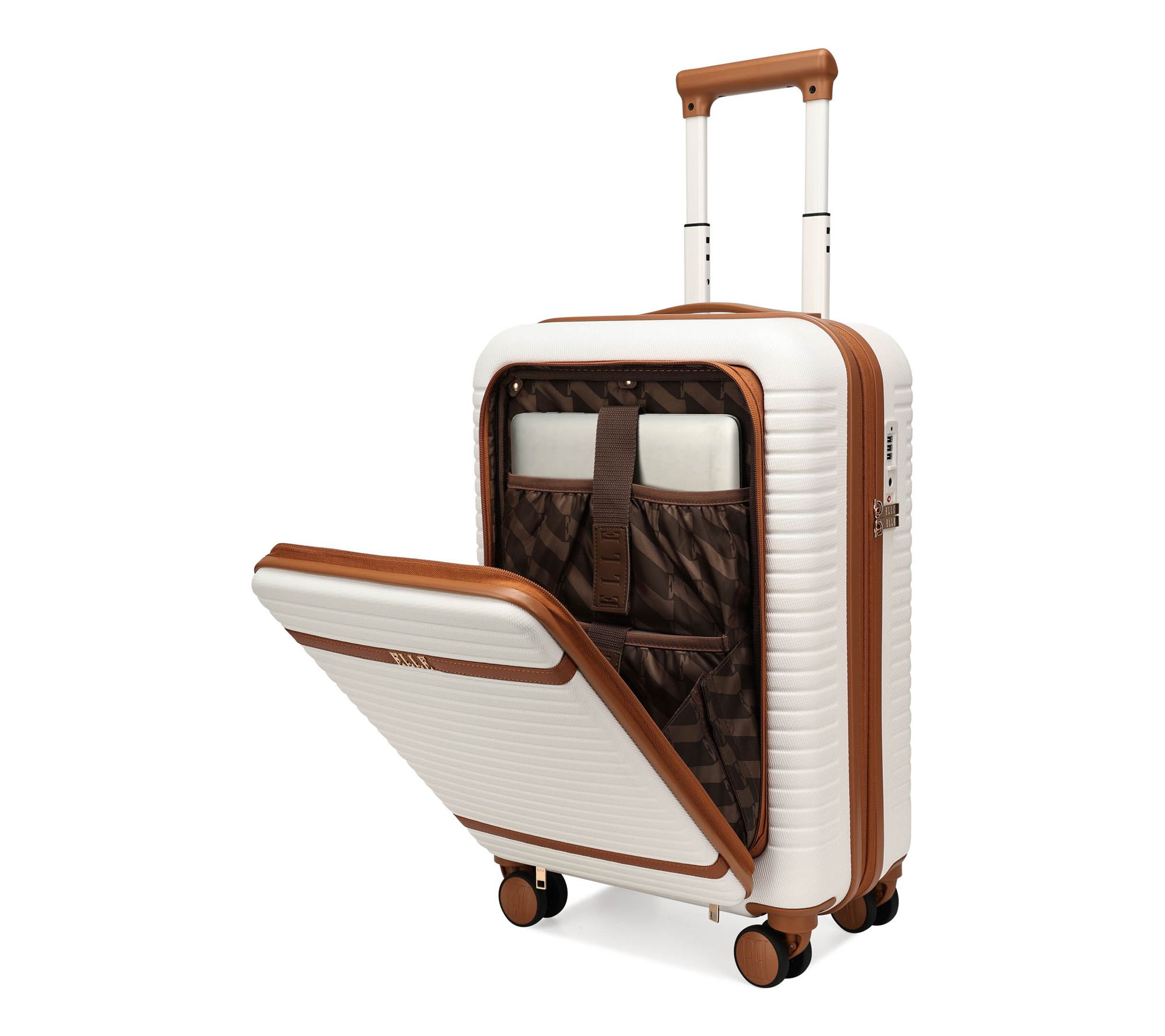 Travel in style and simplicity with the ELLE Escape expandable 22" carry-on with front laptop pocket. The premium polycarbonate and ABS shell helps keep your belongings secure, while the lightweight design and smooth spinner wheels make navigating airports a breeze. From ELLE.