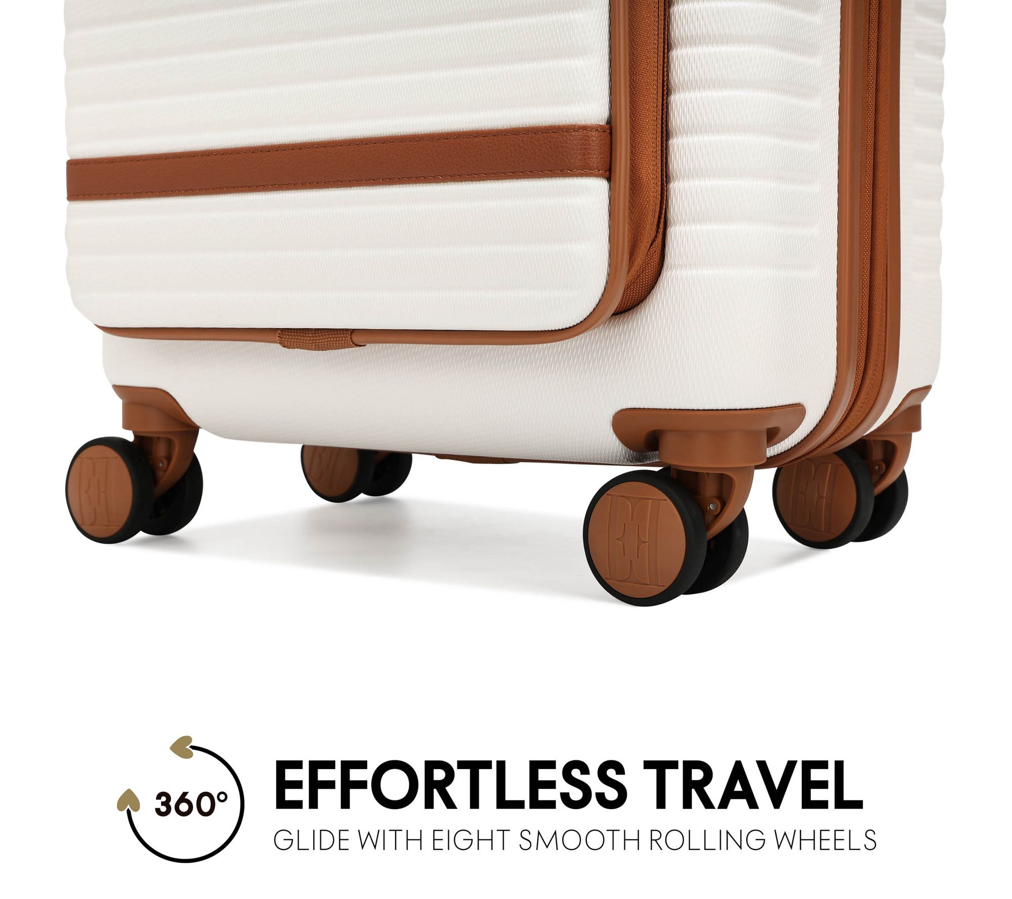 • Polycarbonate-ABS exterior; eight spinner wheels; trolley handle with extension up to 19"; additional 1" handle drop