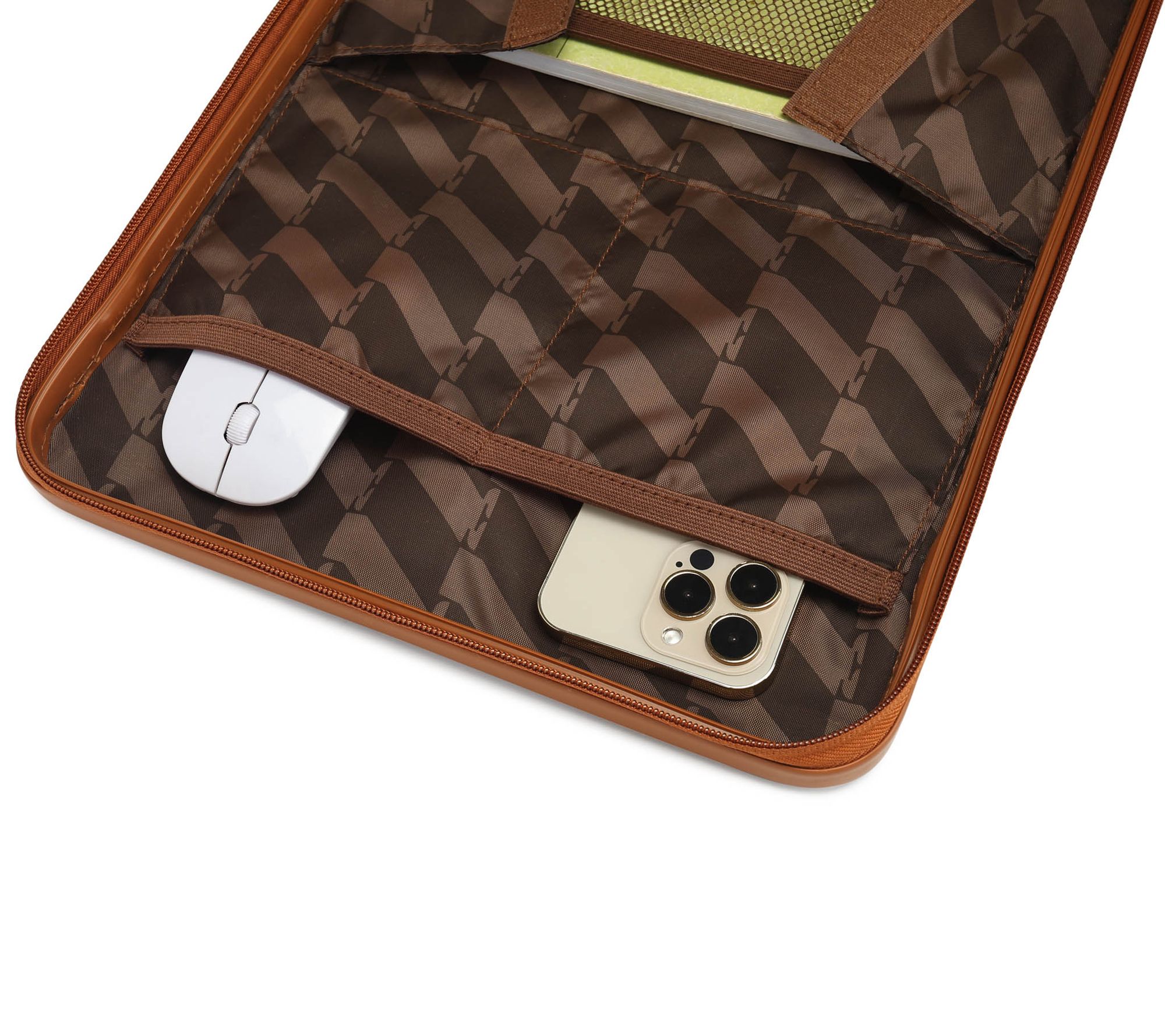 • Polyester lining; three mesh pockets, three lining pockets, removable spill-proof pocket, front laptop pocket