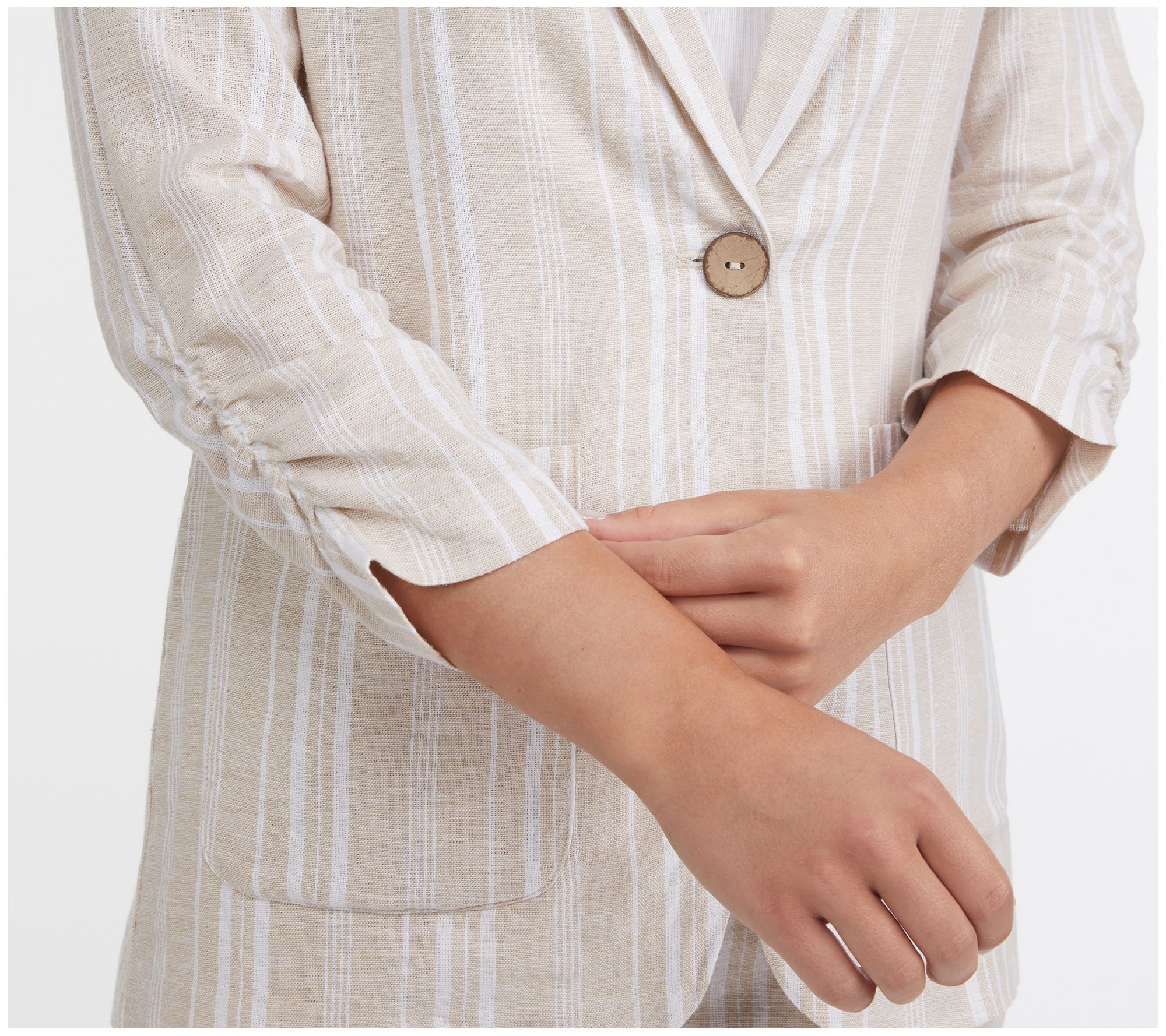 • Features: patch pockets, single button closure, lapel collar, shirred 3/4 sleeves