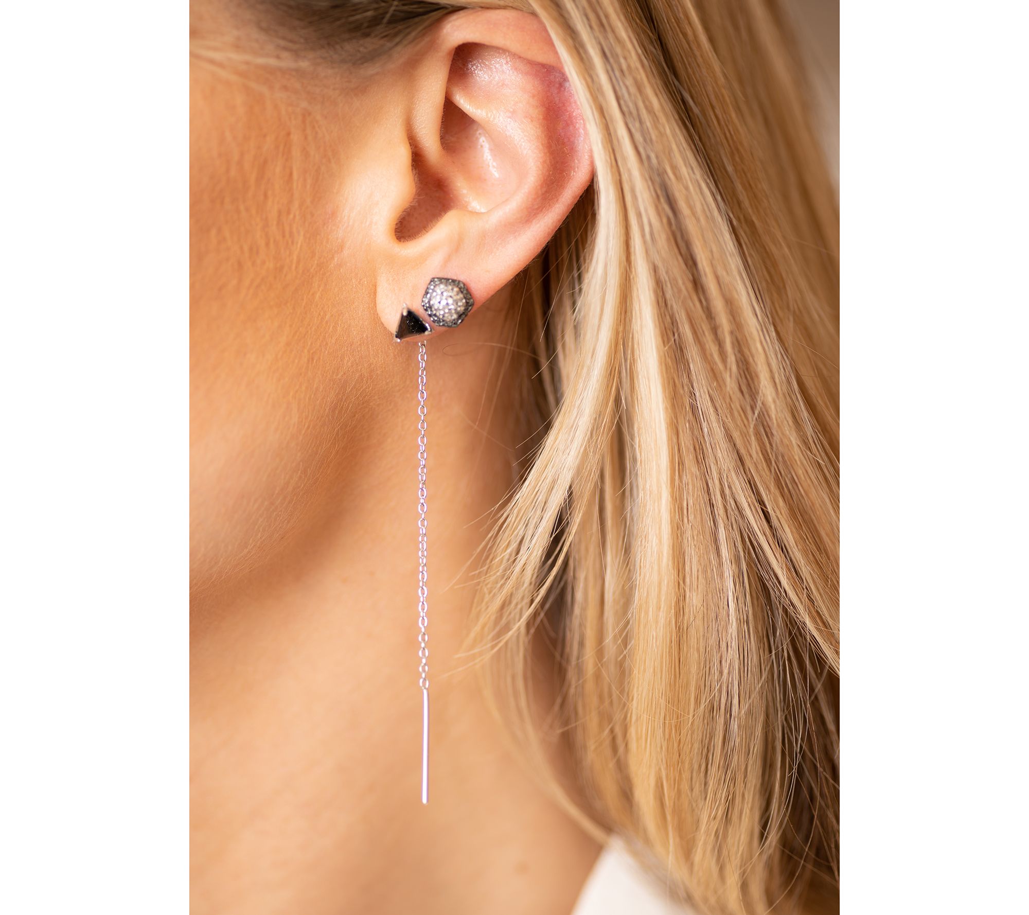 • Fancy-cut black agate threader earrings; setting attached to chain, making easy to pull through the ear comfortably
