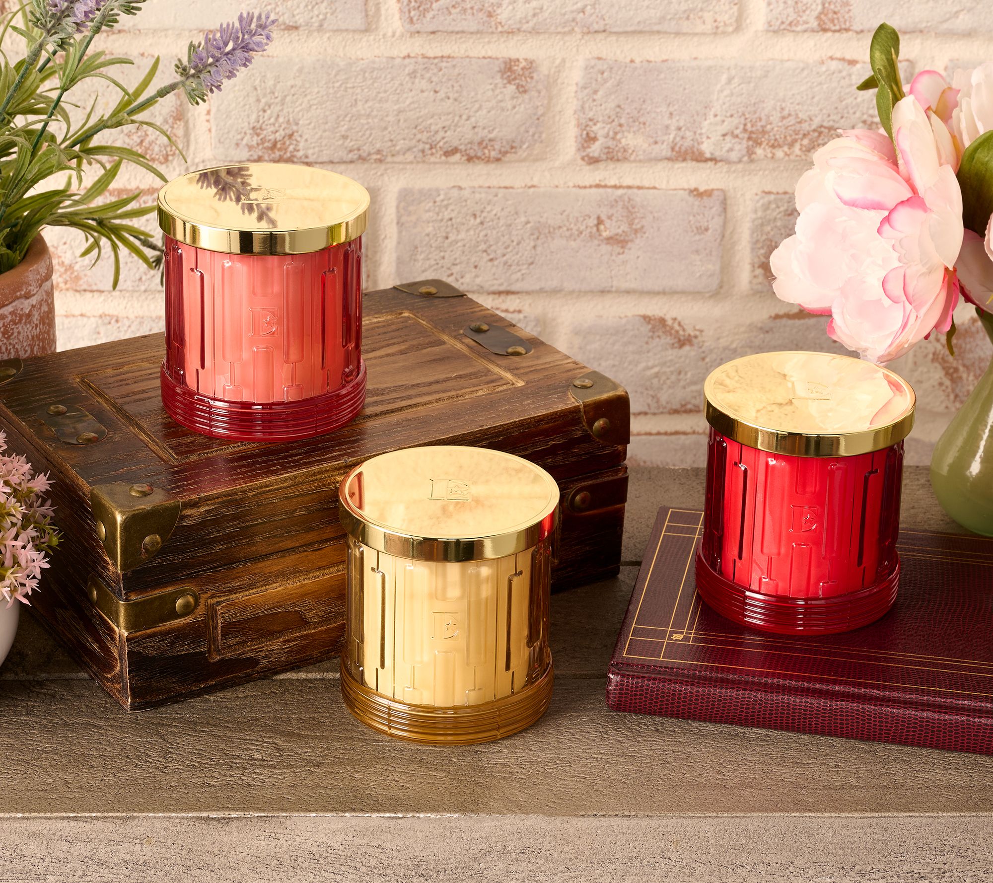 Includes three 8-oz candles: one each of English Rose and Ivy, Champagne Quince Jelly, and Rhubarb Strawberry Crumble