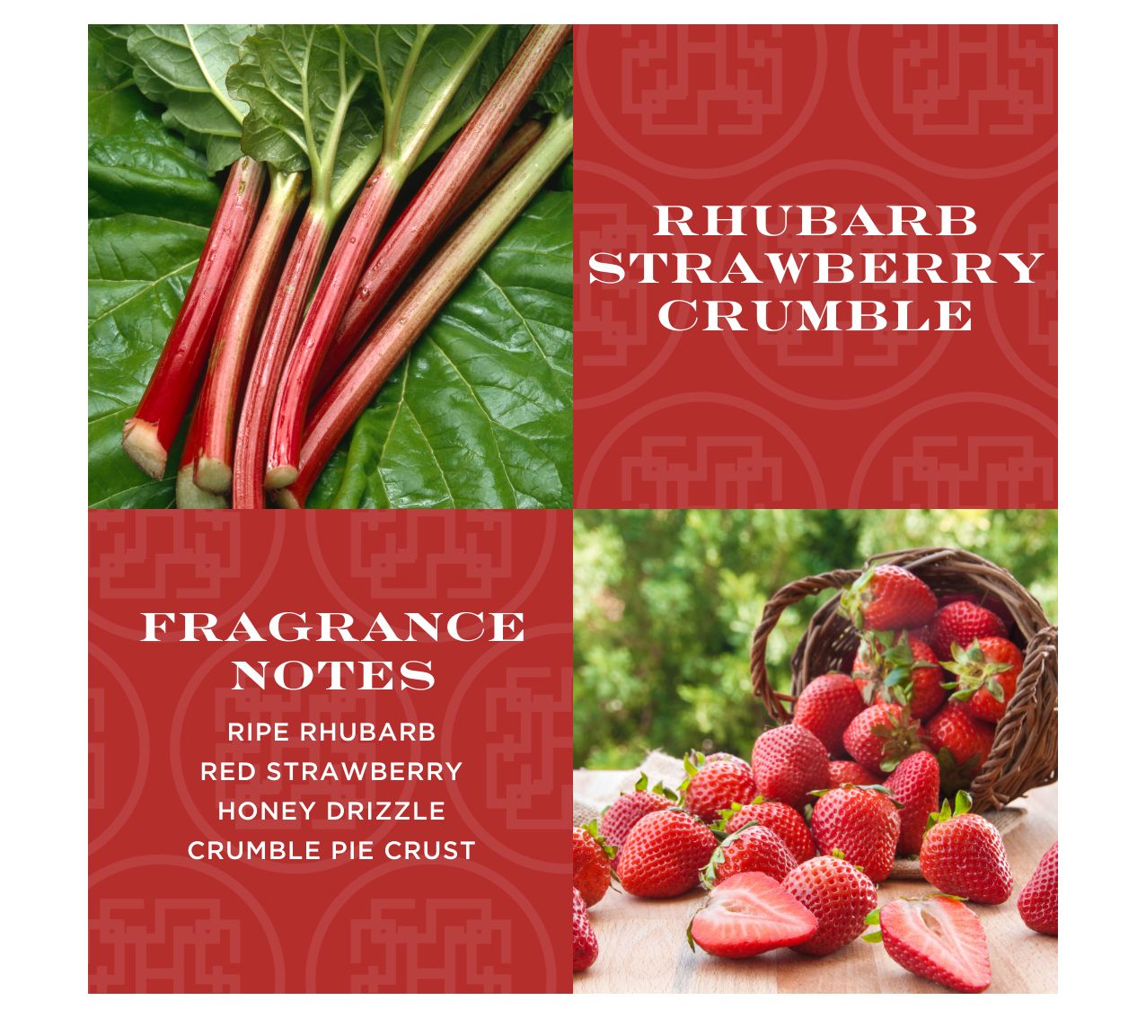 Freshly harvested from the Woodside gardens, ripe rhubarb and red strawberries are combined with a honey drizzle and baked in a crumble crust until hot and bubbly. Rhubarb Strawberry Crumble is a fragrance inspired by this truly delectable treat.