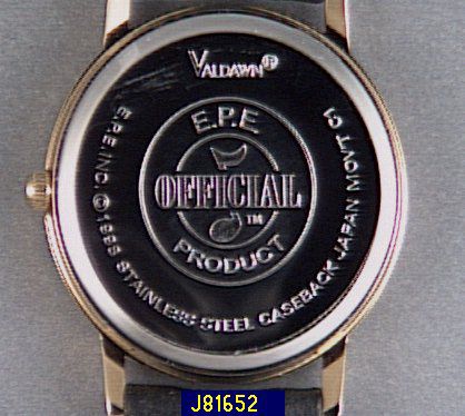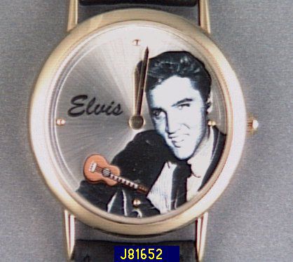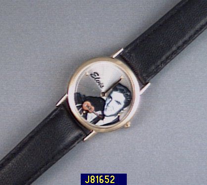 The king of rock and roll also tells time, according to this Elvis Presley watch. A black & white image of Elvis playing guitar decorates the face. There are golden finish hour markers at 3, 6, 9 & 12; hour and minute hands; and a rotating guitar playing second hand. A smart black leather band with buckle wraps this Japanese quartz timepiece around the wrist. It boasts a stainless steel back and arrives in a golden finish watch case. Band adjusts from 6-1/2"L to 8-1/4"L. Boxed. 2-yr LMW. Made in China.