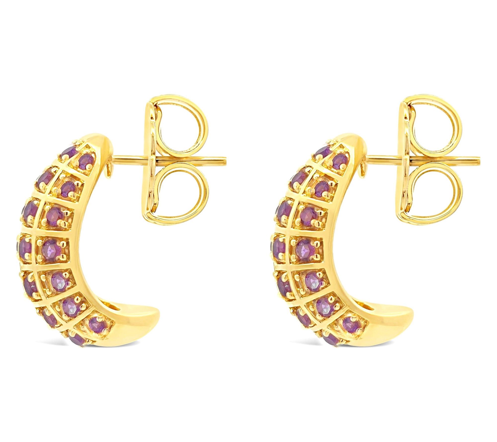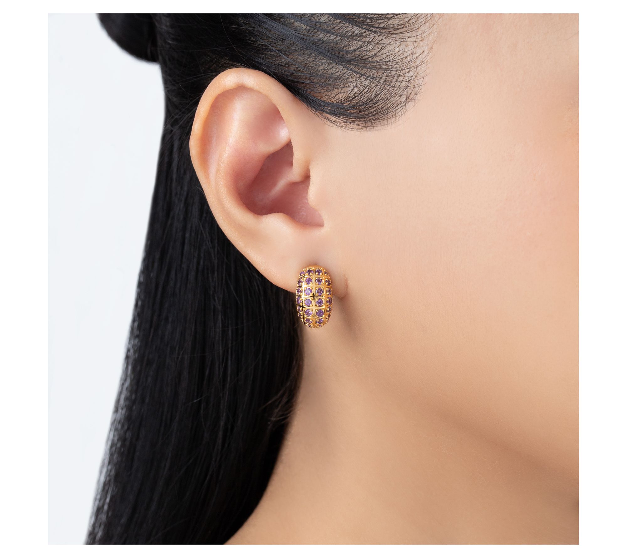 Heading into brunch or heading out for evening plans, these vibrant hoops deliver a splash of color and a fresh twist on classic style. The round amethyst stones, set in 14K yellow gold-clad sterling silver, shimmer with every move. Bring your favorite little black dress to life or add polish to your favorite jeans and blazer. From Elyse Ryan.